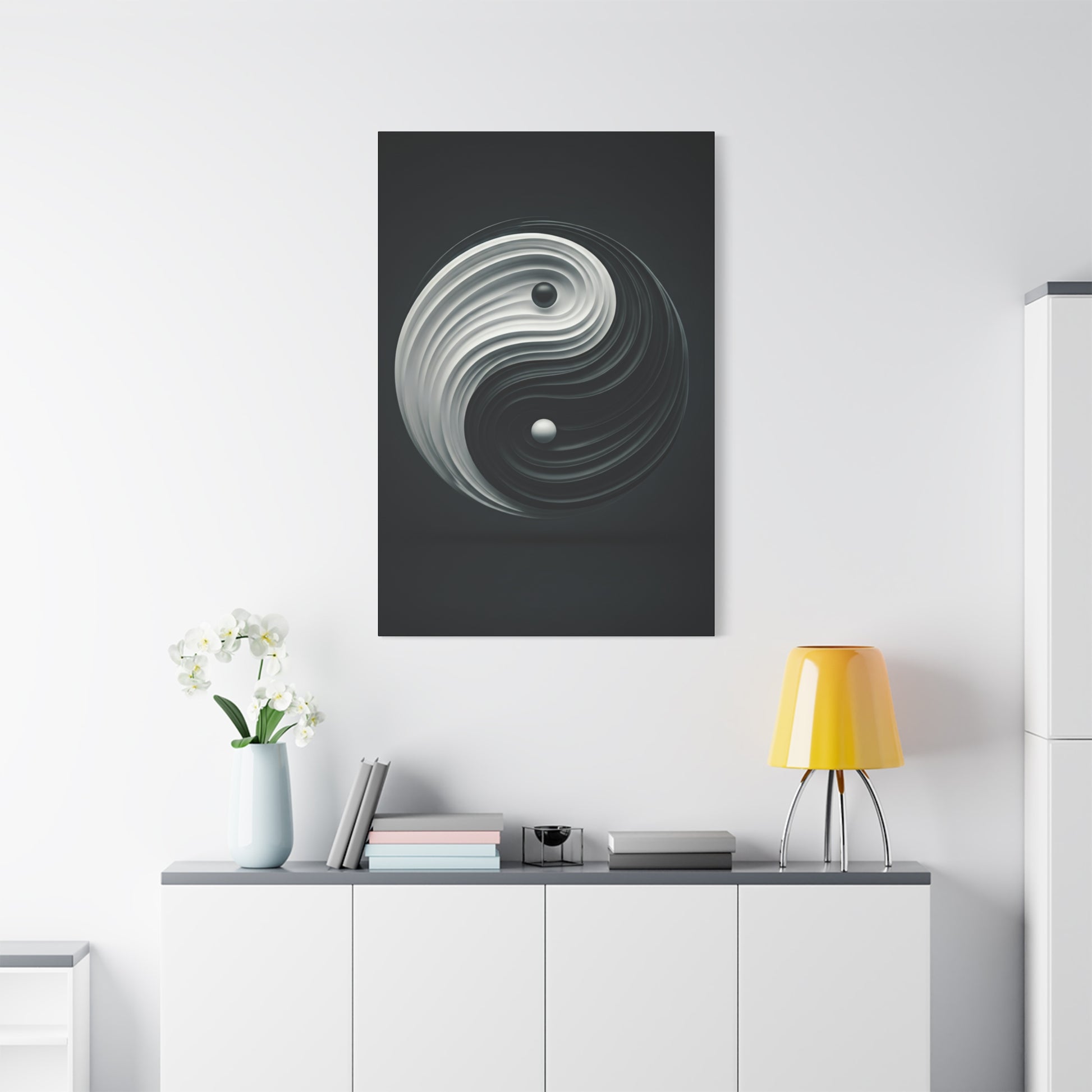 This striking wall art features a bold monochrome interpretation of the yin yang symbol, enhanced by circular motion and textured flow. The design emphasizes balance, energy, and duality while maintaining a modern and minimalist aesthetic. The strong contrast and fluid form create visual depth and movement, making it a captivating focal point for contemporary interiors. Ideal for meditation rooms, modern homes, or creative spaces, this canvas print brings clarity, calm, and symbolic meaning to any wall.