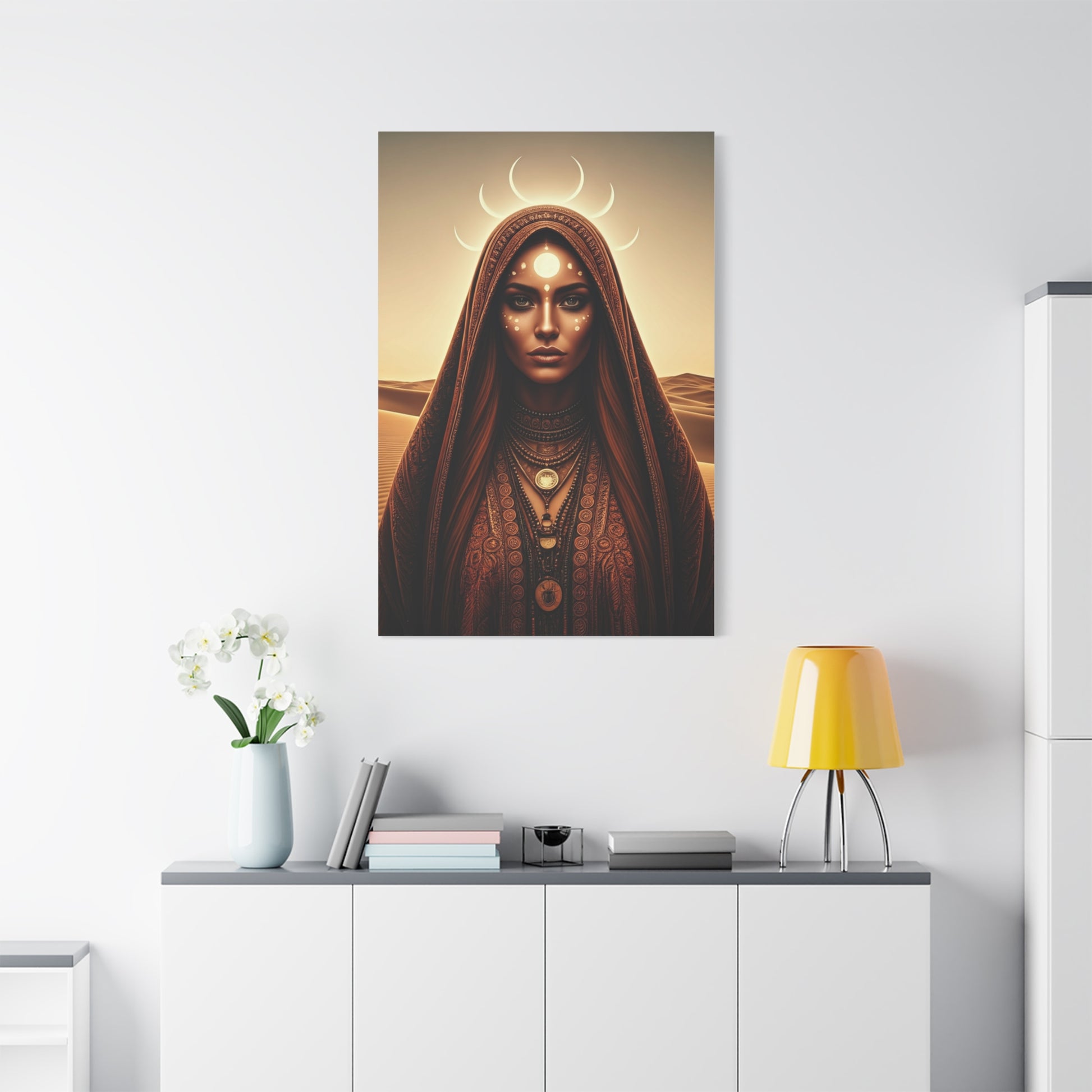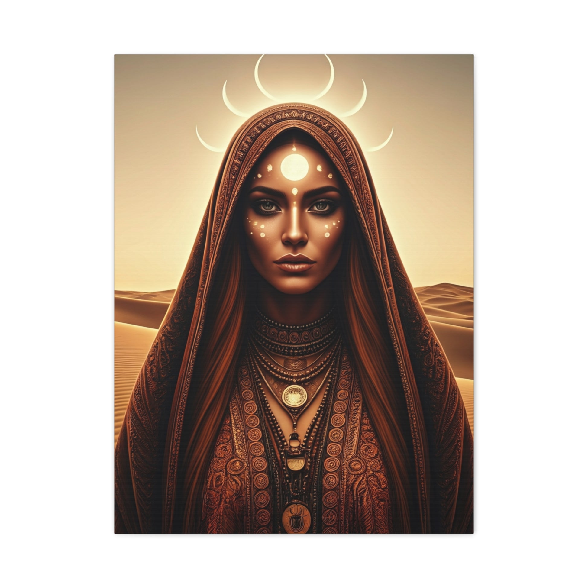 A serene feminine figure stands beneath celestial light, adorned with symbolic markings and crescent moons that represent intuition and cosmic balance. Earthy fabrics, intricate jewelry, and soft desert hues blend spirituality with bohemian elegance. The composition feels calm yet powerful, radiating feminine wisdom and connection to lunar energy. Perfect for meditation spaces, bedrooms, or artistic living areas, this piece invites reflection, harmony, and inner stillness.
