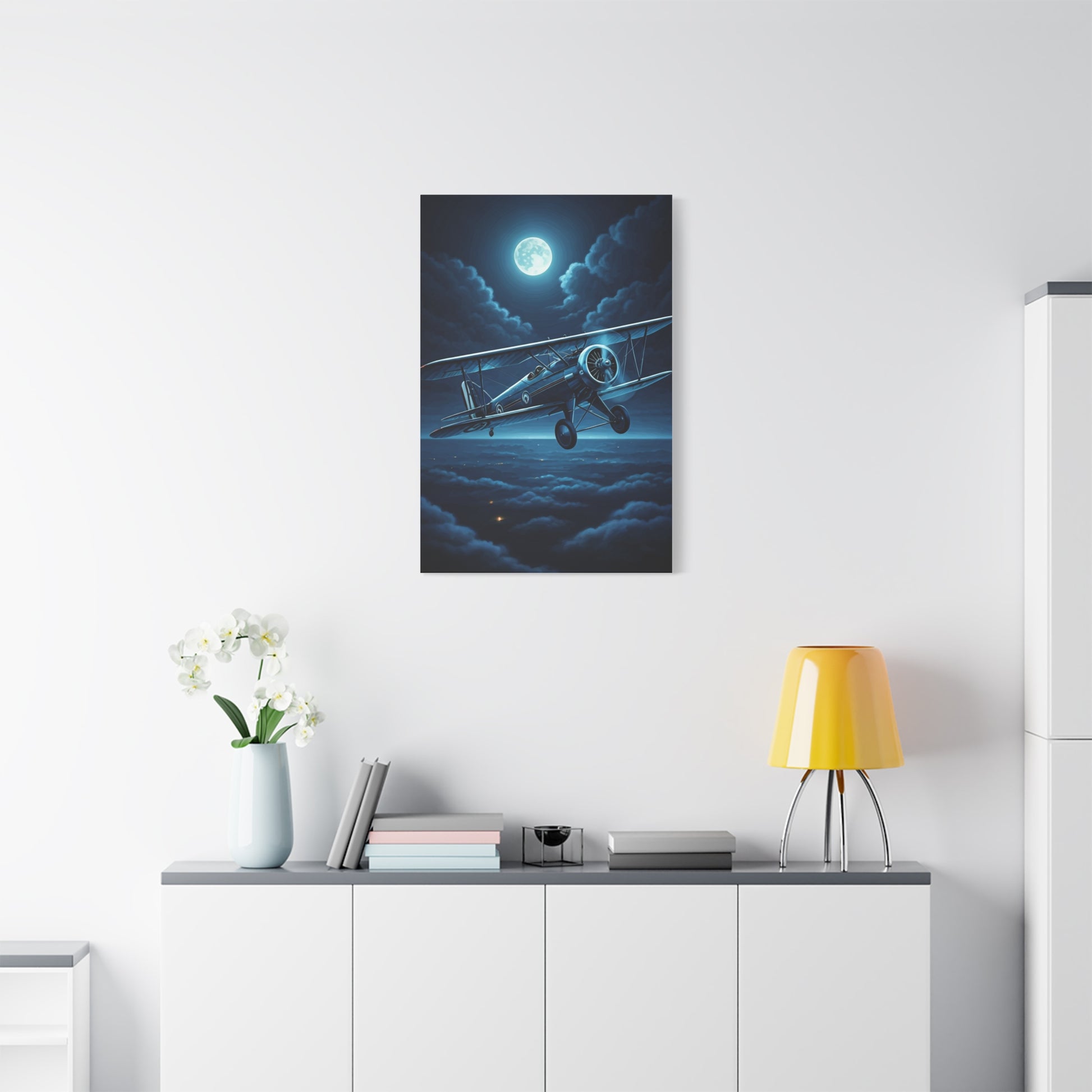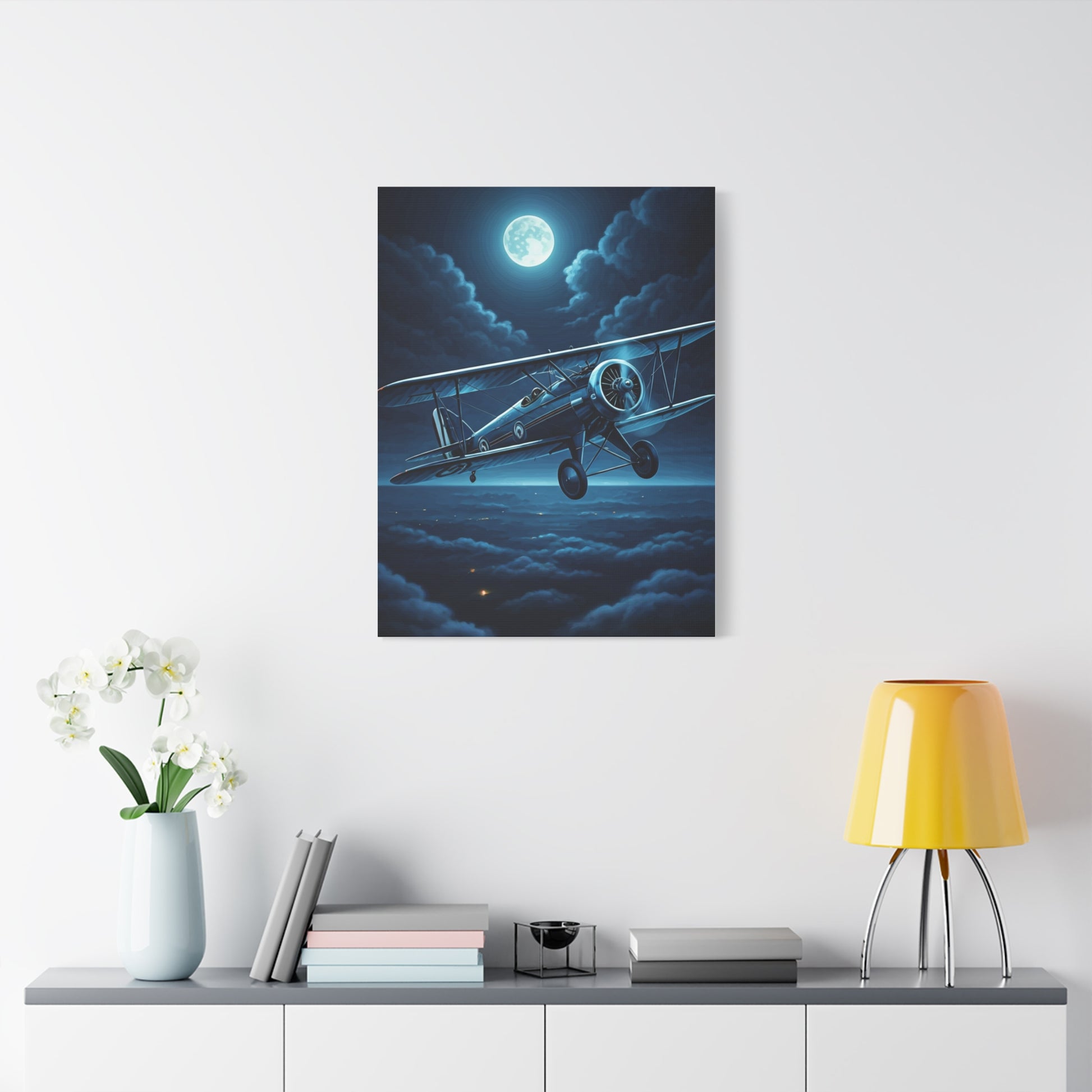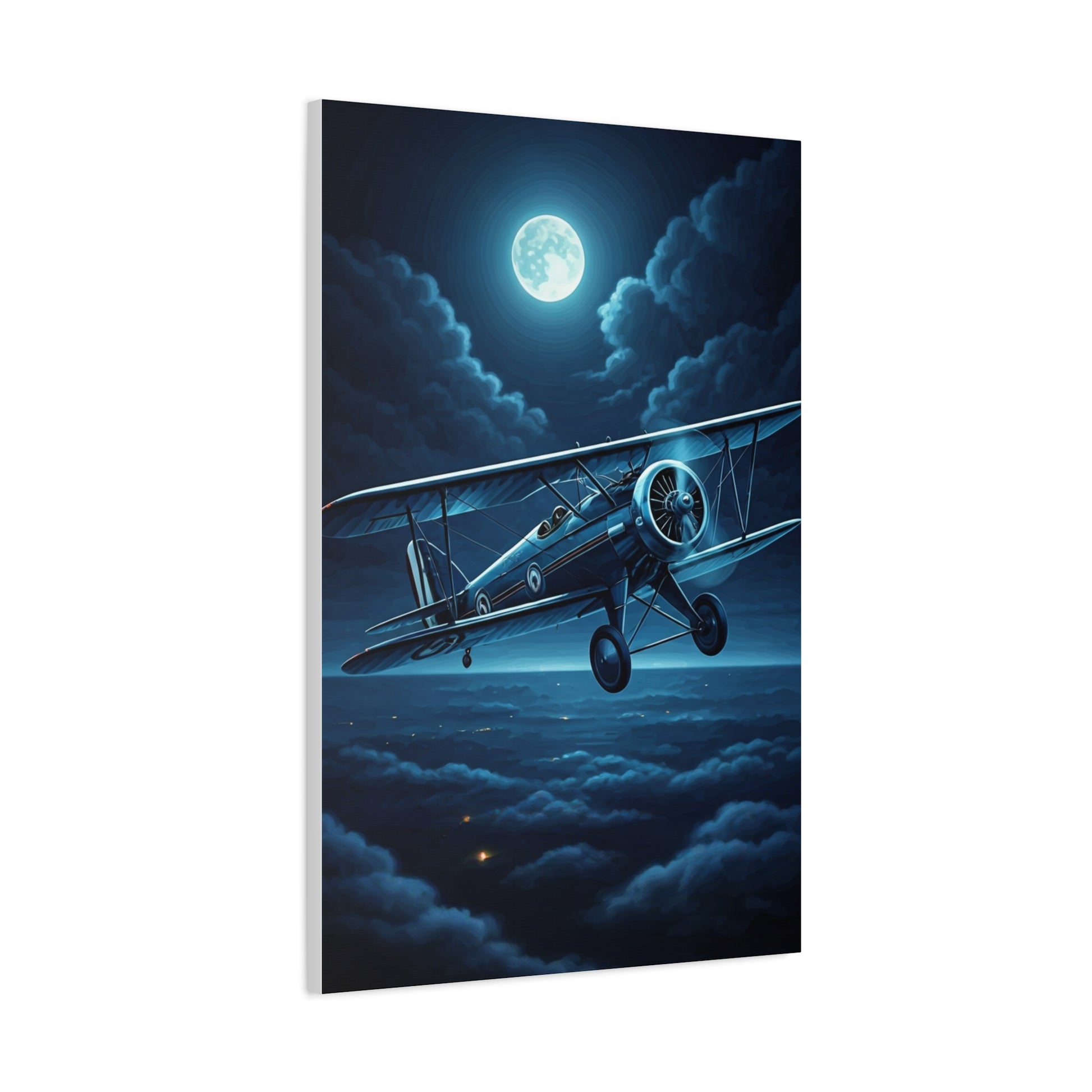 This enchanting aviation scene portrays a vintage aircraft flying beneath a bright full moon surrounded by deep blue night clouds. The cool tones and dreamlike lighting create a magical atmosphere of quiet adventure and nighttime exploration. Ideal for collectors of cinematic sky art, aviation enthusiasts, or moody modern interiors, this piece brings mystery, elegance, and wonder to any wall space.