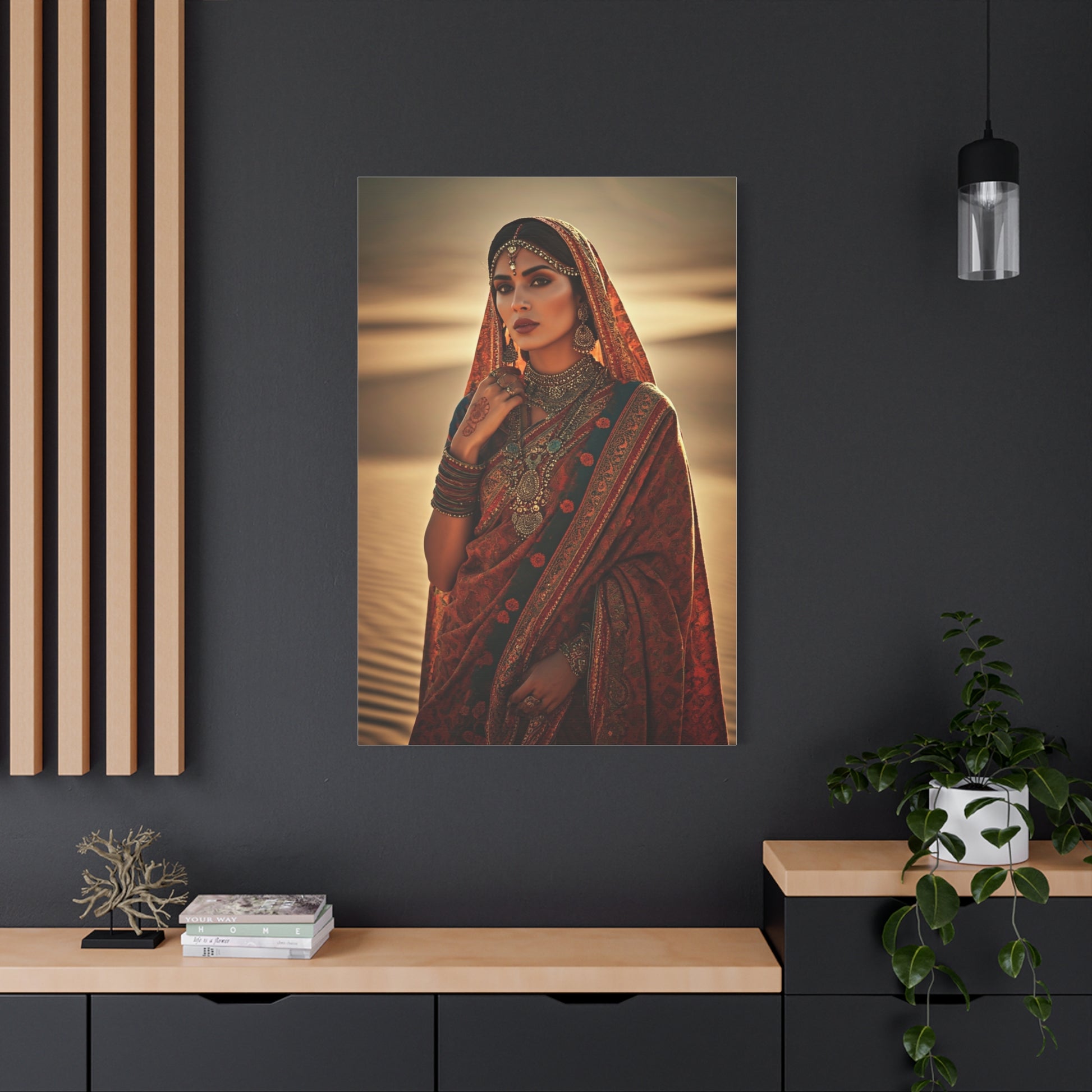 This elegant artwork showcases a woman dressed in richly detailed bohemian attire, layered with intricate jewelry and traditional patterns. The flowing fabrics and ornate embellishments reflect heritage, femininity, and ceremonial beauty. Warm desert light softens the scene, creating a romantic and cinematic atmosphere. Every detail—from bangles to textiles—adds visual richness and cultural depth. Ideal for bohemian, eclectic, or luxury interiors that celebrate tradition and artistry.