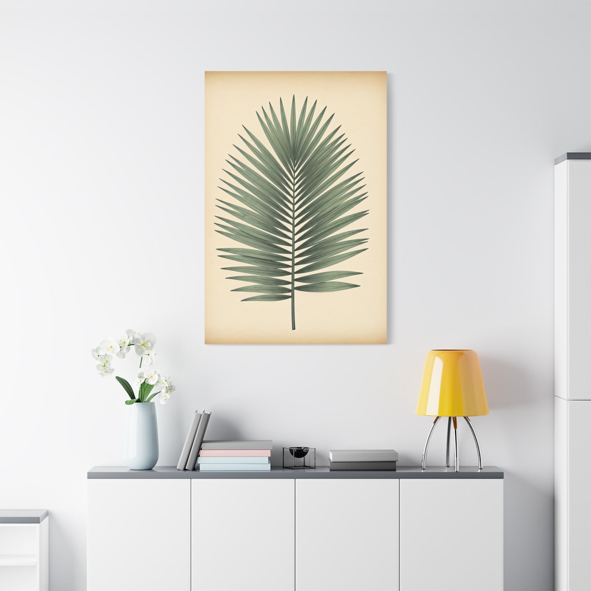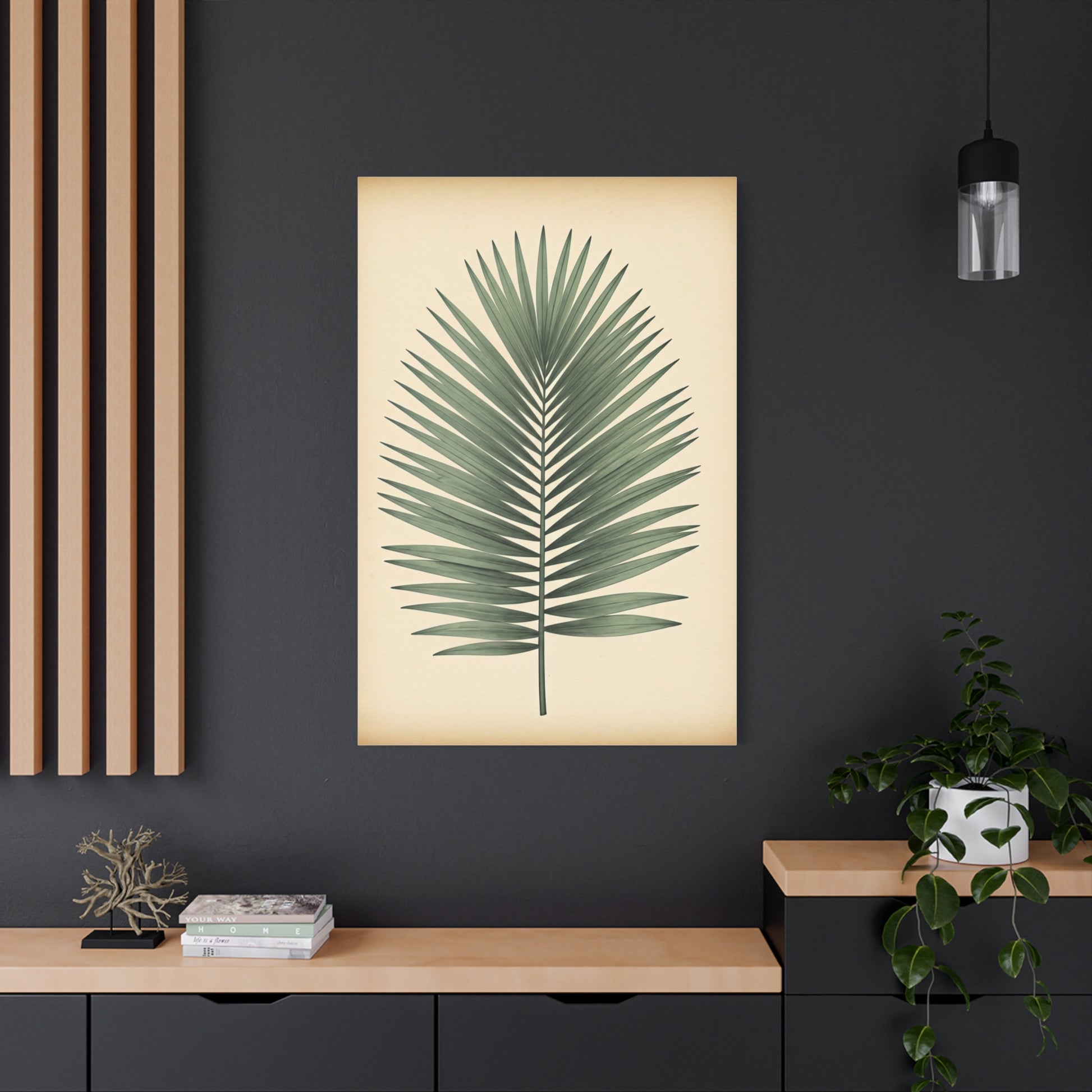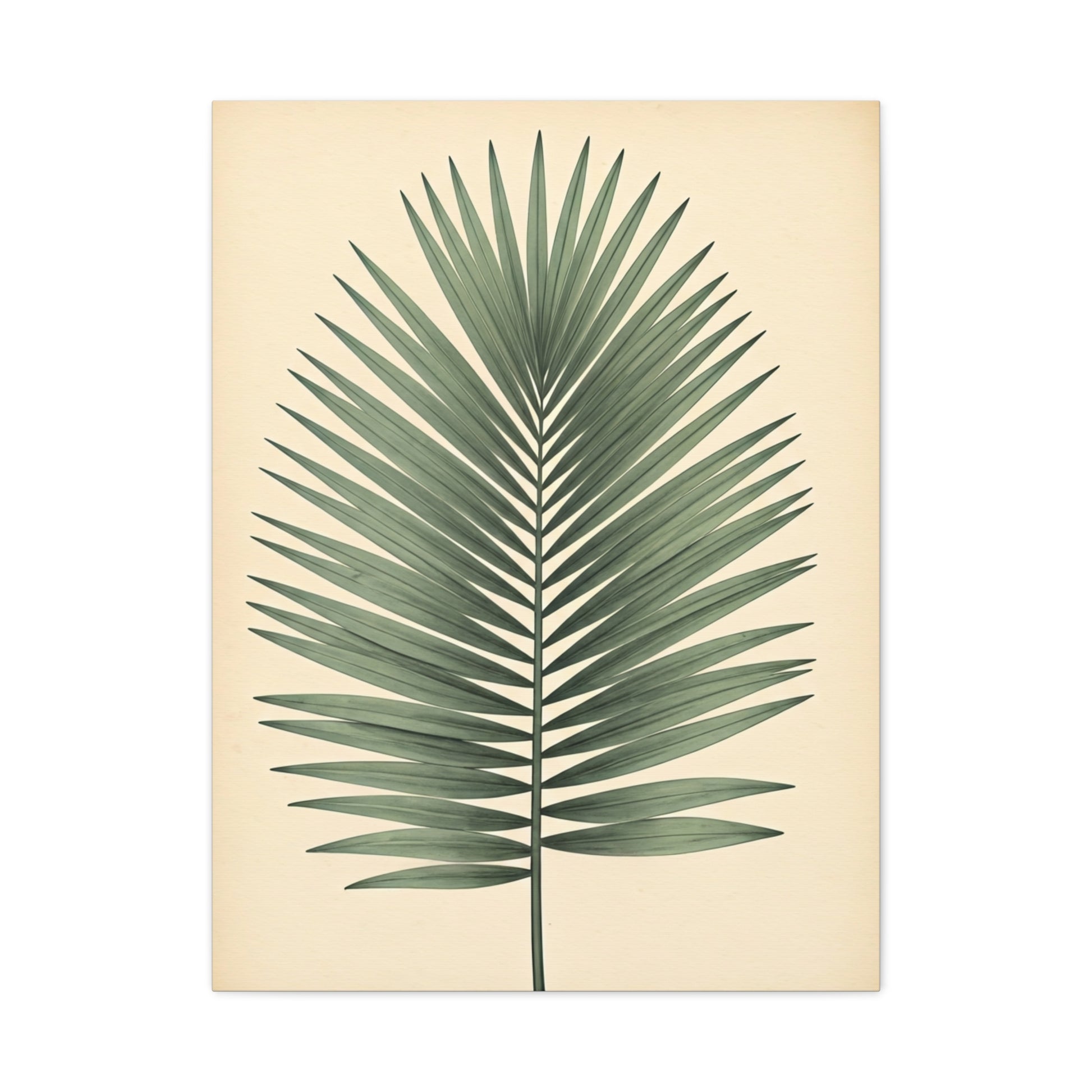 This minimalist palm leaf artwork highlights clean lines and balanced symmetry with understated botanical precision. Gentle shading and a neutral background allow the form of the leaf to stand out effortlessly. The design evokes calm, tropical warmth without overpowering the space. Ideal for modern, coastal, or bohemian interiors seeking a natural accent. A versatile piece that pairs beautifully with light, earthy décor.