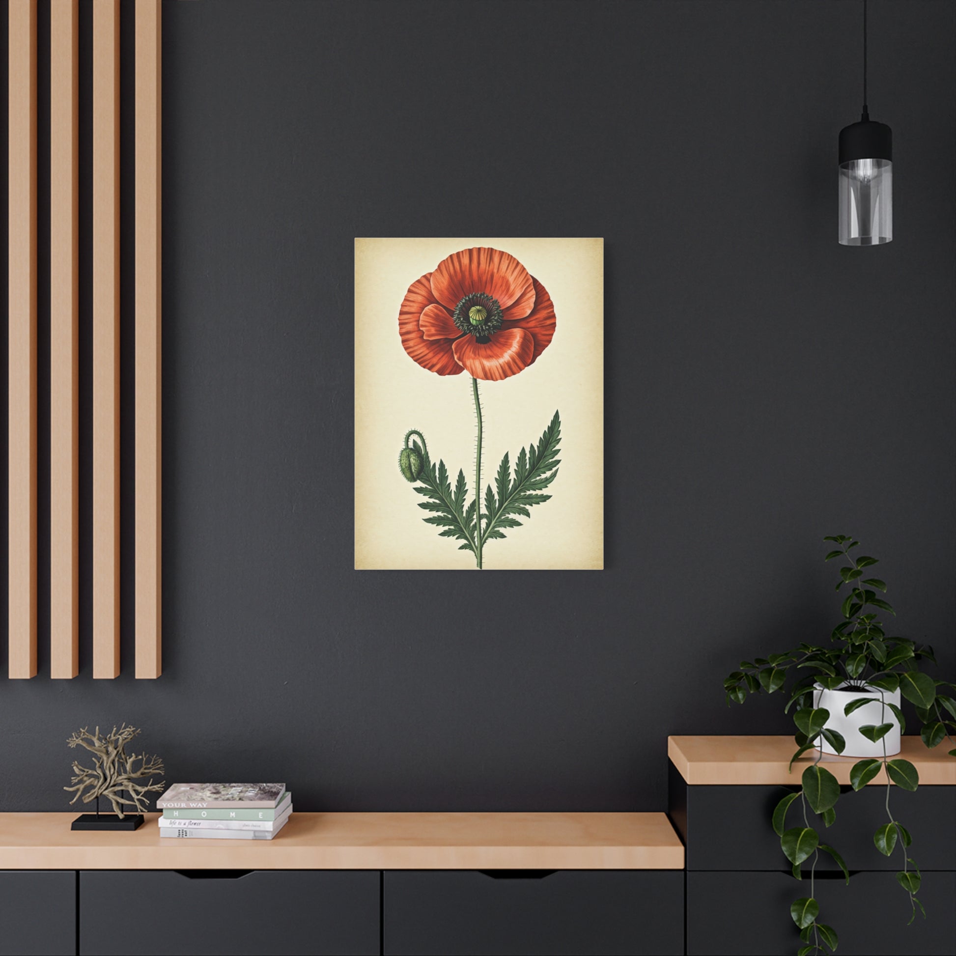 This vintage style poppy illustration captures the bold beauty of the flower in full bloom. Rich red tones contrast beautifully with fine line detailing and a classic field study composition. The textured background gives the artwork an old world botanical archive feel. Symbolizing remembrance and resilience, the poppy adds emotional depth to any interior. A striking yet elegant piece suited for both modern and traditional spaces.