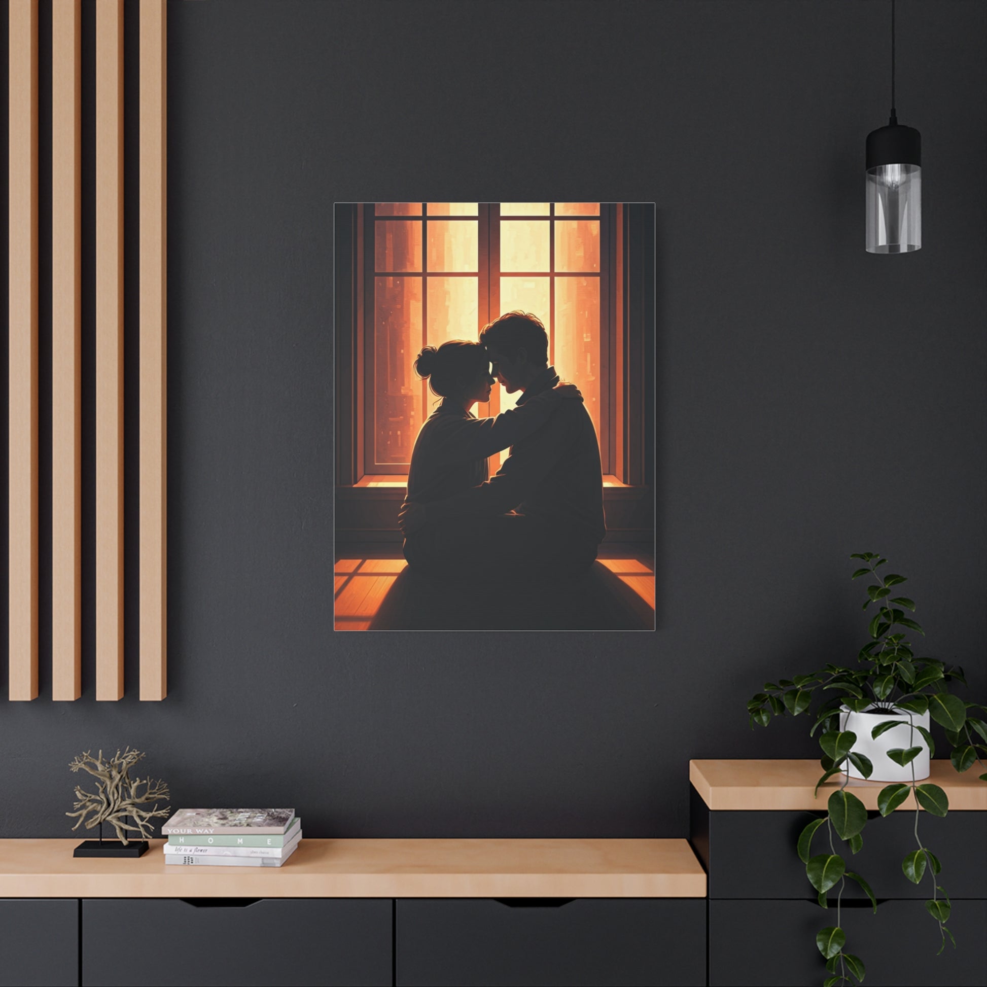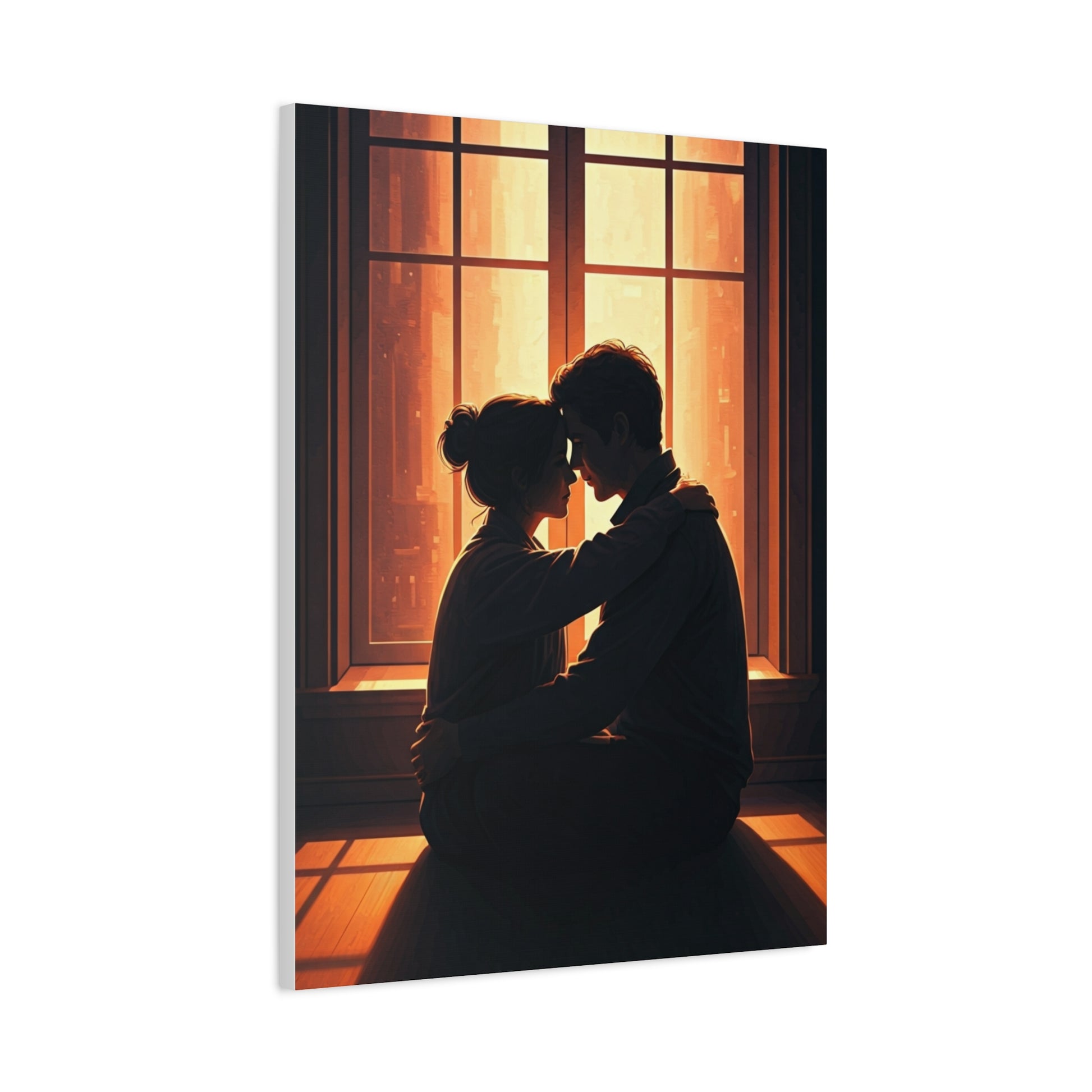 A softly lit embrace unfolds before a glowing window, capturing intimacy, comfort, and shared silence. The warm light outlines the figures while the background remains understated, allowing emotion to take center stage. This artwork brings a sense of warmth and emotional safety, perfect for romantic interiors, cozy living rooms, or serene bedroom décor.