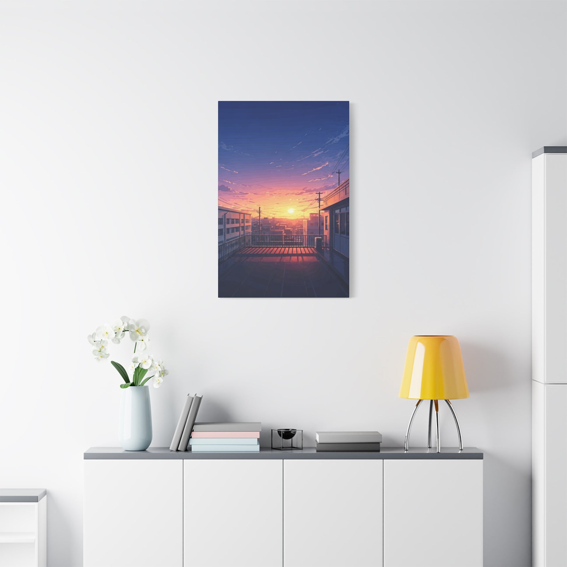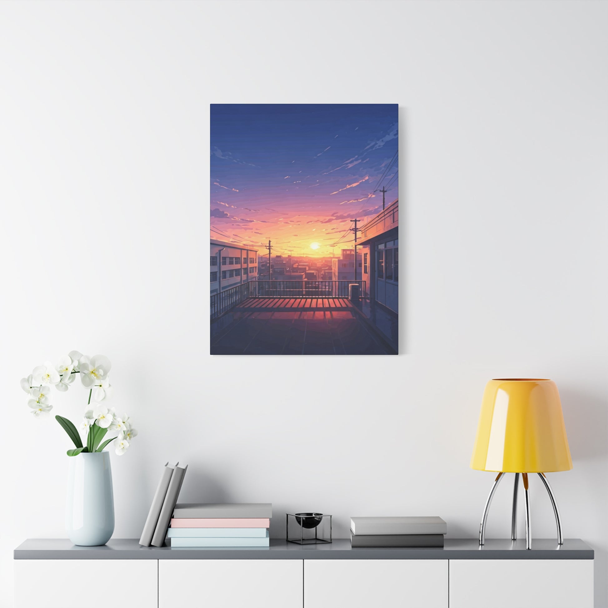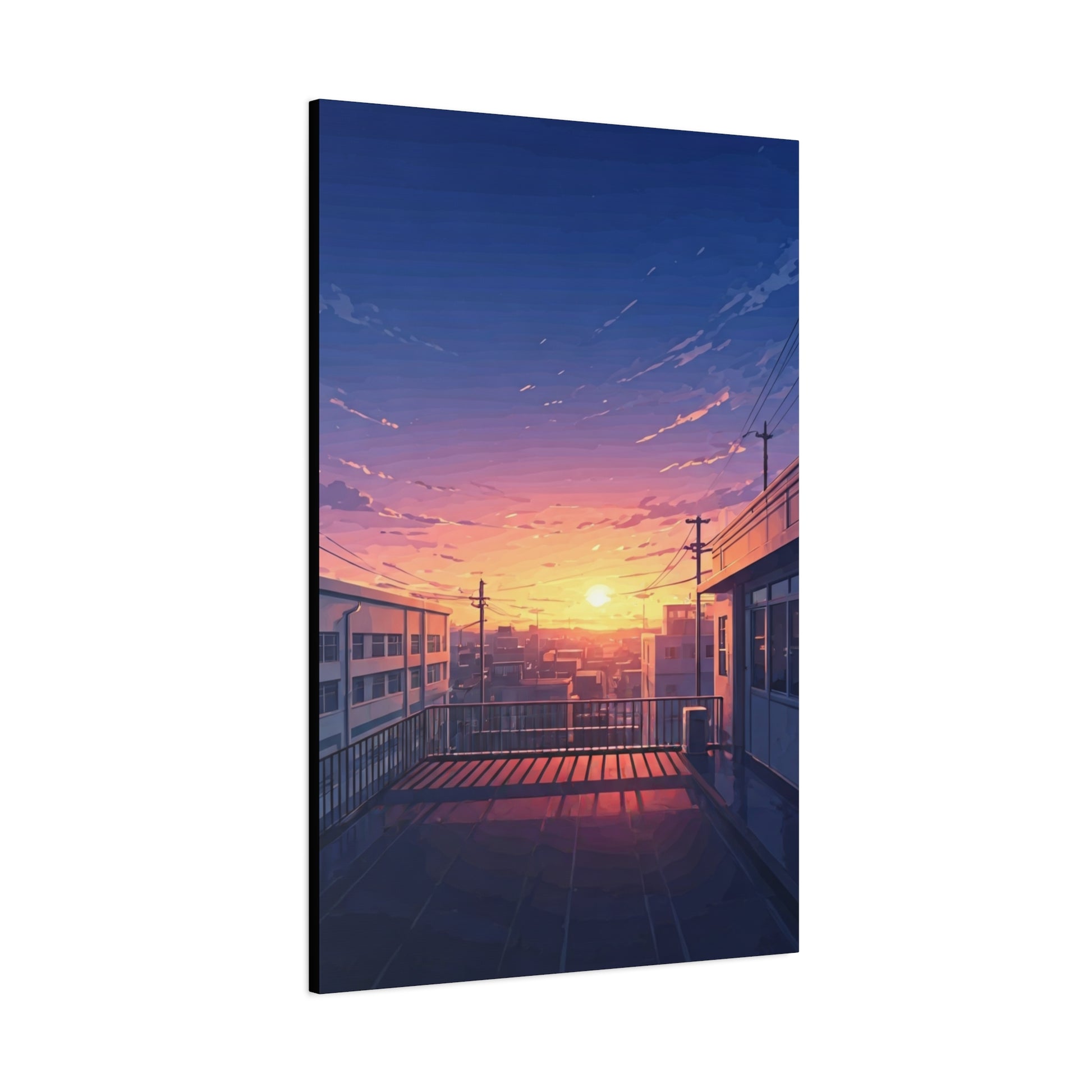 This peaceful artwork captures a quiet rooftop overlooking a city bathed in the warm glow of sunset. Soft pastel skies blend shades of blue, pink, and gold as the sun sinks between distant buildings, casting long reflections across the empty terrace. Power lines, rooftops, and subtle city details create a sense of everyday life frozen in a tranquil moment. The scene evokes nostalgia, stillness, and gentle introspection—perfect for those who appreciate anime-inspired cityscapes and calm urban moods. Ideal for bedrooms, living spaces, study areas, or creative studios, this piece brings a soothing, reflective atmosphere that encourages relaxation and quiet thought.