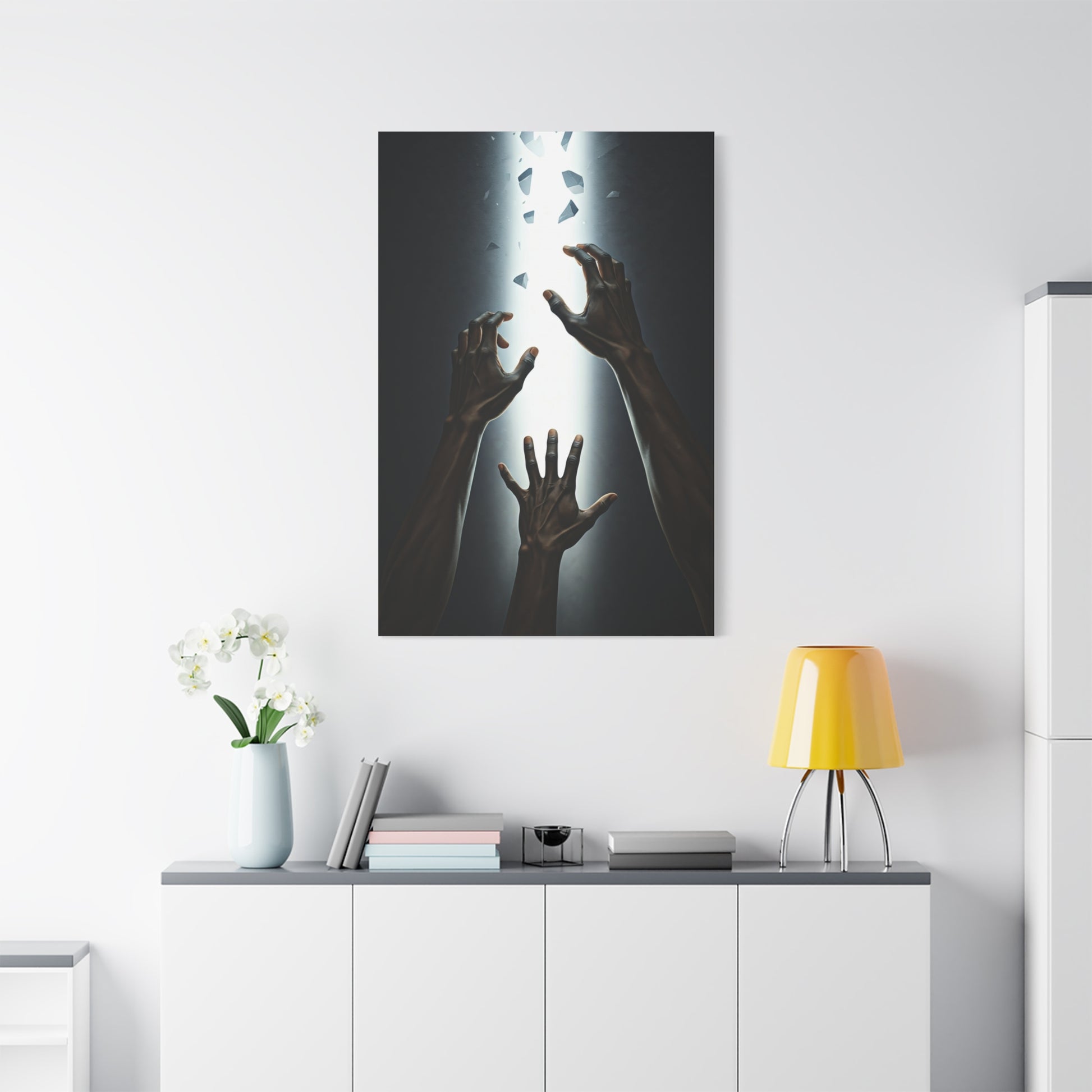 This powerful cinematic artwork captures a moment of transcendence as a lone figure stands with arms wide open before an immense burst of golden light. Radiating from the horizon like a spiritual sunrise, the dramatic sky is filled with sweeping amber clouds that stretch outward in magnificent symmetry, creating an atmosphere of surrender, renewal, and limitless possibility. The silhouetted form anchors the composition with strength and vulnerability, evoking themes of rebirth and inner awakening. Warm tones of fire and sunlight contrast beautifully against deep shadow, producing a striking visual balance between darkness and illumination. Ideal for contemporary interiors, meditation spaces, or statement walls, this piece brings emotional depth and inspiring presence into living rooms, offices, or personal sanctuaries.
