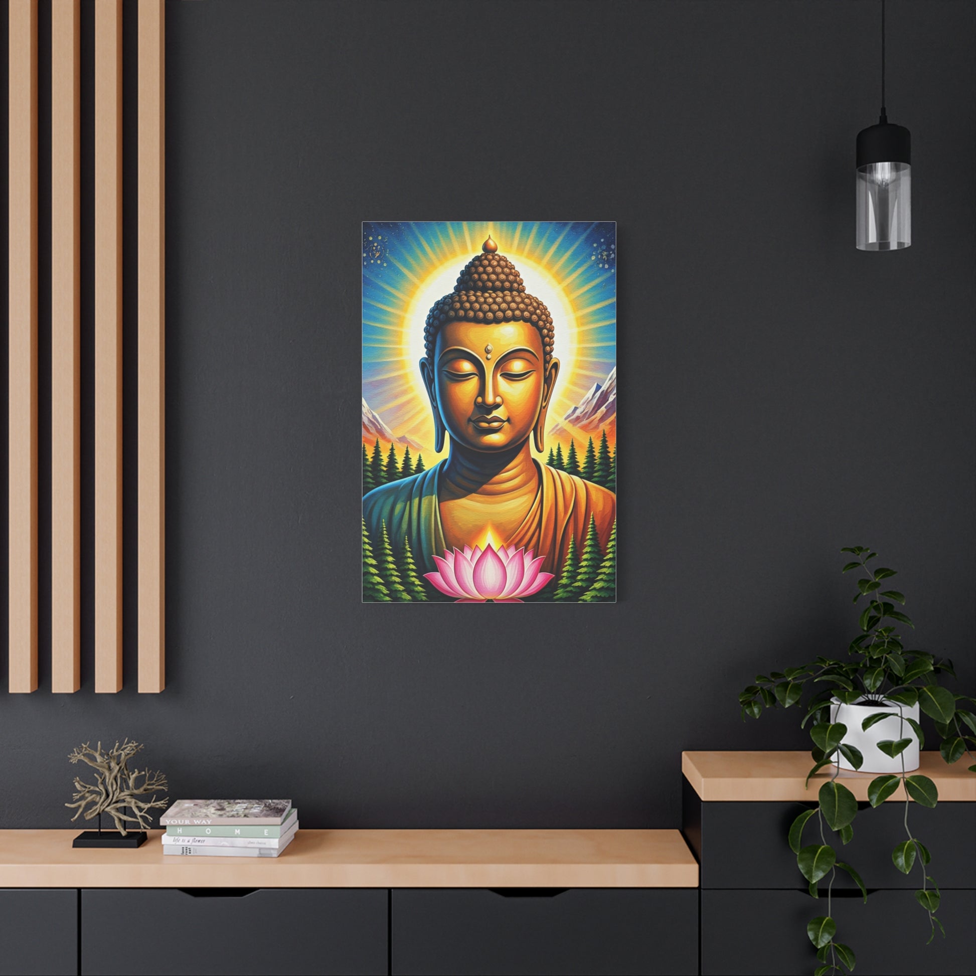 A luminous Buddha portrait framed by nature and vibrant lotus blossoms, symbolizing purity, renewal, and enlightenment. The warm golden figure contrasts beautifully with surrounding greenery and soft pastel tones, creating a peaceful yet uplifting atmosphere. Ideal for wellness-inspired interiors, this artwork promotes calmness, balance, and spiritual connection.