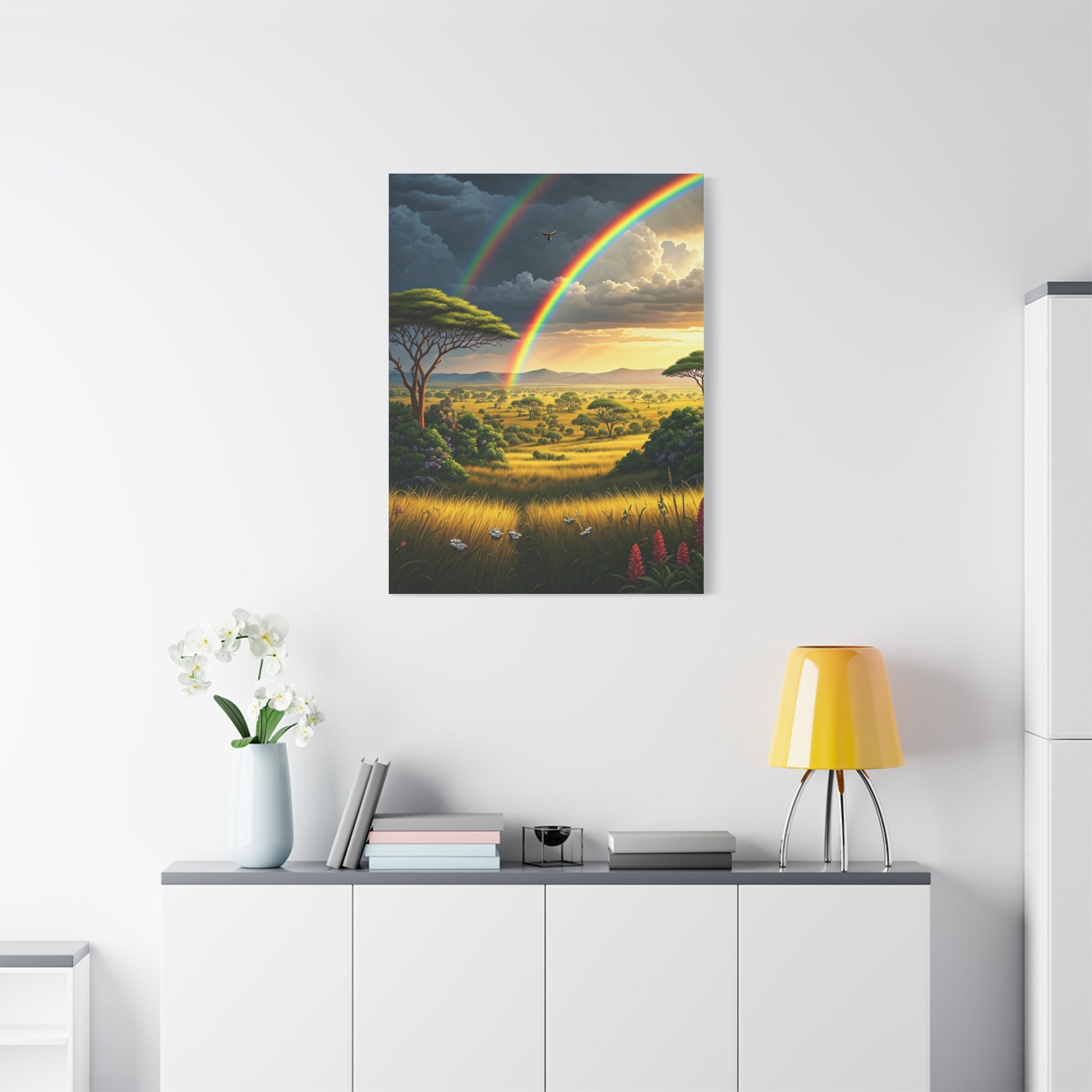 This breathtaking landscape artwork showcases a vibrant rainbow stretching across the open savannah beneath stormy skies and warm sunlight. The contrast of dramatic weather and radiant color symbolizes hope, renewal, and natural wonder. Perfect for uplifting interiors, nature-inspired spaces, or anyone who loves the magic of African horizons