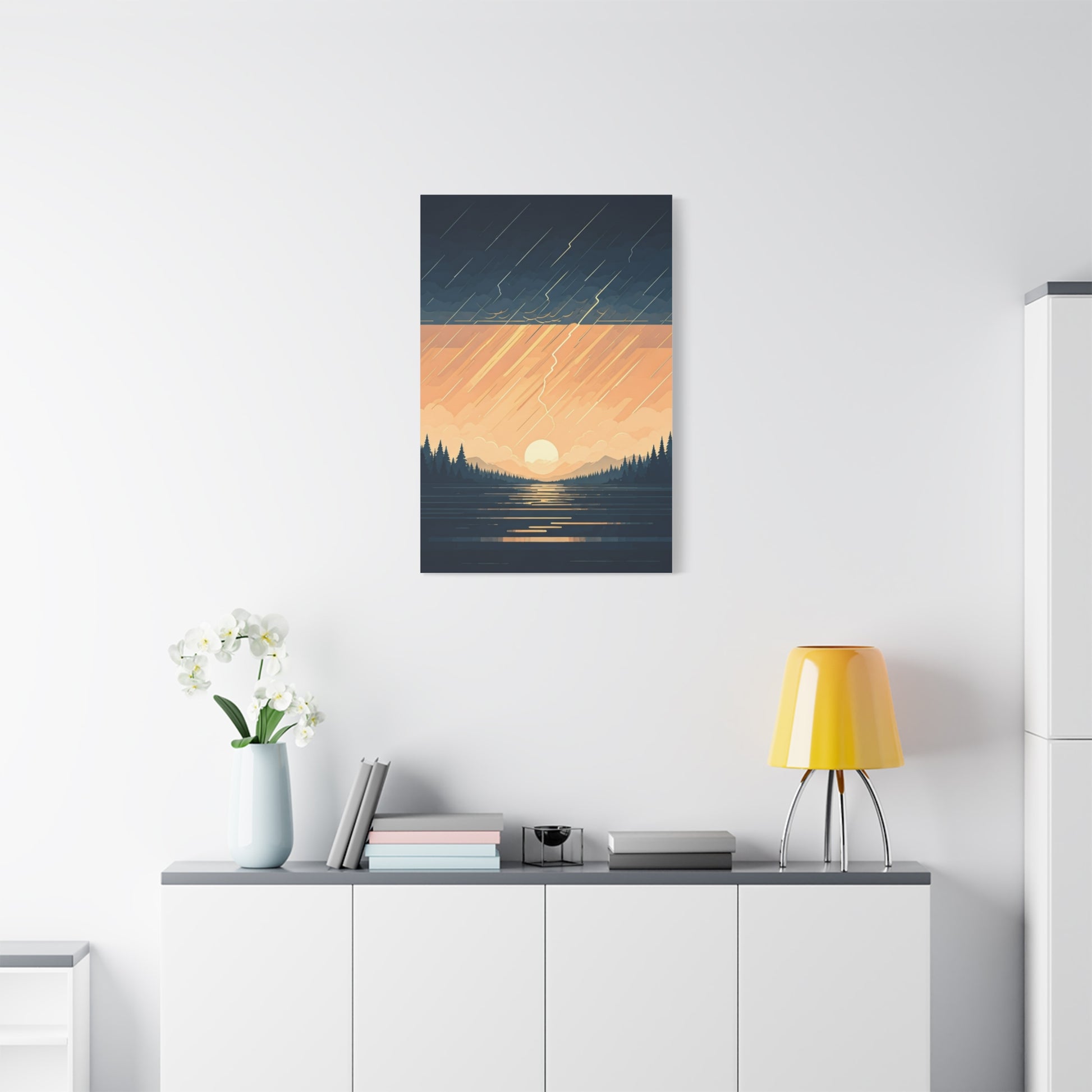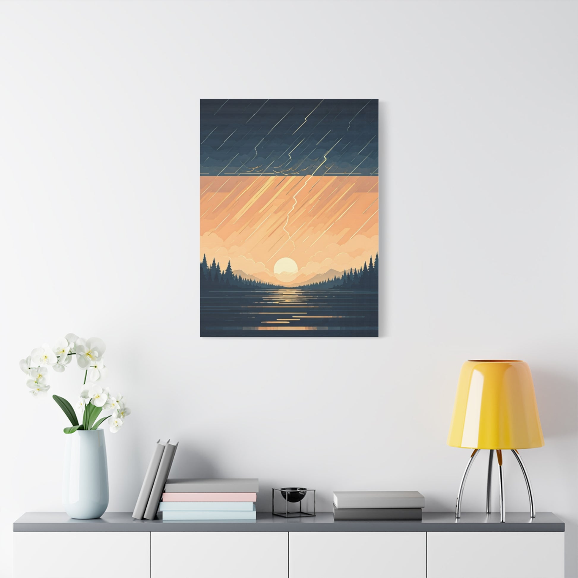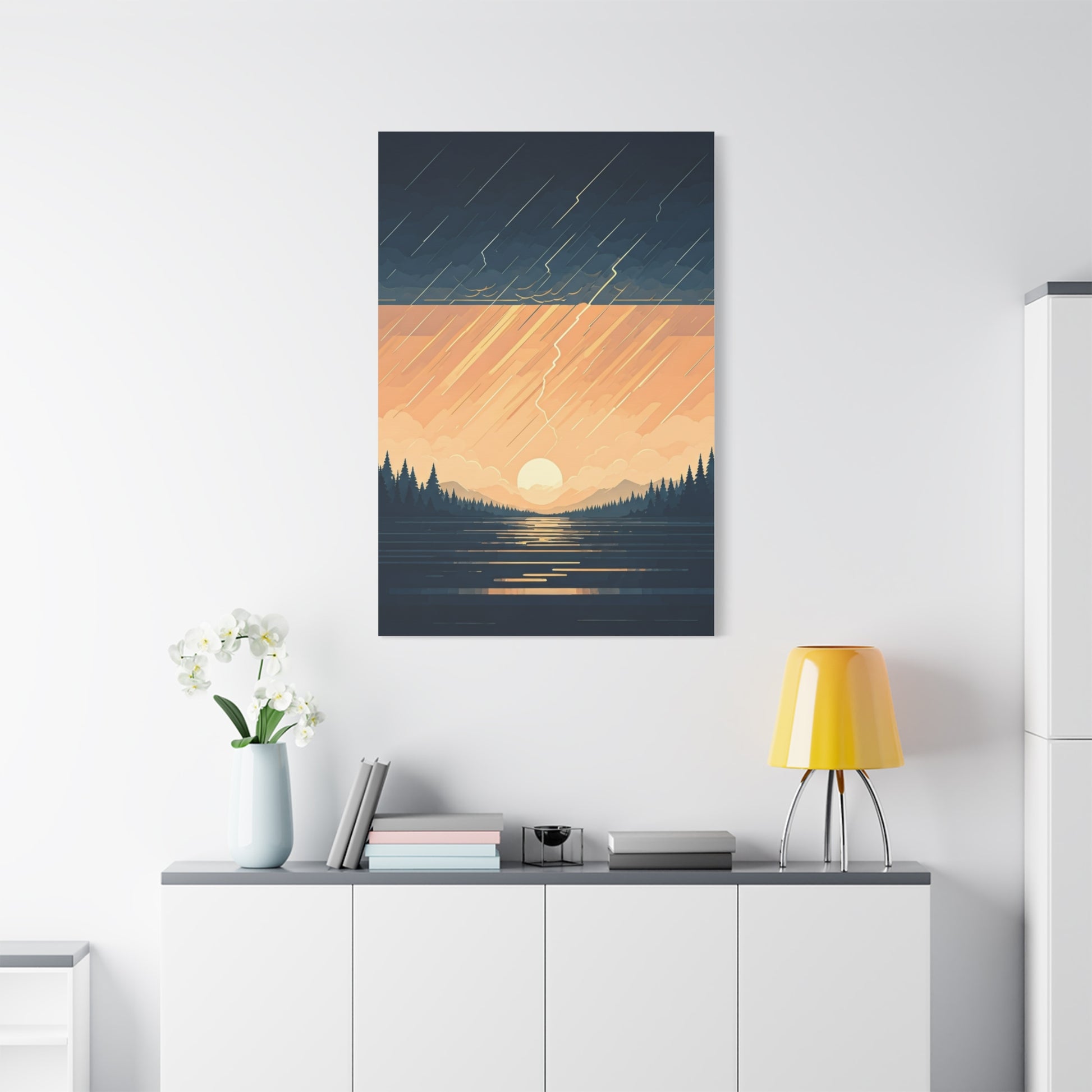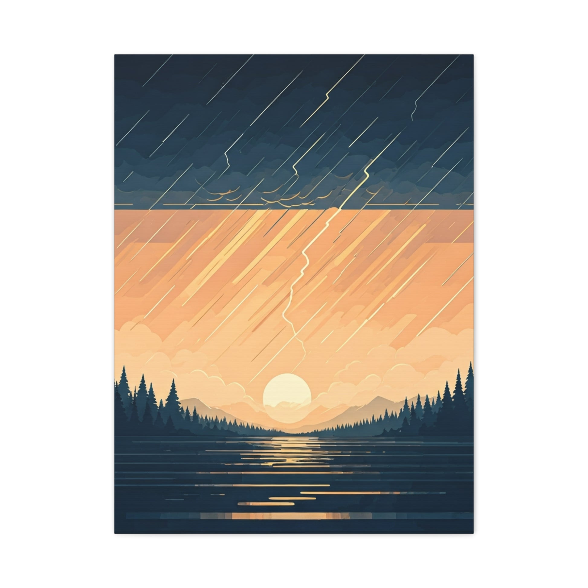 Rainfall at Dusk blends gentle rain with a glowing sunset, creating a cinematic contrast between warmth and melancholy. The layered sky and reflective water evoke reflection, transition, and quiet emotion. A perfect piece for living rooms, bedrooms, or creative spaces that embrace atmosphere and storytelling.