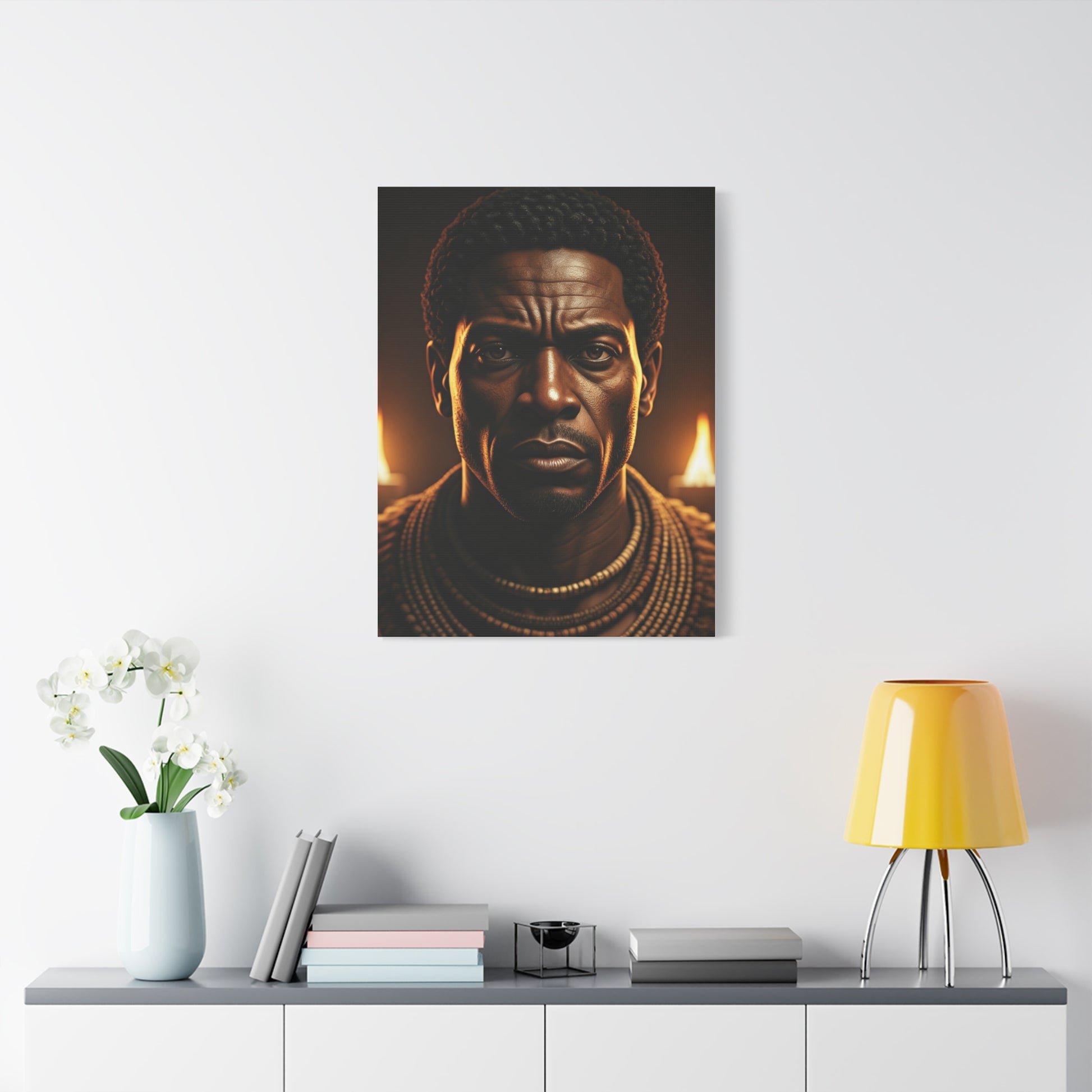 Bold, intense, and deeply powerful, this striking portrait captures the commanding presence of an African warrior king illuminated by dramatic golden firelight. With piercing eyes, rich bronze tones, and layers of traditional beaded adornment, the artwork radiates strength, leadership, and timeless heritage. The warm glow in the background enhances the mood of resilience and royalty, making this piece feel both cinematic and culturally profound. Perfect for modern luxury interiors, Afrocentric décor collections, or anyone seeking a statement artwork that celebrates pride, ancestry, and masculine power. This canvas print brings an unforgettable aura of royalty and courage into any space.