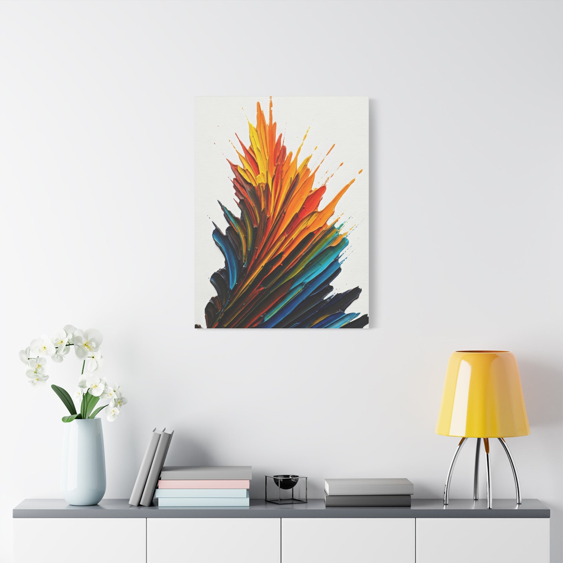 Rising Ember Flame features upward-reaching strokes of fiery orange, gold, and deep blue layered in a flame-like composition. The artwork conveys growth, energy, and resilience, making it a powerful accent piece for modern homes, creative studios, and statement décor.