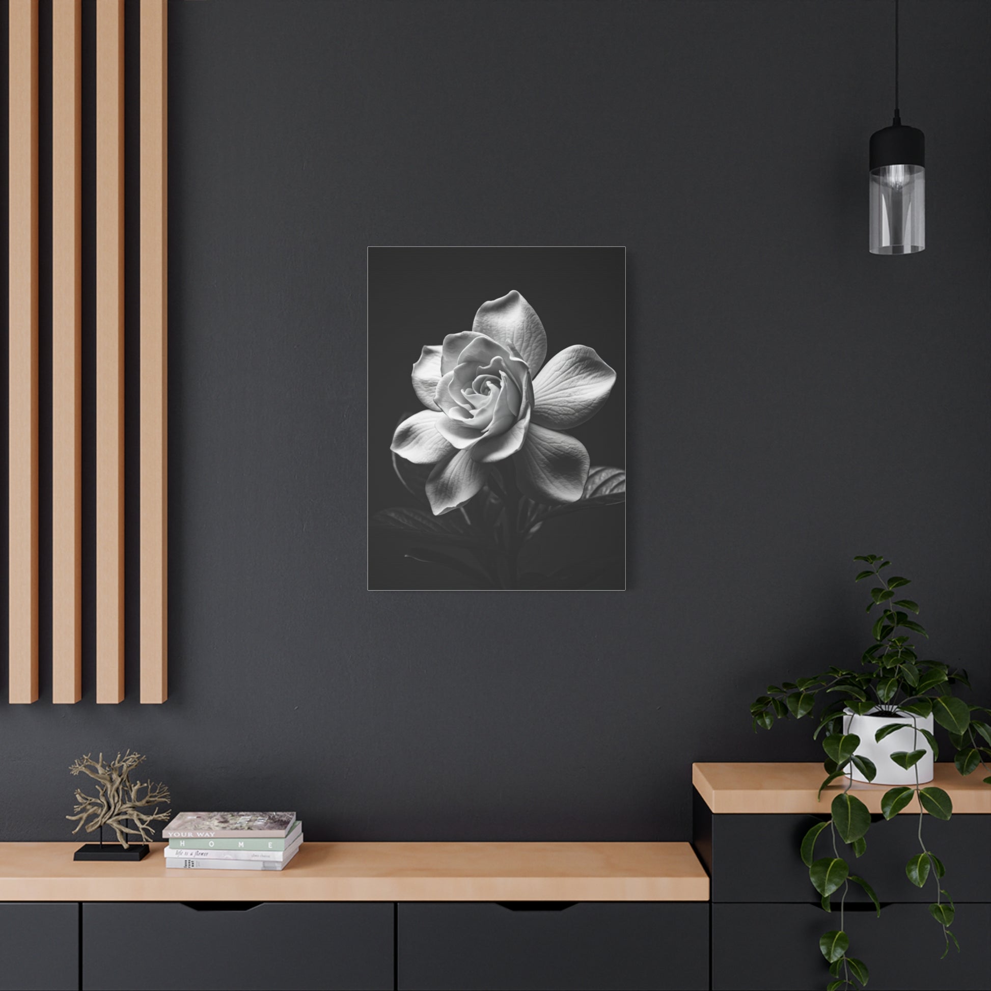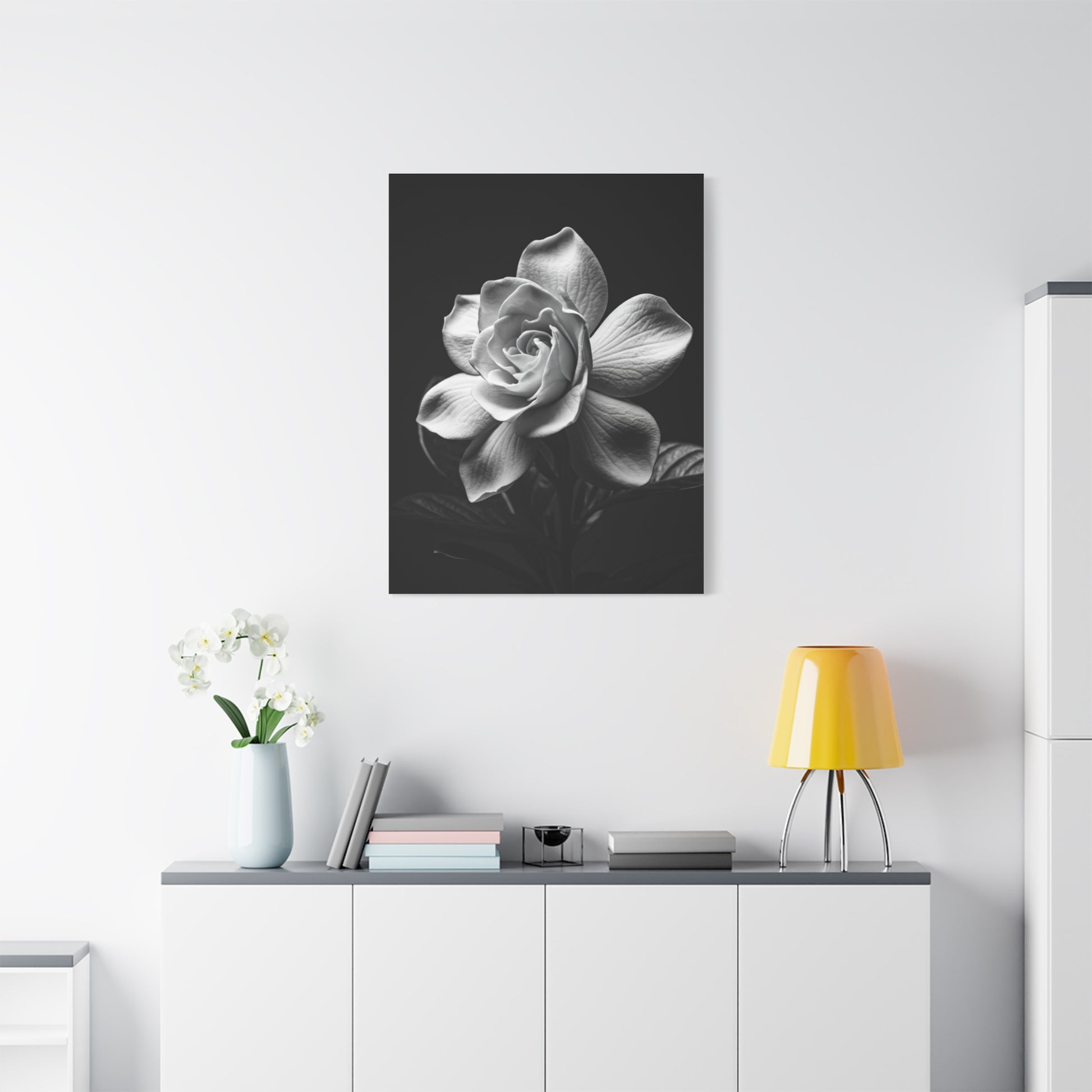 A single rose unfolds in exquisite grayscale detail, capturing romance and refinement in every layered petal. The dramatic lighting adds depth and dimension, transforming a classic flower into a bold artistic statement. Ideal for bedrooms, hallways, or elegant living spaces, this piece blends timeless beauty with contemporary styling. A sophisticated tribute to nature’s most iconic bloom.