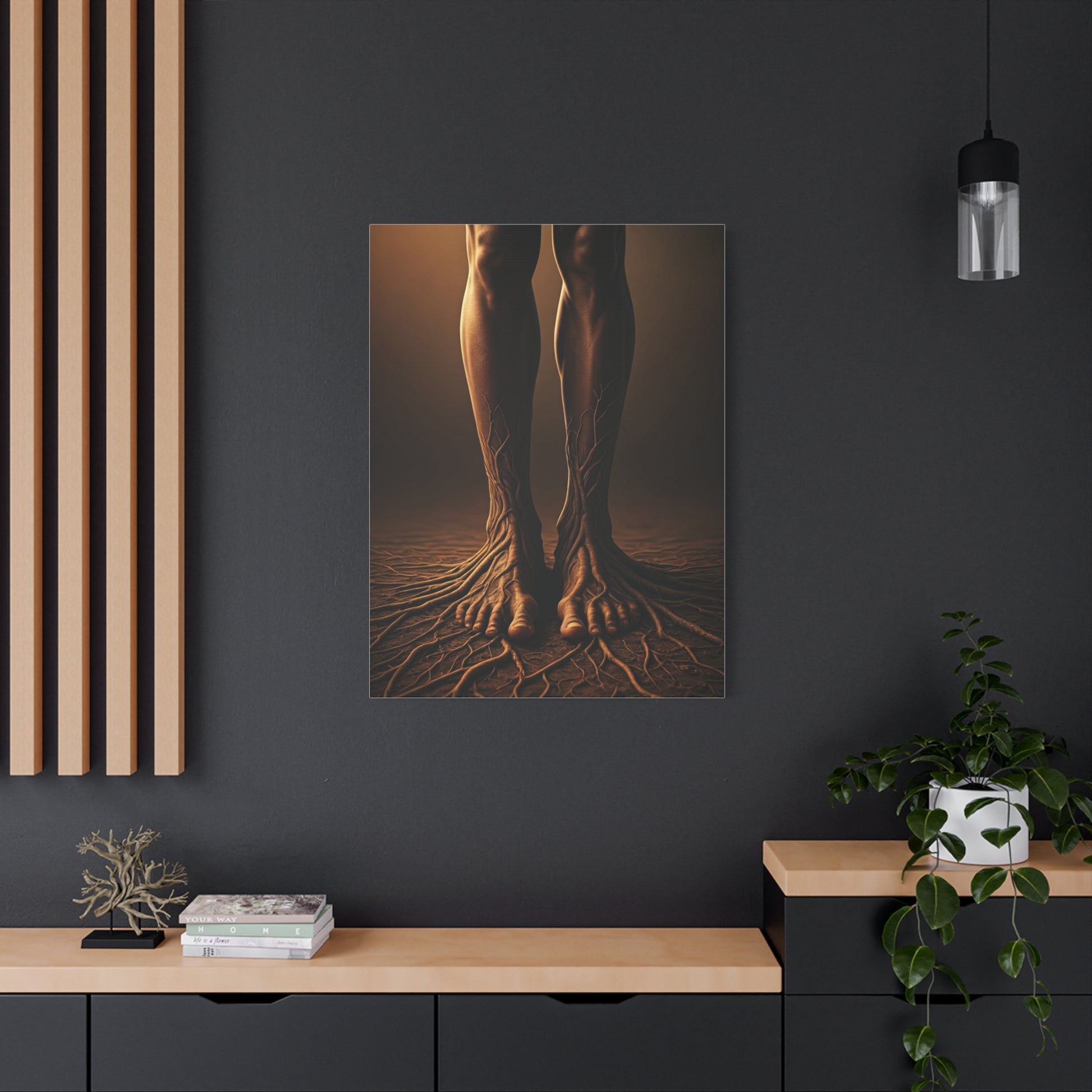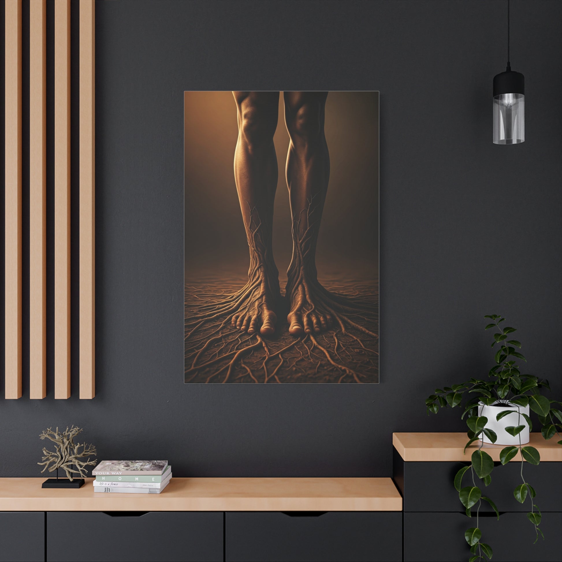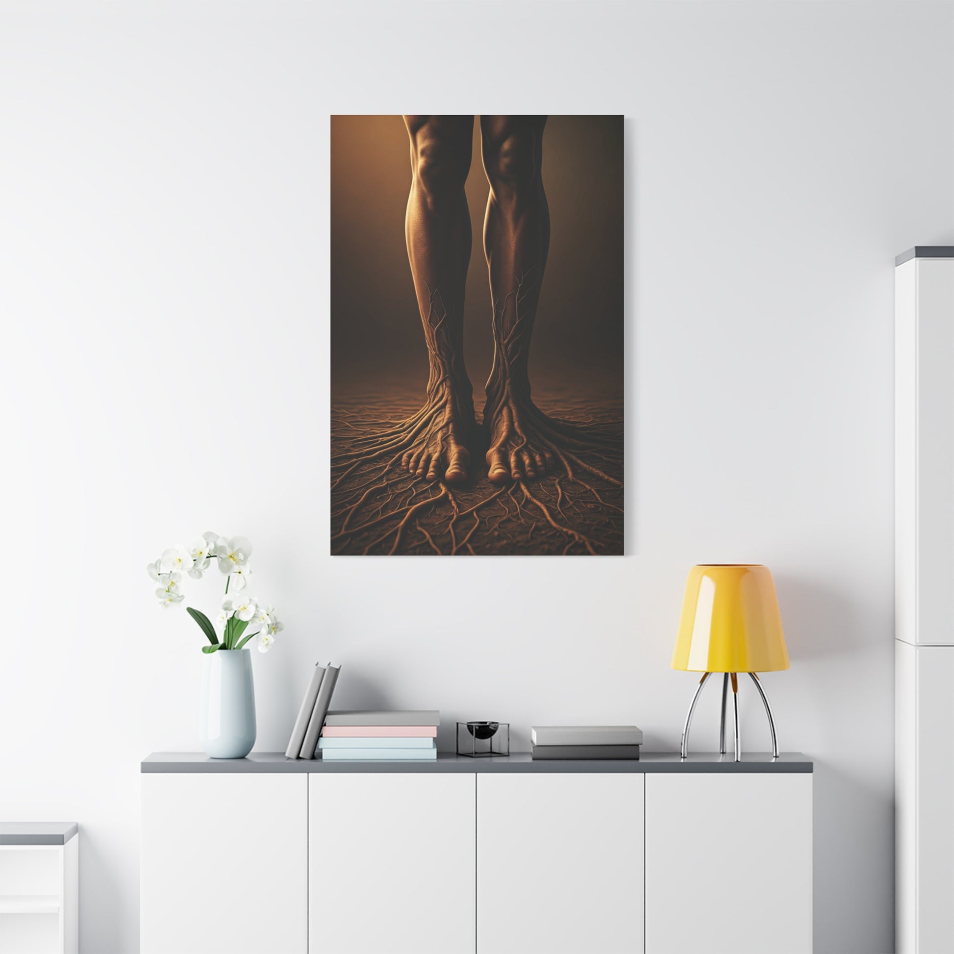 This powerful surreal artwork merges the human body with the natural world, depicting legs transforming into root-like structures spreading into the ground below. Symbolizing ancestry, grounding, and connection to the earth, the composition feels both haunting and beautiful. Warm shadows and minimal surroundings enhance the symbolic intensity, turning the artwork into a thought-provoking statement piece. Perfect for modern interiors, symbolic décor, or nature-inspired spaces seeking depth and meaning.