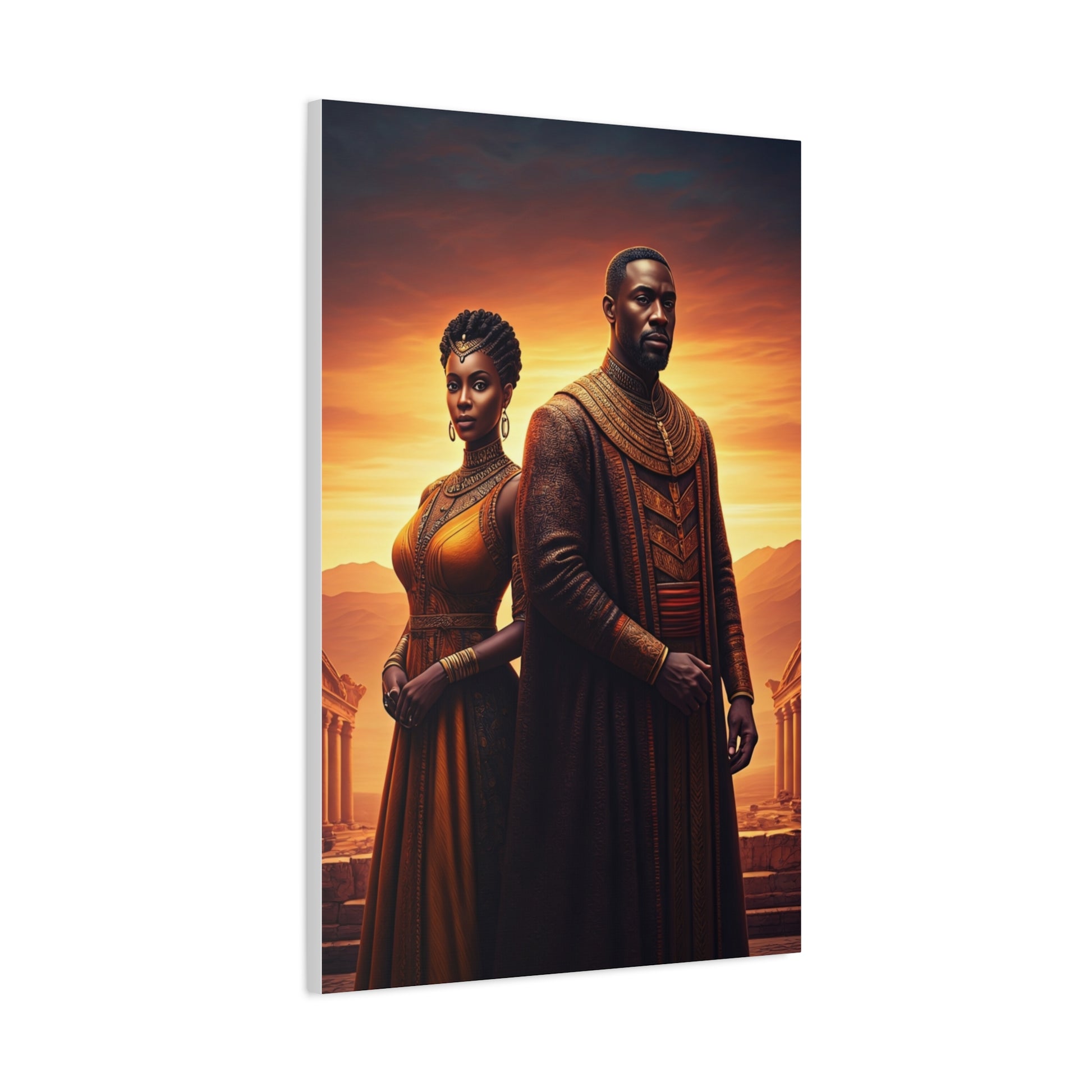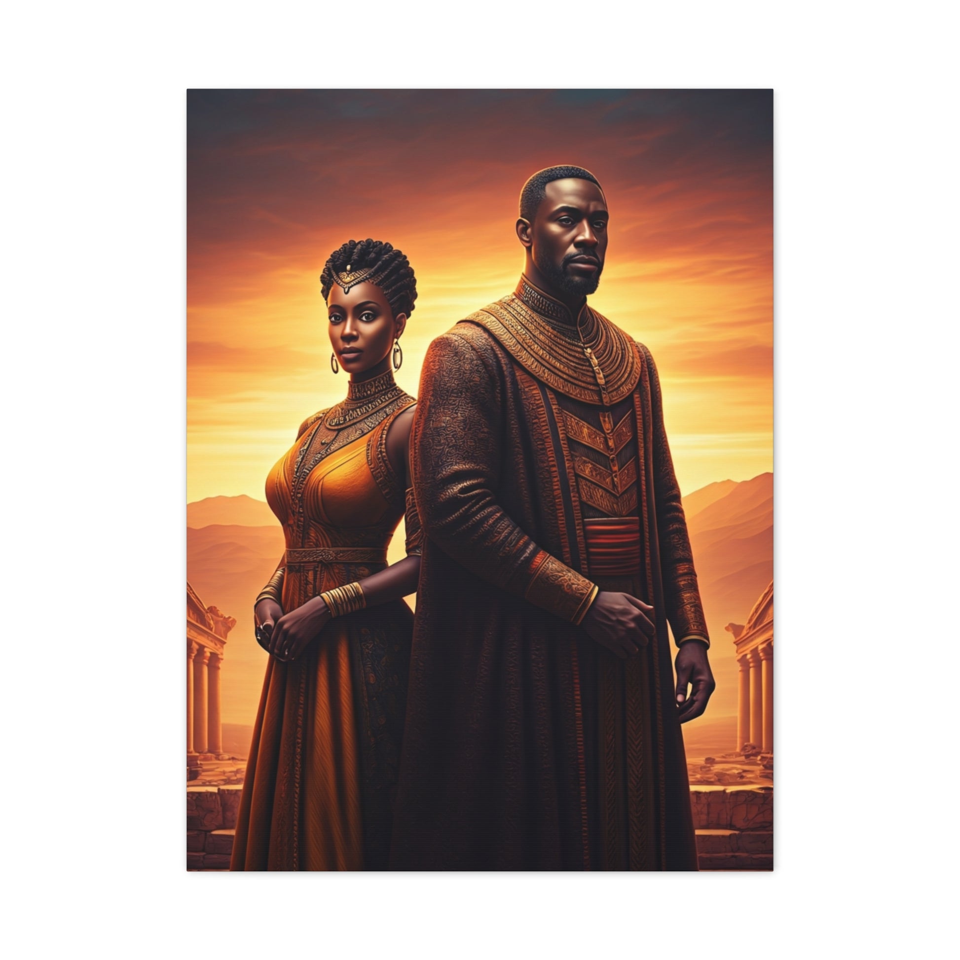This striking artwork captures a regal couple standing with strength and grace beneath a glowing sunset sky. Dressed in richly detailed ceremonial garments inspired by African royalty, they embody power, unity, and timeless heritage. The warm golden tones of the horizon blend beautifully with the deep textures of their attire, creating a cinematic atmosphere filled with dignity and purpose. Framed by ancient architectural columns and distant landscapes, the scene feels both historical and symbolic, representing leadership, love, and resilience. Perfect as a bold centerpiece for living rooms, offices, or cultural spaces, this wall art brings an aura of elegance, tradition, and royal inspiration into any interior.