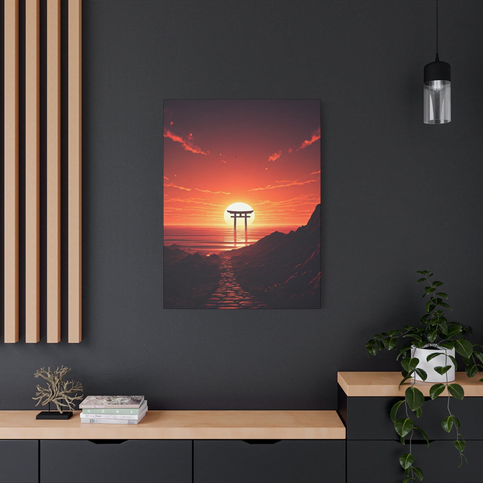 Bathed in warm sunset hues, this serene composition captures a solitary torii gate standing at the edge of the sea, symbolizing passage, reflection, and spiritual calm. The glowing sun, gentle water reflections, and deep crimson sky create a peaceful yet profound atmosphere that evokes balance between nature and tradition. Ideal for tranquil living spaces, bedrooms, or mindful interiors, this artwork adds depth, warmth, and a sense of quiet contemplation.