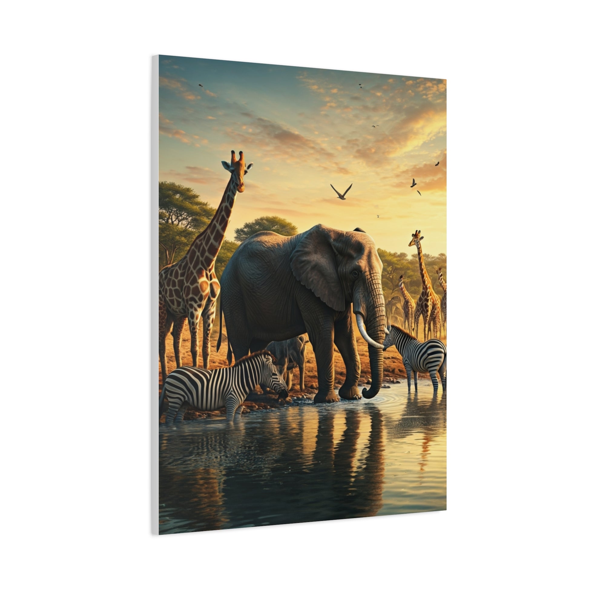 This captivating wildlife artwork features majestic elephants standing peacefully at a reflective waterhole, surrounded by giraffes and zebras under a glowing sky. The scene celebrates harmony in nature, strength, and the beauty of the African savannah. Perfect for safari-themed décor, nature lovers, or any space seeking warmth and wilderness charm.