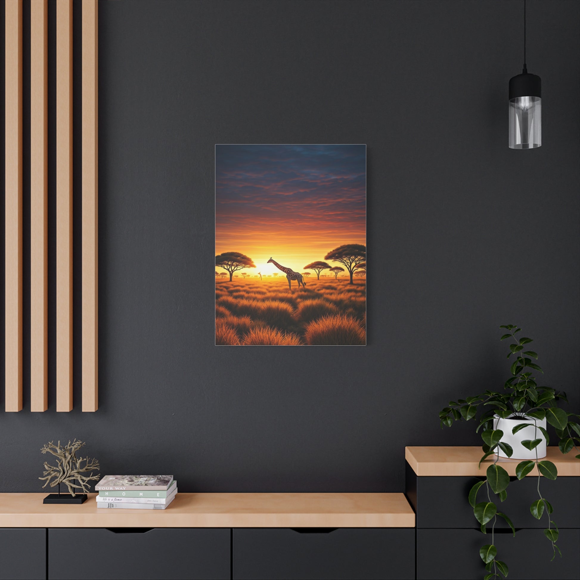 This beautiful safari-inspired artwork features giraffes standing gracefully among acacia trees beneath a fiery African sunset. The glowing sky and warm grasslands evoke freedom, wonder, and timeless wilderness beauty. An ideal wall piece for nature lovers, wildlife-themed décor, or modern earthy interiors.