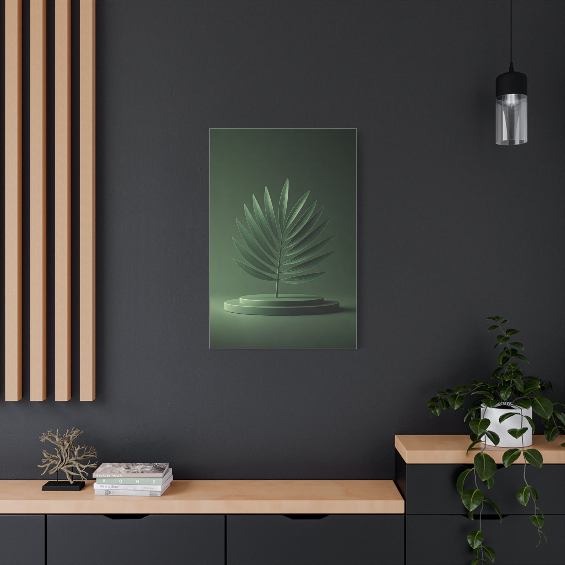 A refined botanical artwork featuring a sculptural palm leaf displayed against deep green tones. Clean lines and subtle lighting emphasize form and symmetry, offering a modern, calming aesthetic perfect for contemporary living spaces, offices, or nature-inspired décor.