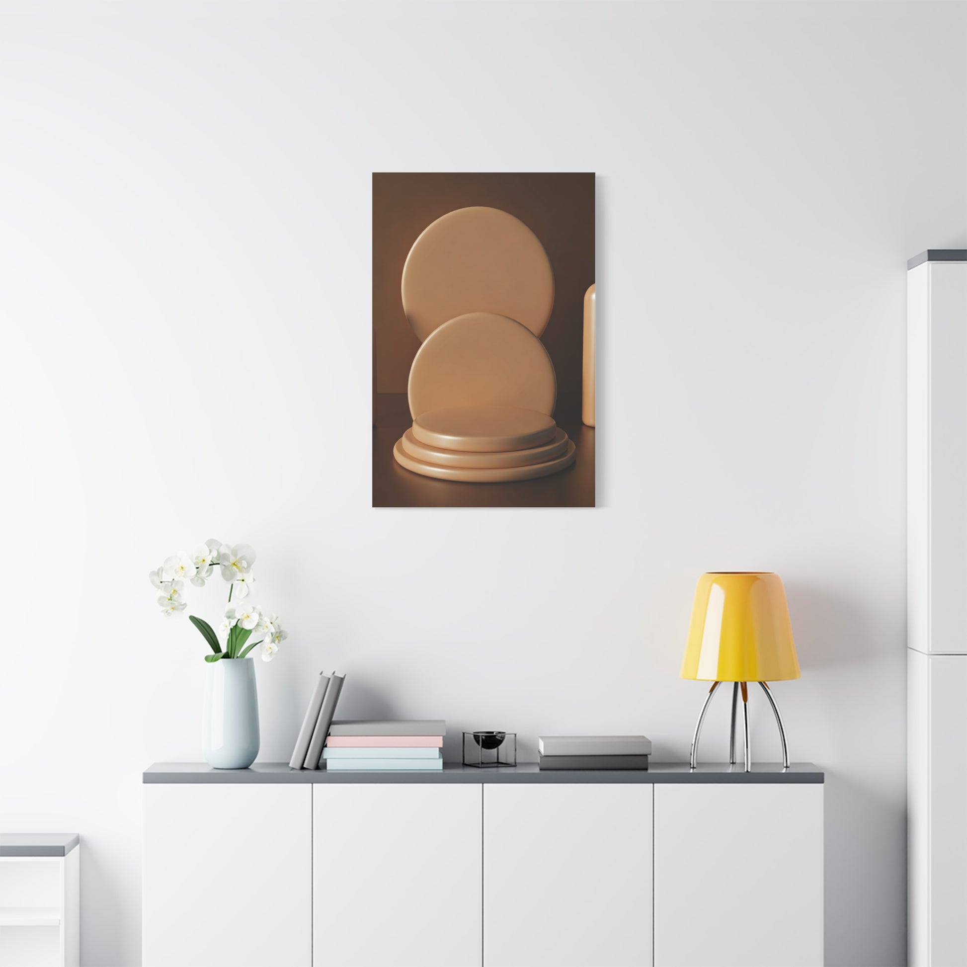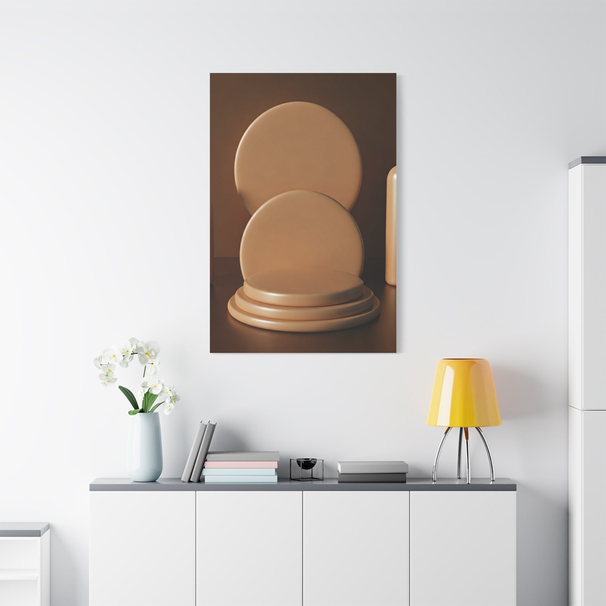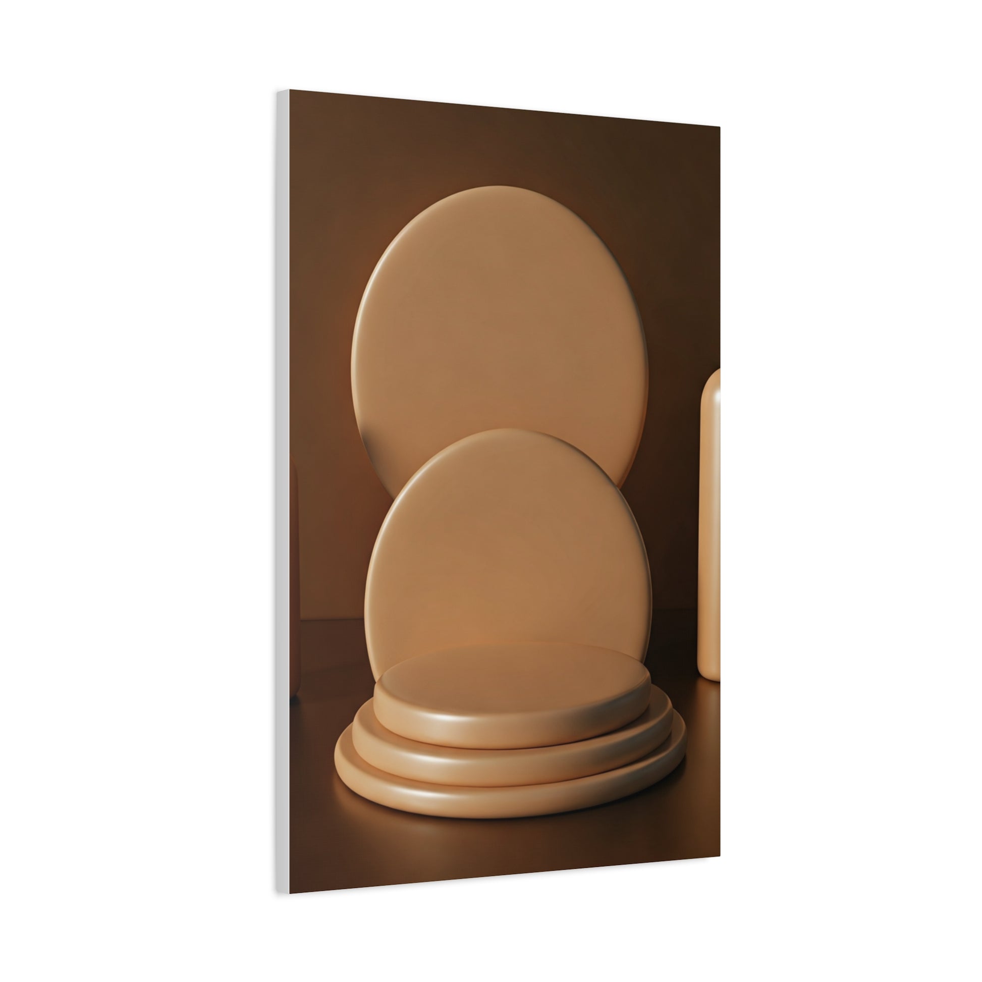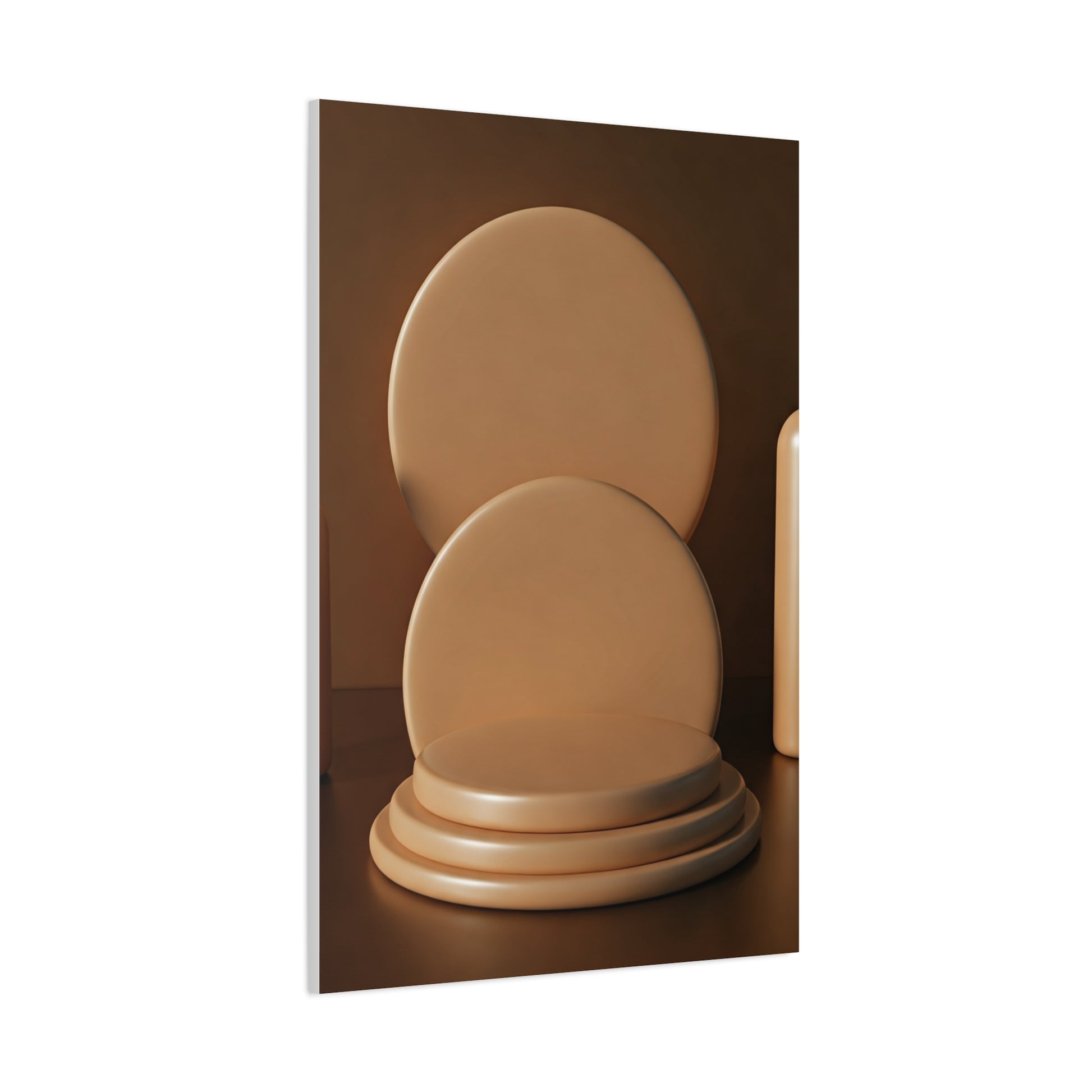This minimalist artwork presents stacked circular forms arranged like a sculptural display, enhanced by warm lighting and smooth textures. The balanced composition evokes calm refinement, making it an excellent choice for modern décor, design studios, or minimalist living spaces.