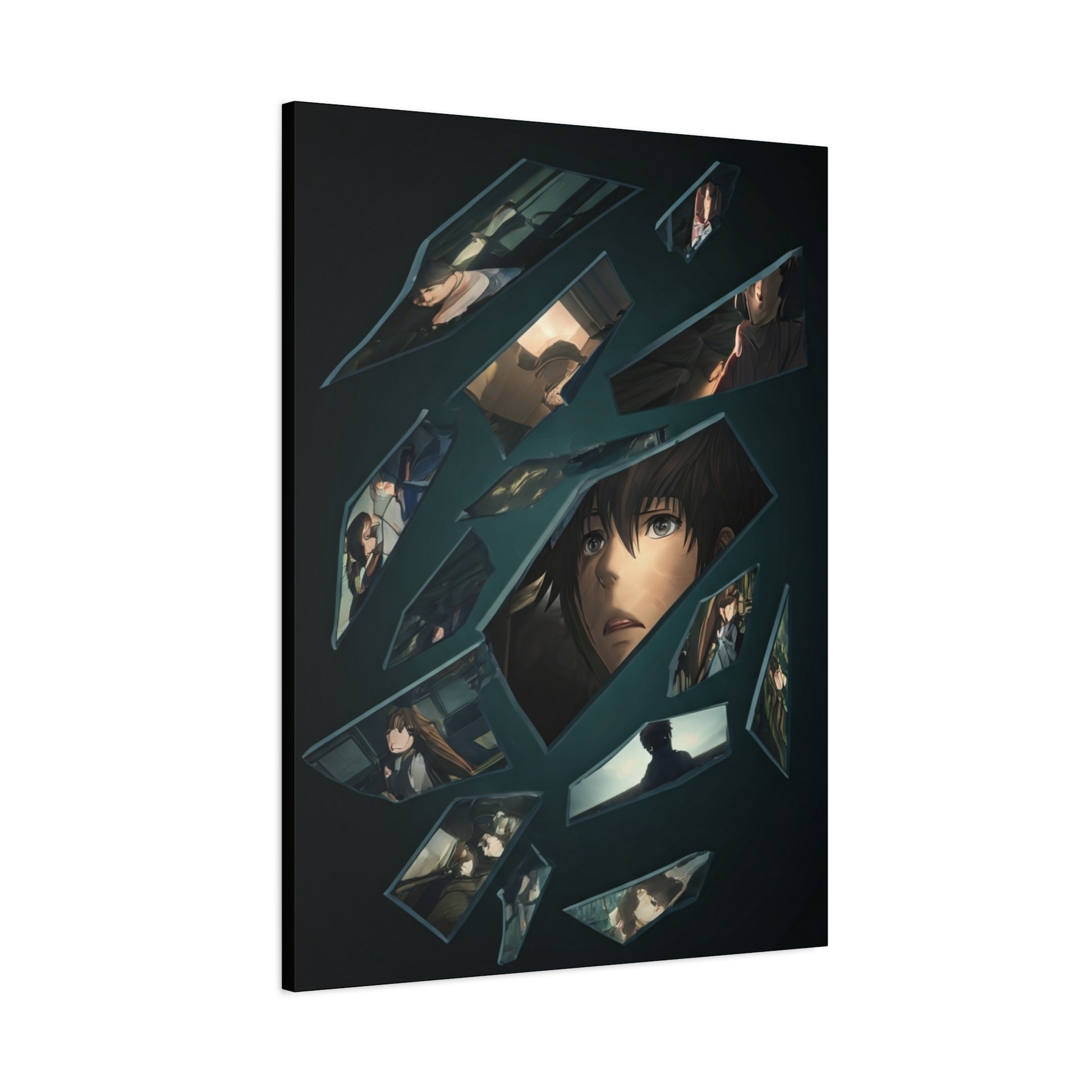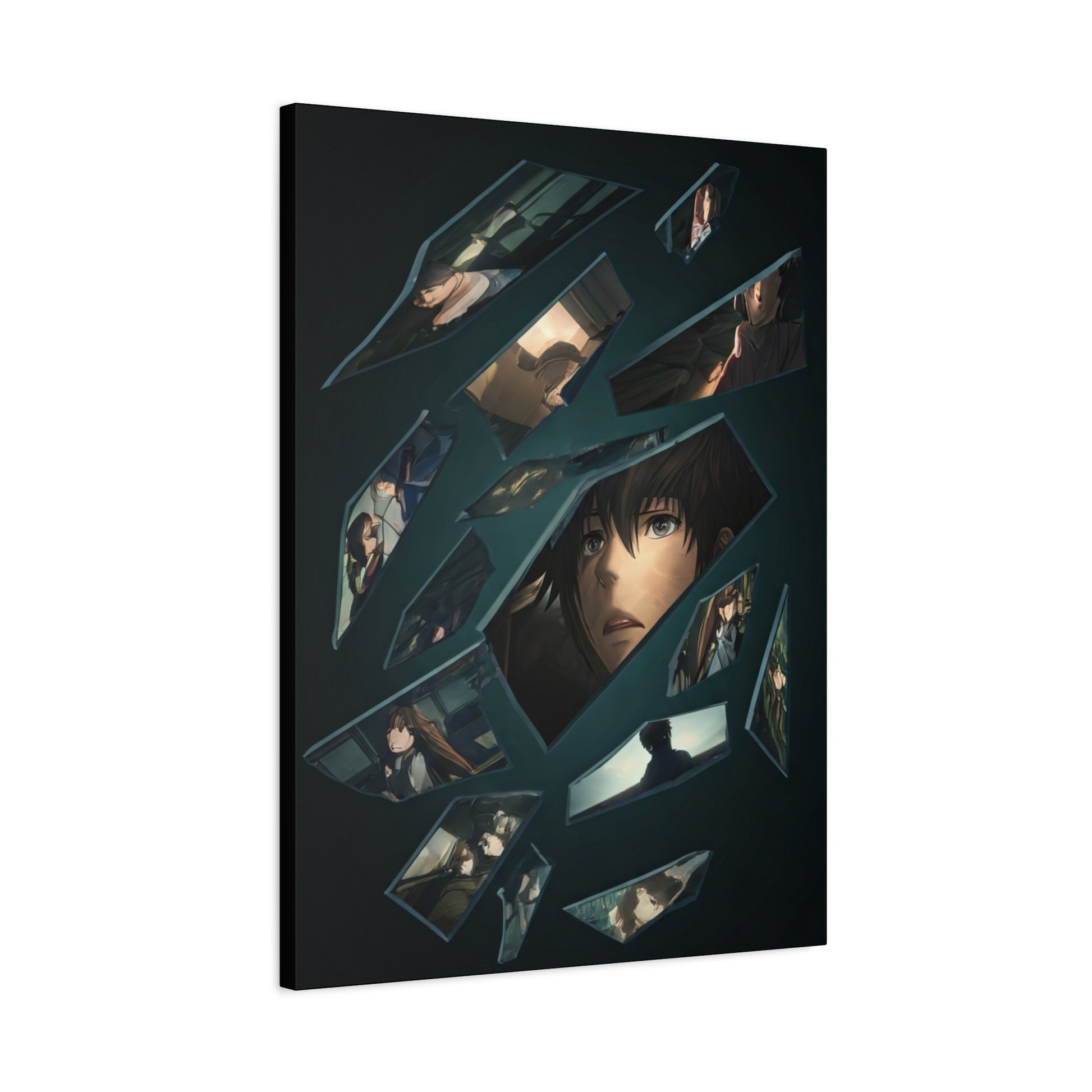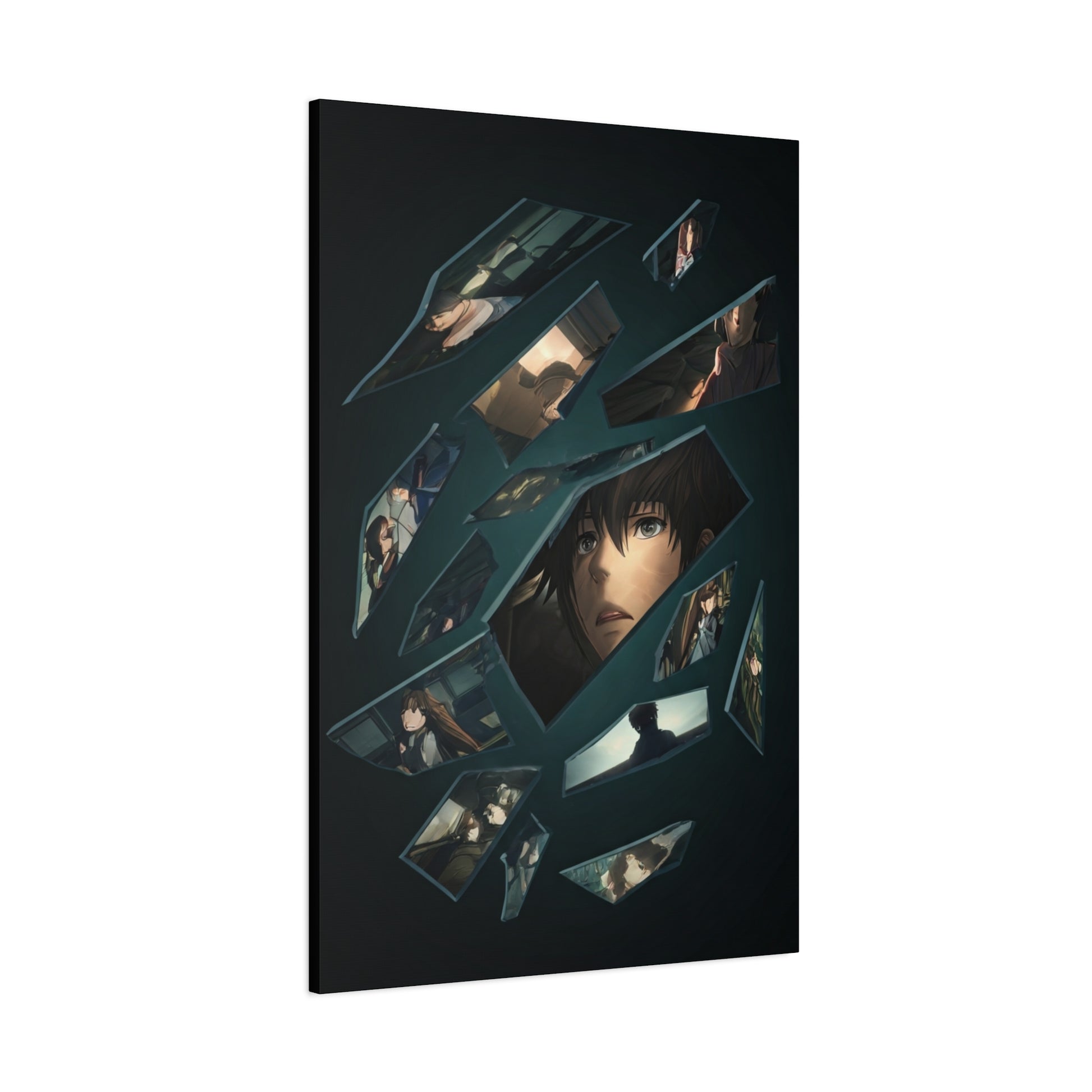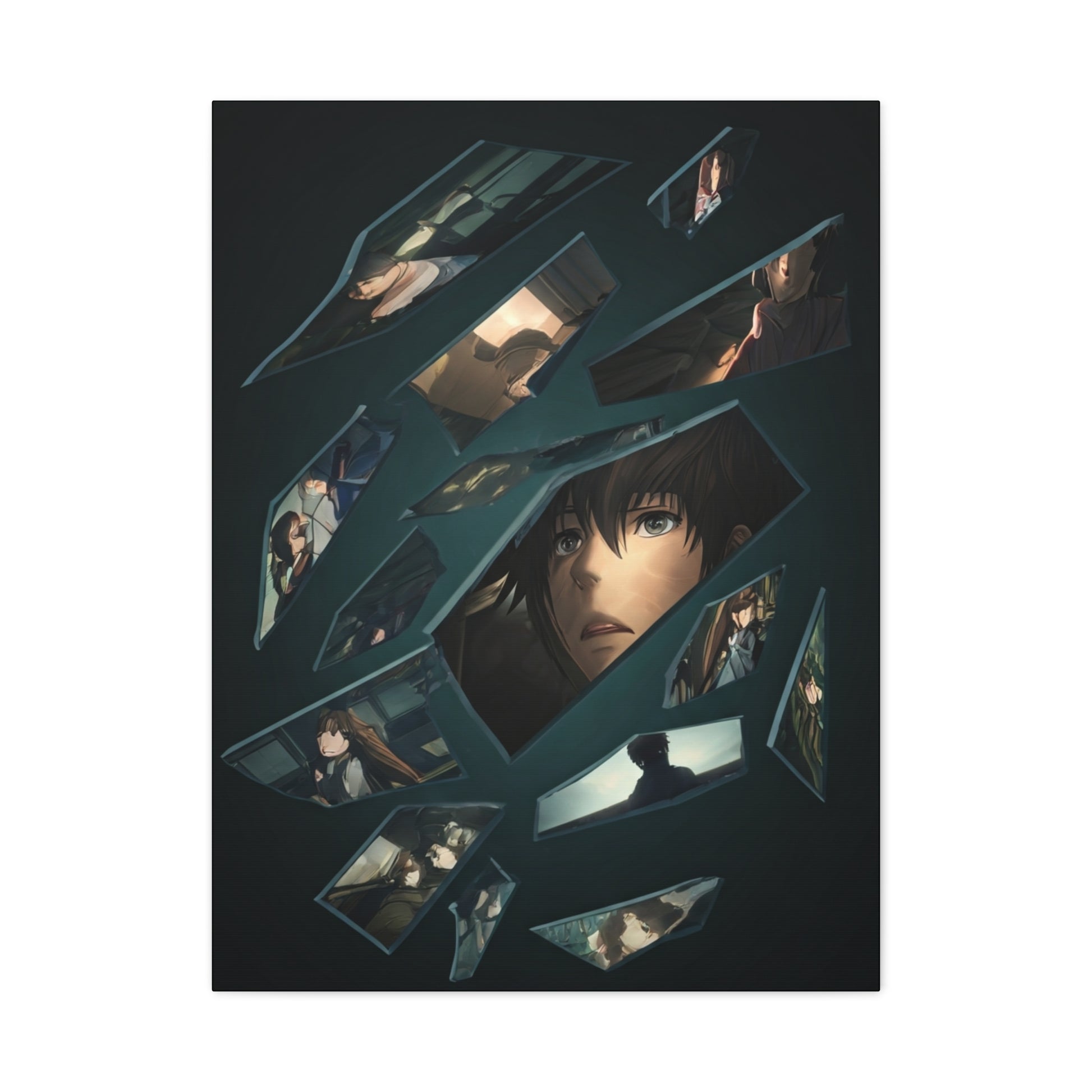 This striking artwork presents a fragmented portrait composed of broken reflections, each shard revealing moments of emotion, tension, and quiet introspection. The central figure’s expression anchors the composition, while surrounding scenes suggest memory, loss, and psychological depth unfolding through fractured visuals. With its dark palette, cinematic lighting, and anime-inspired storytelling, this piece creates a powerful focal point that suits modern, moody, or narrative-driven interiors, adding emotional weight and visual intrigue to any space.