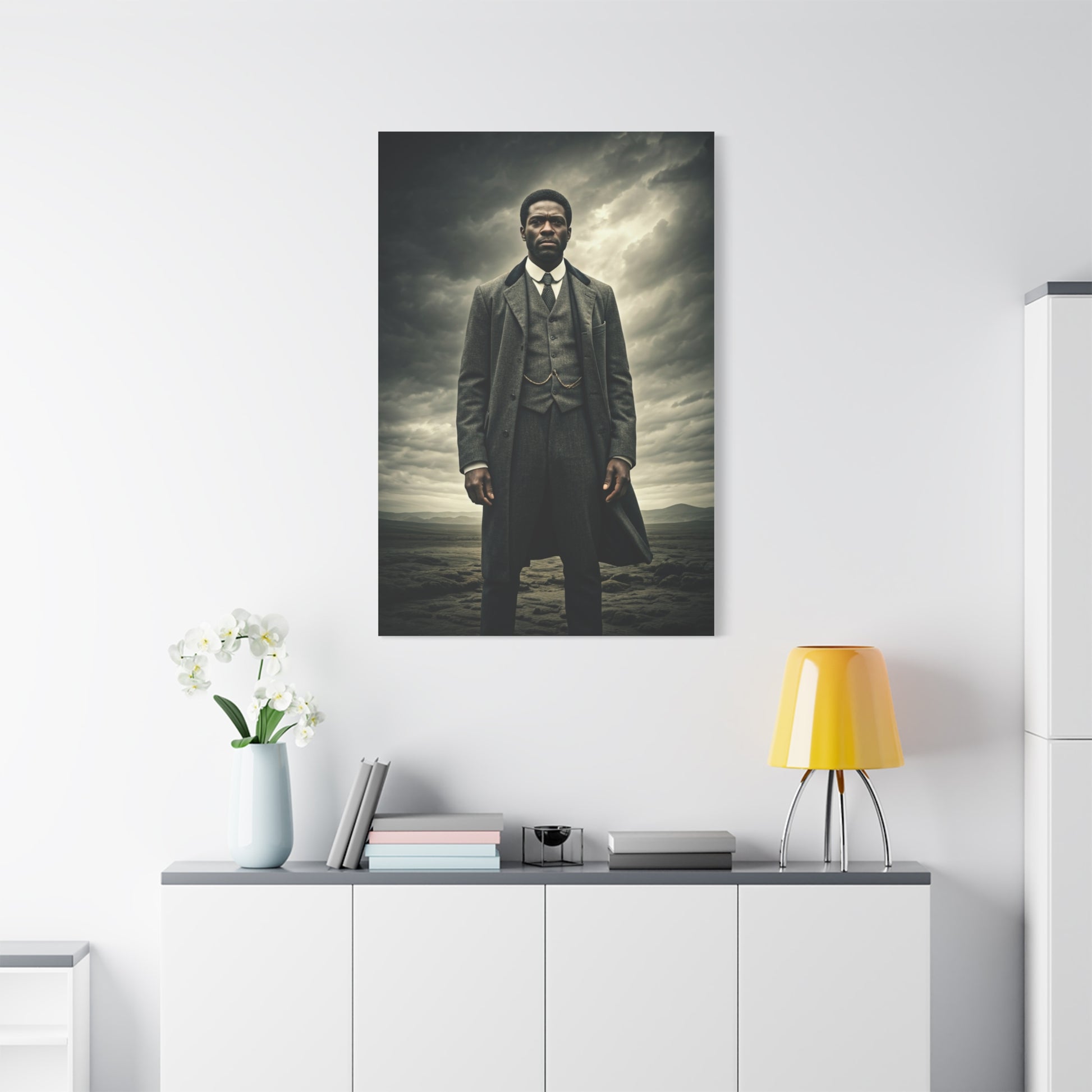 This commanding portrait shows a lone figure standing firmly beneath a turbulent sky, exuding strength, dignity, and resolve. The tailored attire and strong posture convey leadership and confidence, while the dramatic clouds behind add tension and depth. The balanced composition and muted color palette give the artwork a refined, cinematic presence. This piece feels both timeless and powerful, making it ideal for contemporary homes, offices, or executive spaces where strength and purpose are celebrated.
