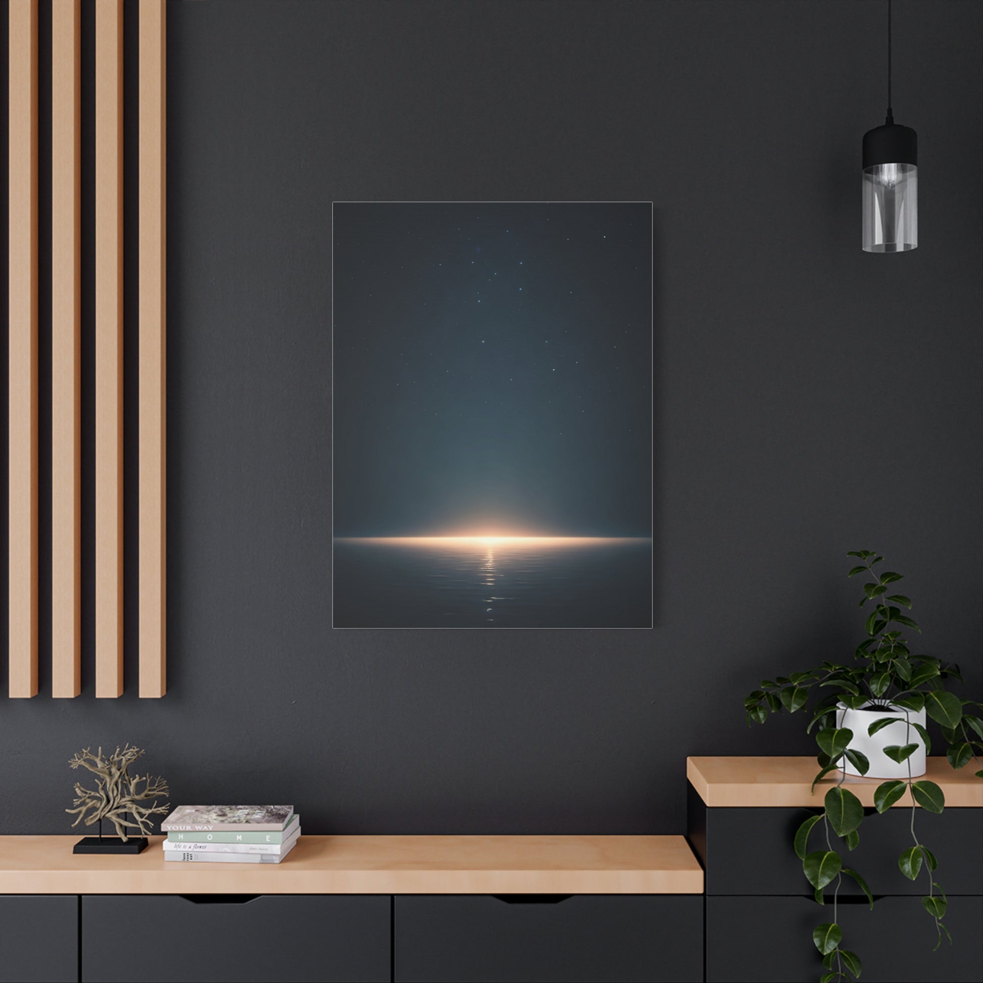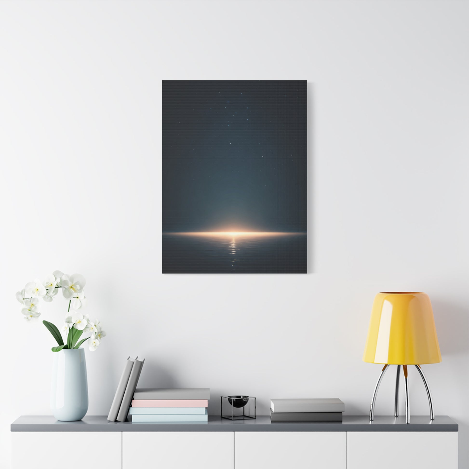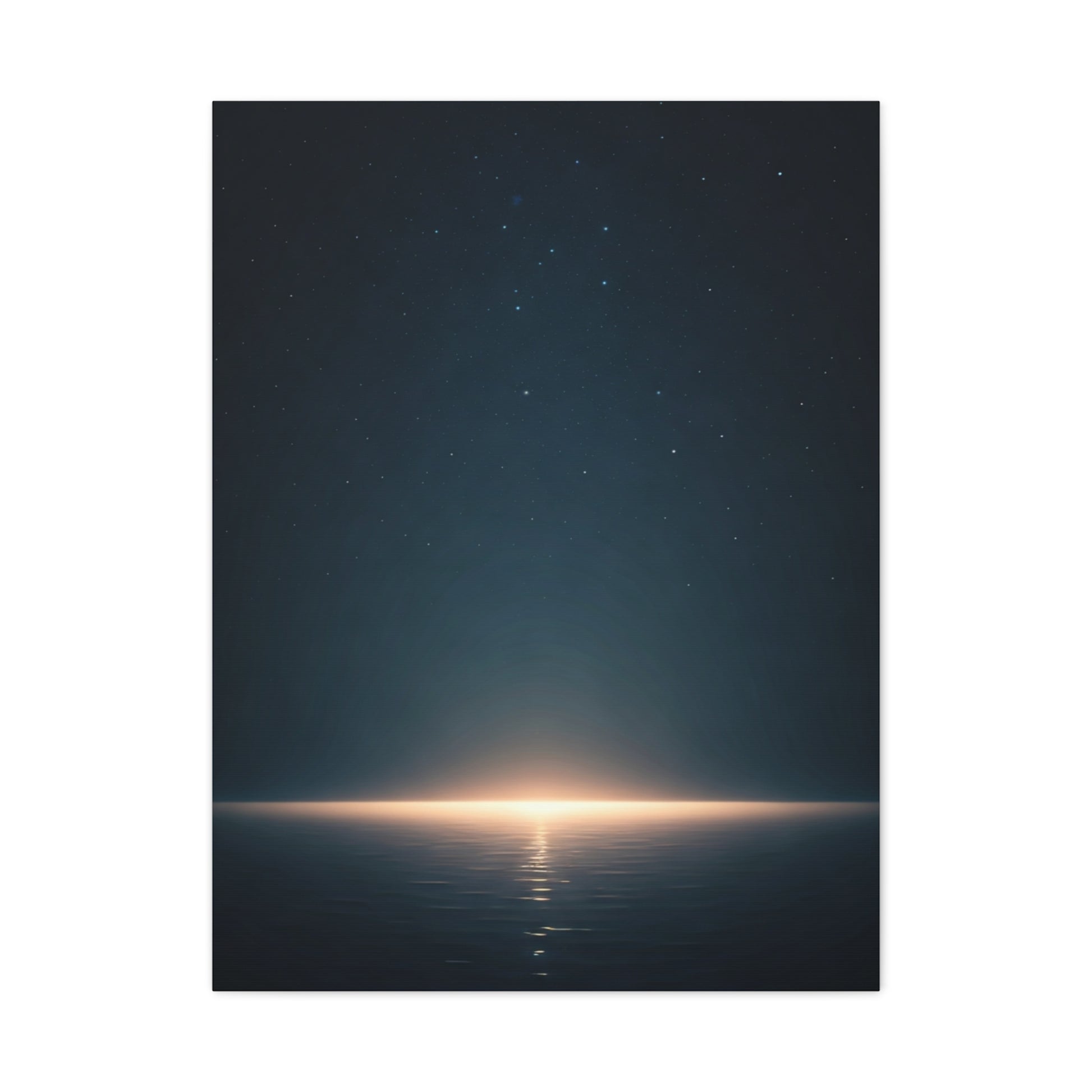 A minimalist night seascape where a distant glow meets calm water beneath a star-filled sky. The subtle light and expansive composition evoke stillness and wonder, making this artwork ideal for contemporary interiors, meditation spaces, or serene bedroom decor.