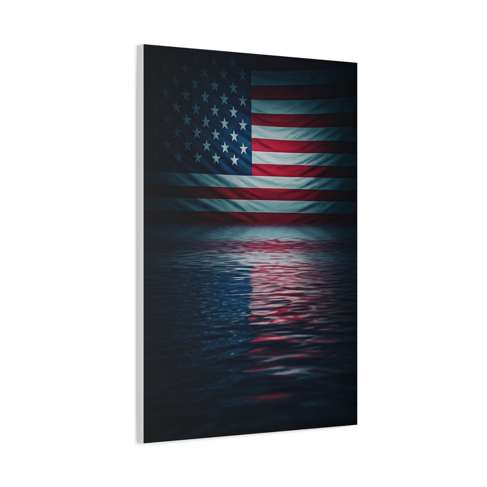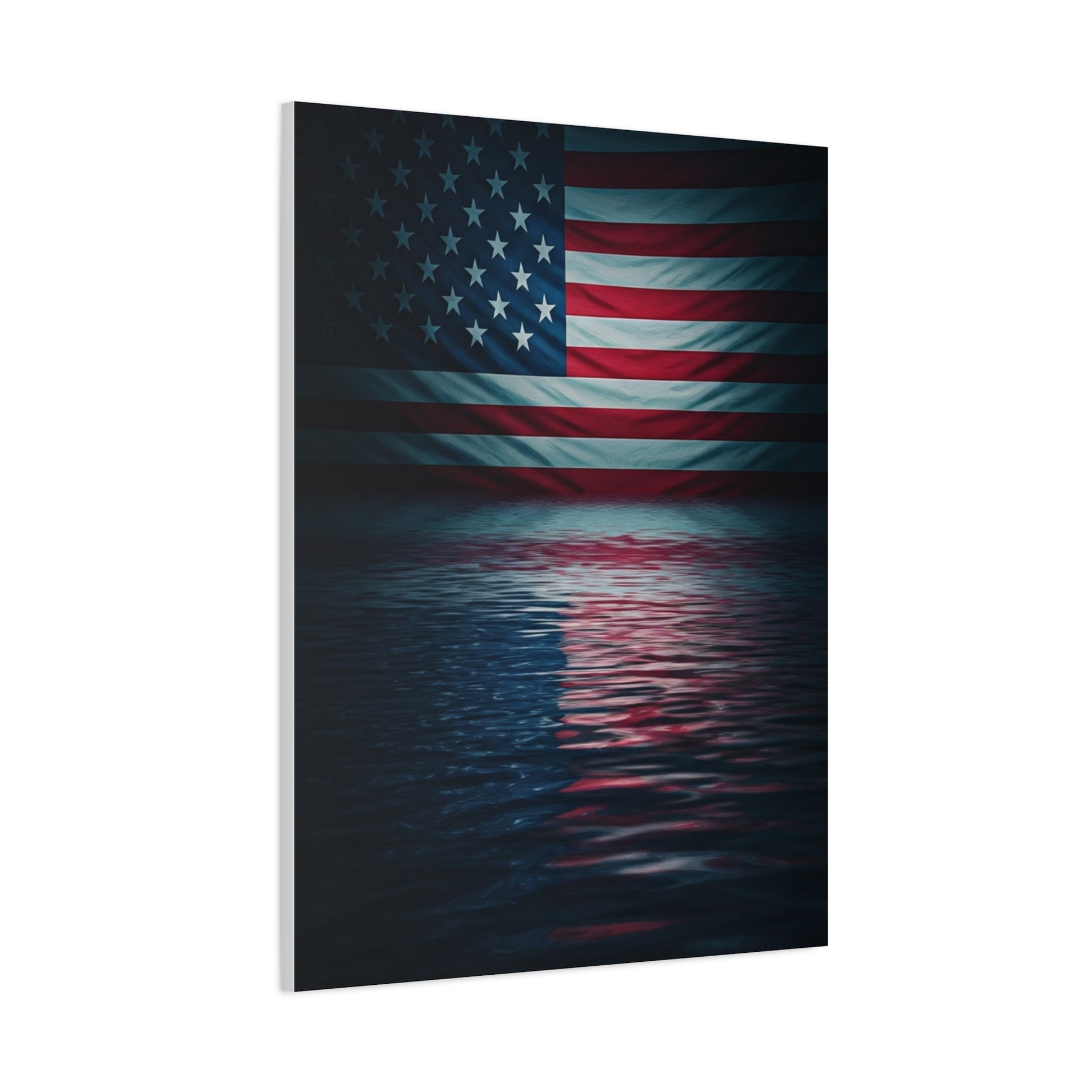 This cinematic piece showcases the American flag reflected across dark, rippling waters, creating a powerful mood of remembrance, resilience, and pride. Its modern dramatic style makes it an impactful centerpiece for patriotic interiors and timeless décor.
