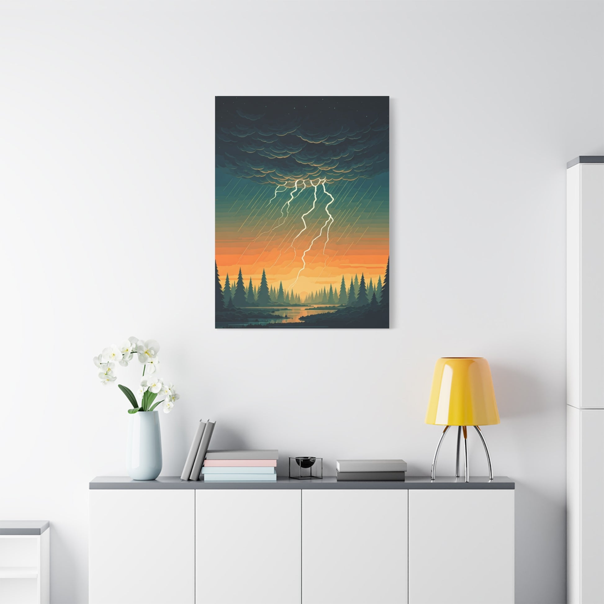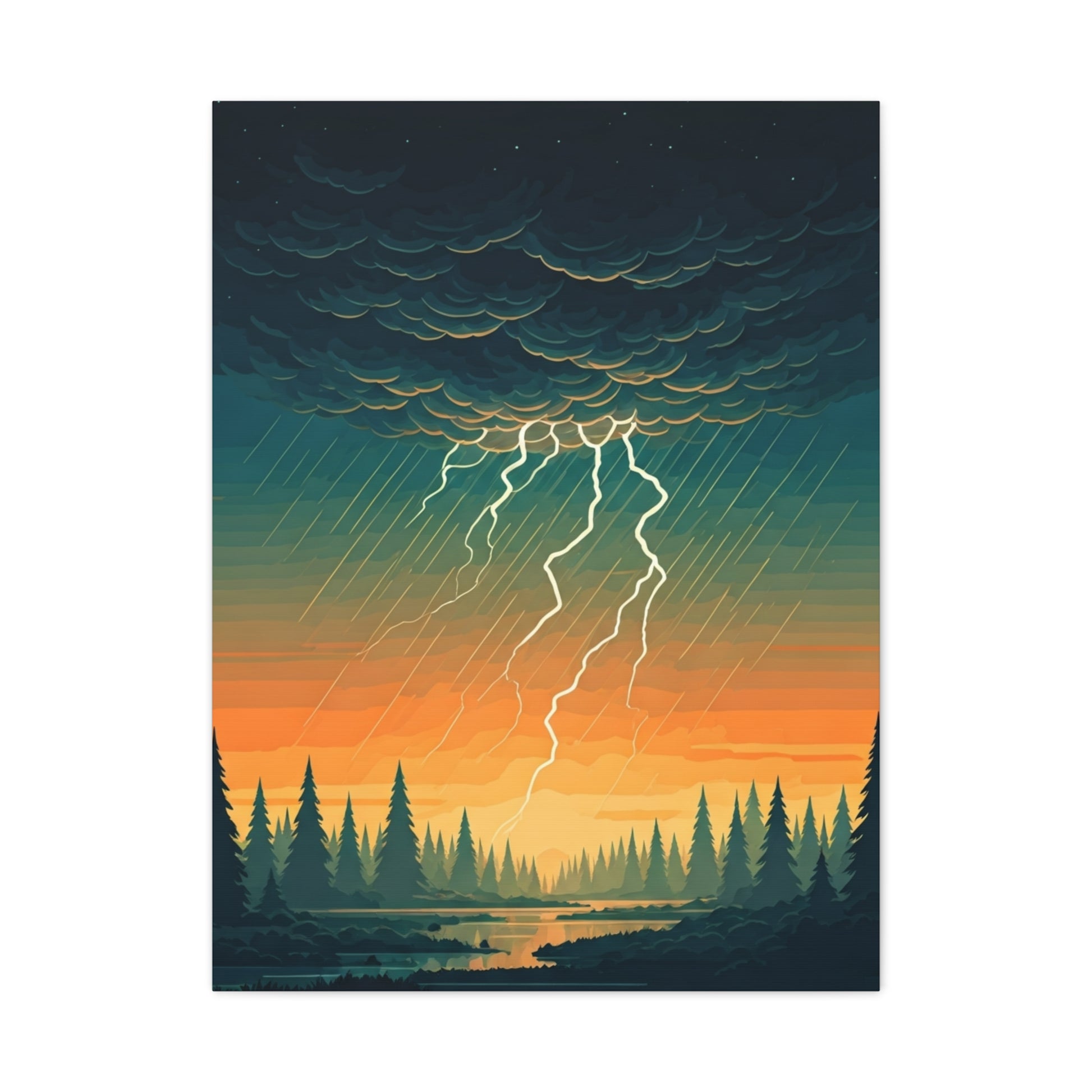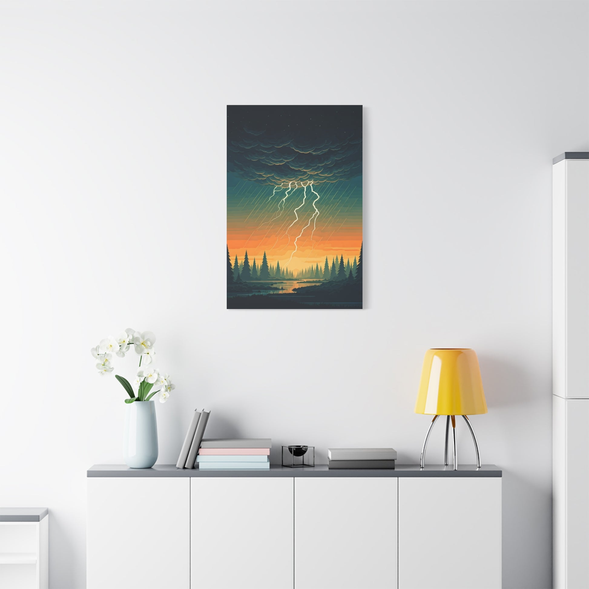 Stormfire Valley showcases raw natural energy as lightning fractures a glowing sunset sky above a dark forest. Rich colours and dramatic contrast bring movement and intensity, making this artwork a powerful focal point. Ideal for bold interiors that celebrate nature’s force and visual drama.