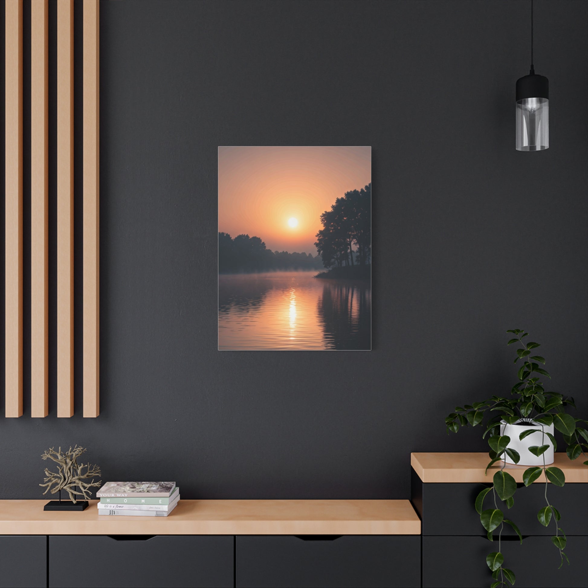 This tranquil artwork showcases a glowing sunrise mirrored across calm water, framed by soft silhouettes of trees. The warm amber tones and balanced composition create a soothing, cinematic atmosphere. Perfect for bedrooms, offices, or serene living spaces, this piece adds warmth and quiet sophistication.