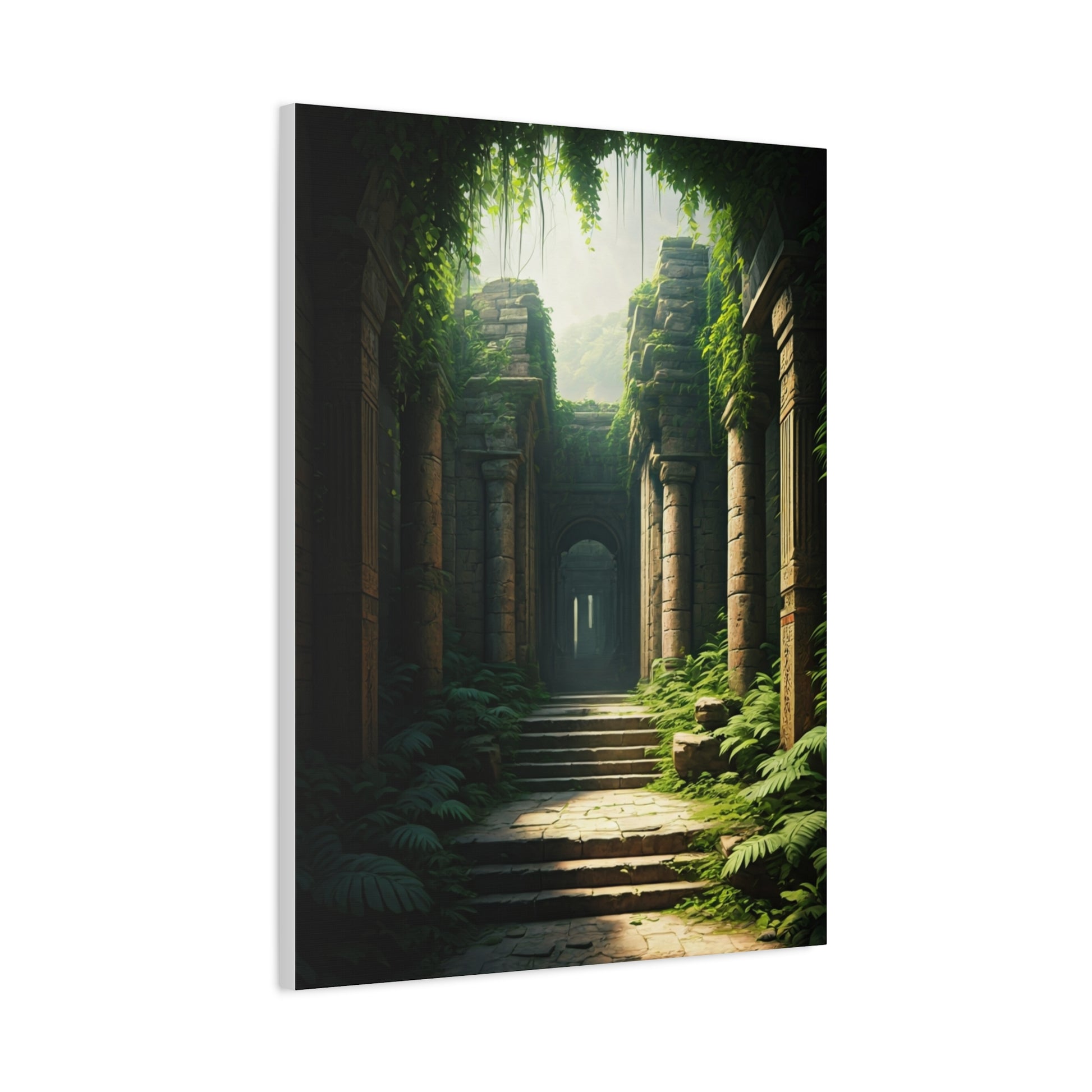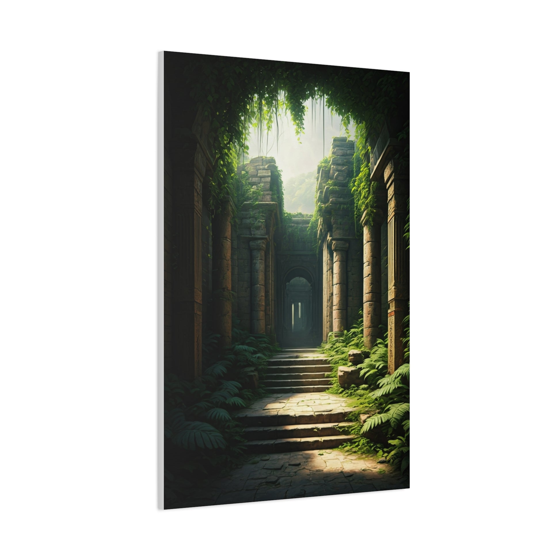 This atmospheric artwork reveals an ancient stone corridor overtaken by lush greenery, illuminated by soft sunlight filtering through the canopy above. The scene evokes discovery, serenity, and timeless mystery, blending nature with forgotten architecture. Ideal for modern and adventurous décor styles, it adds depth, calm, and wonder to any space.