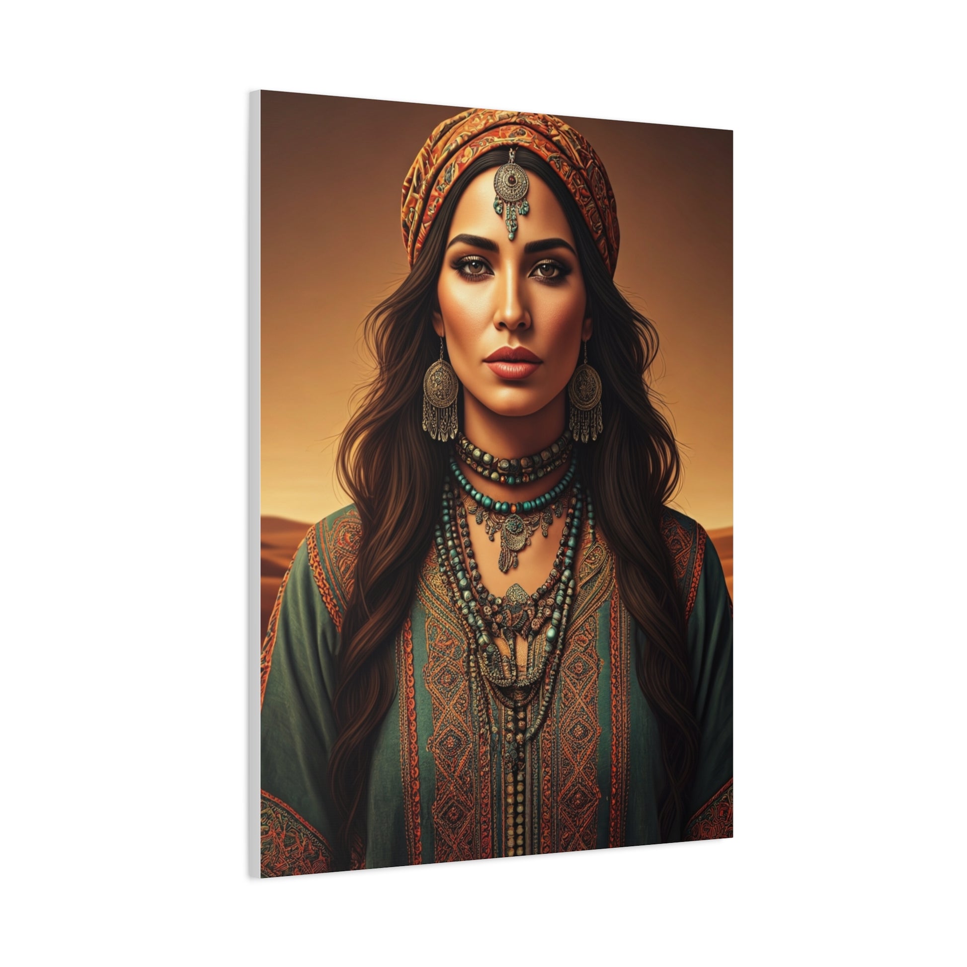 This striking portrait presents a powerful feminine figure adorned with layered necklaces, detailed embroidery, and symbolic head jewelry. Earthy greens, copper tones, and soft desert hues blend harmoniously to create a balanced and regal composition. Her confident gaze and symmetrical framing convey strength, elegance, and cultural pride. The fine detailing brings texture and depth, making it a strong visual centerpiece. Perfect for bohemian, global, or statement interiors seeking character and timeless charm.