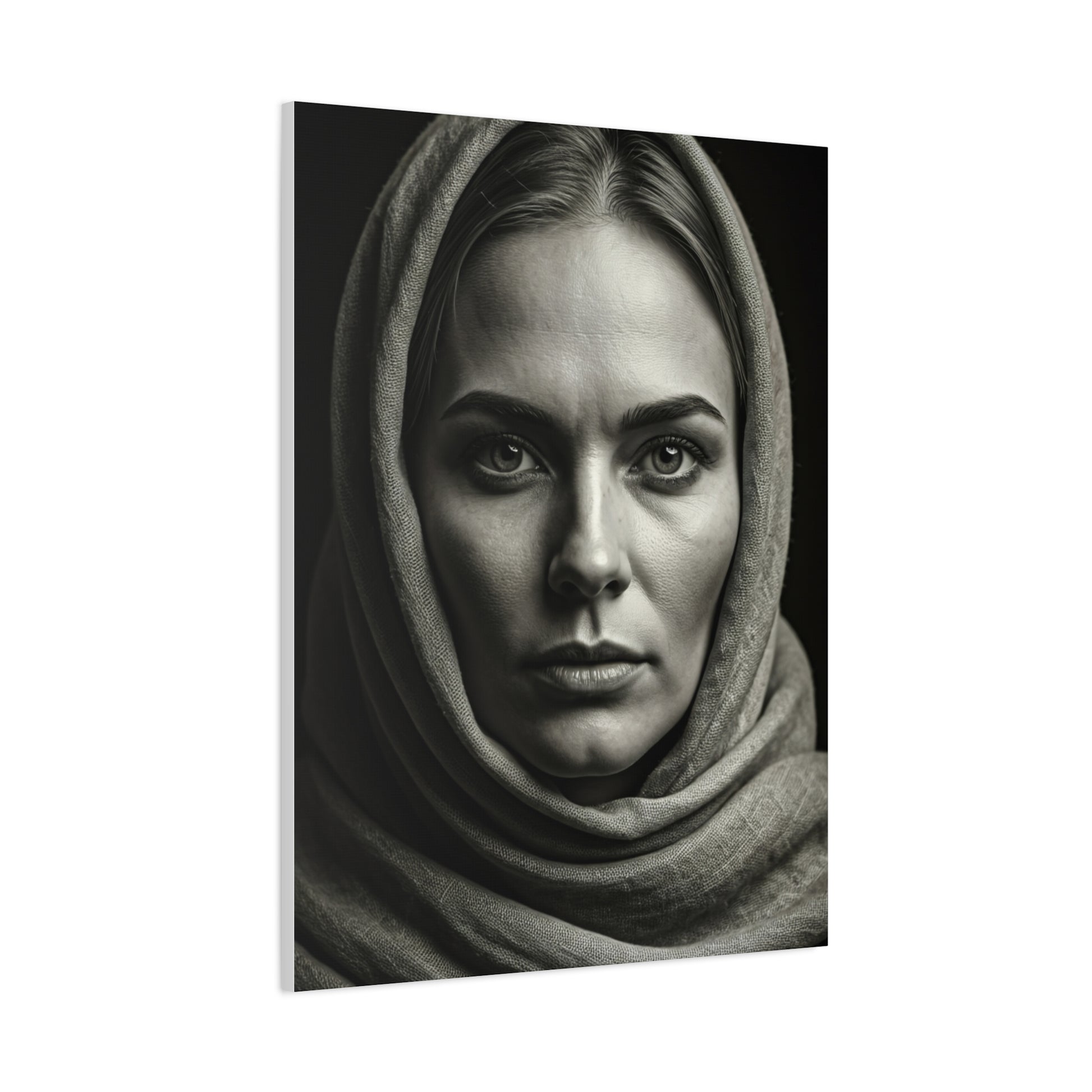 This refined portrait presents a woman wrapped in a soft veil, her expression calm, introspective, and quietly powerful. Gentle lighting highlights facial contours and emotion while maintaining a timeless, elegant atmosphere. The minimalist composition draws focus to presence rather than detail. Perfect for modern, serene, or gallery-style interiors, this artwork adds balance and sophistication. A graceful representation of inner strength and dignity.