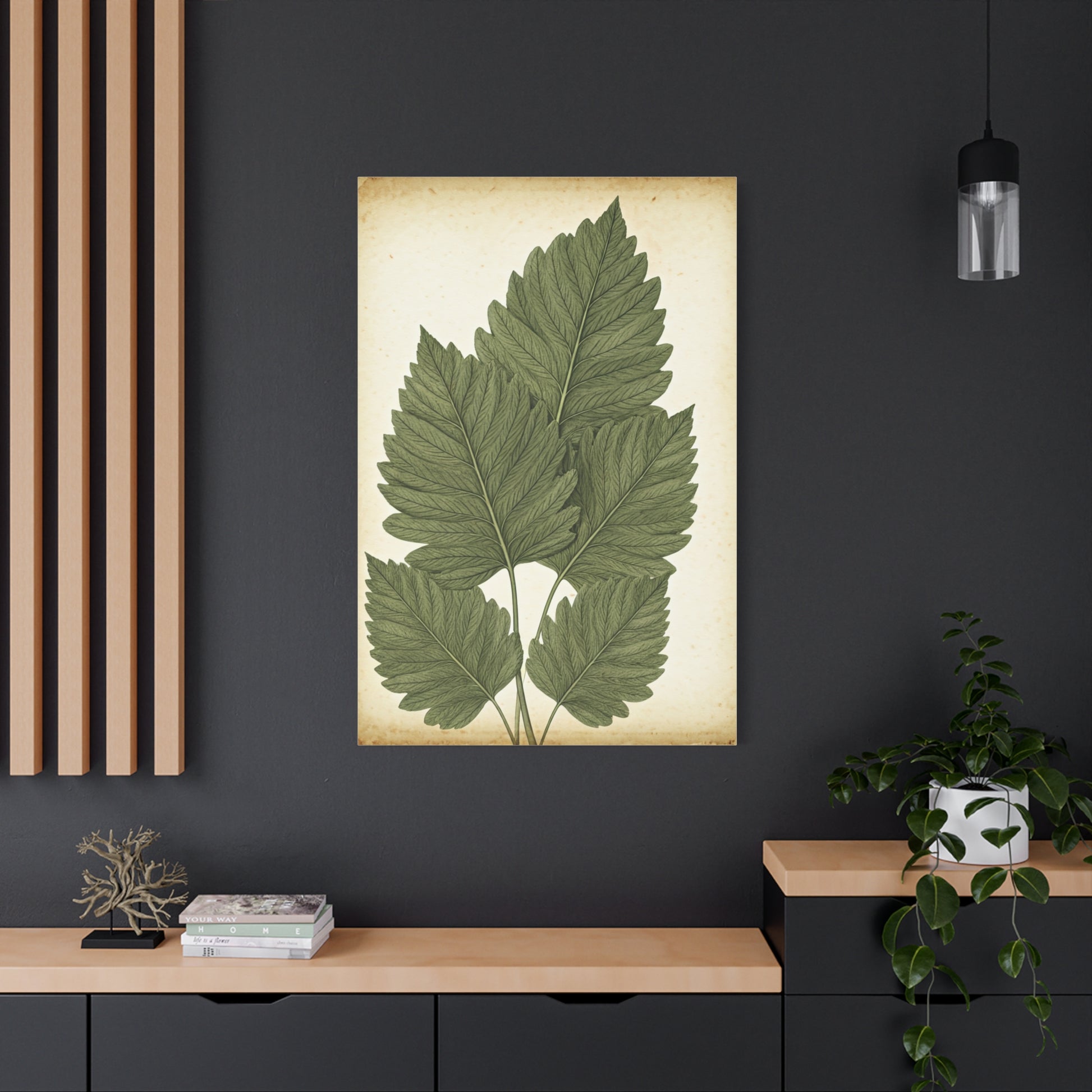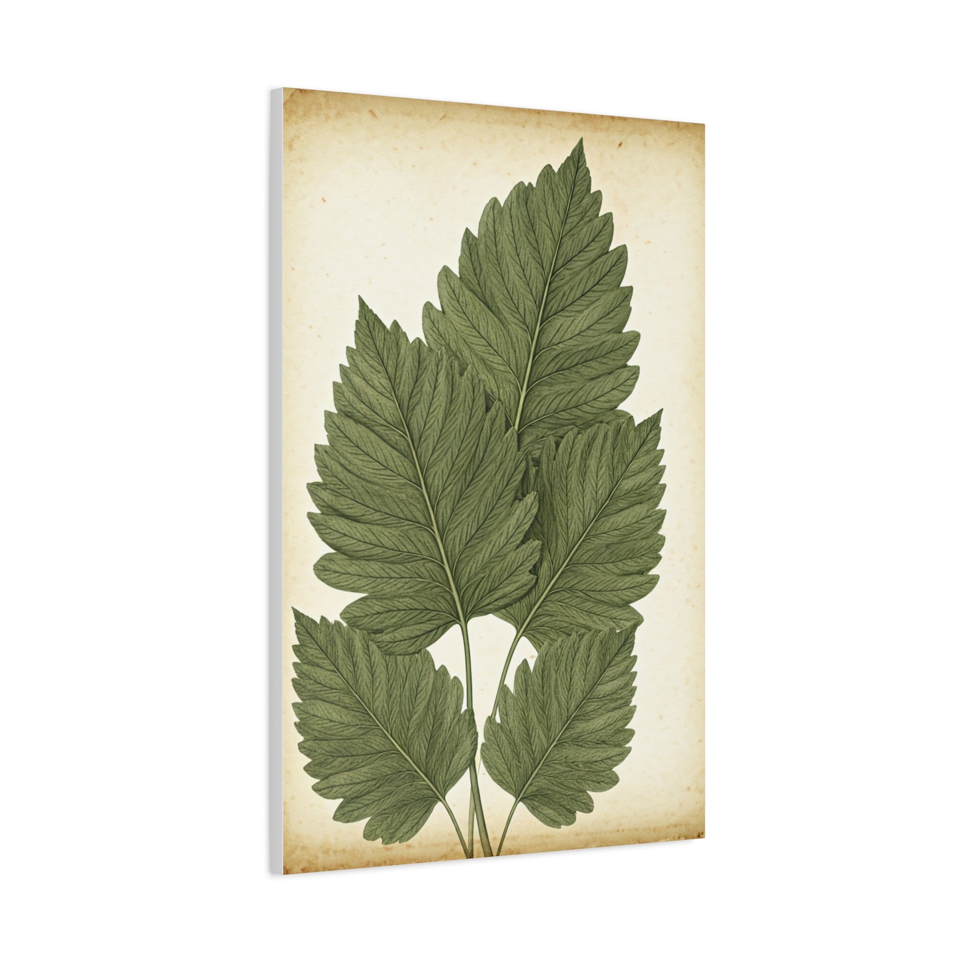 This elegant illustration presents a cluster of finely detailed leaves arranged in a classic study composition. Soft green hues and delicate veining stand out against a warm, aged paper background. The artwork feels calm, balanced, and thoughtfully minimal. Perfect for kitchens, hallways, studies, or modern rustic interiors. A refined wall piece that celebrates natural form and quiet beauty.