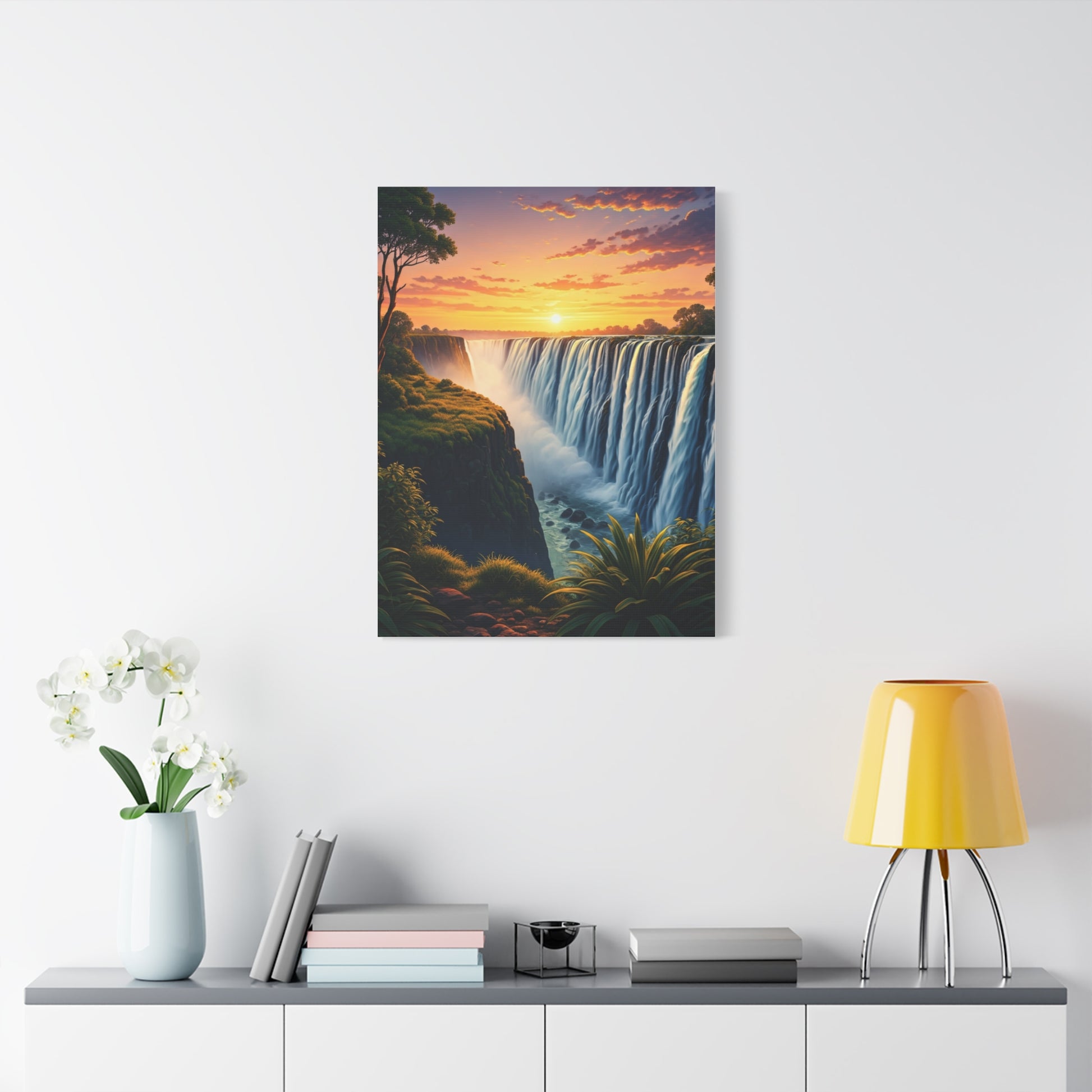 This radiant landscape showcases a magnificent waterfall cascading into mist as the sun rises across a glowing sky. Rich colors and flowing motion create a sense of peace, power, and natural renewal. Perfect for bright, uplifting interiors, this piece brings freshness and beauty into living rooms, offices, or calming spaces.