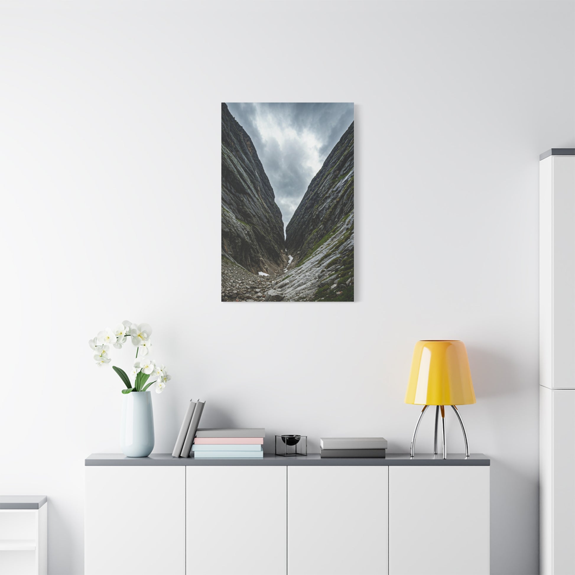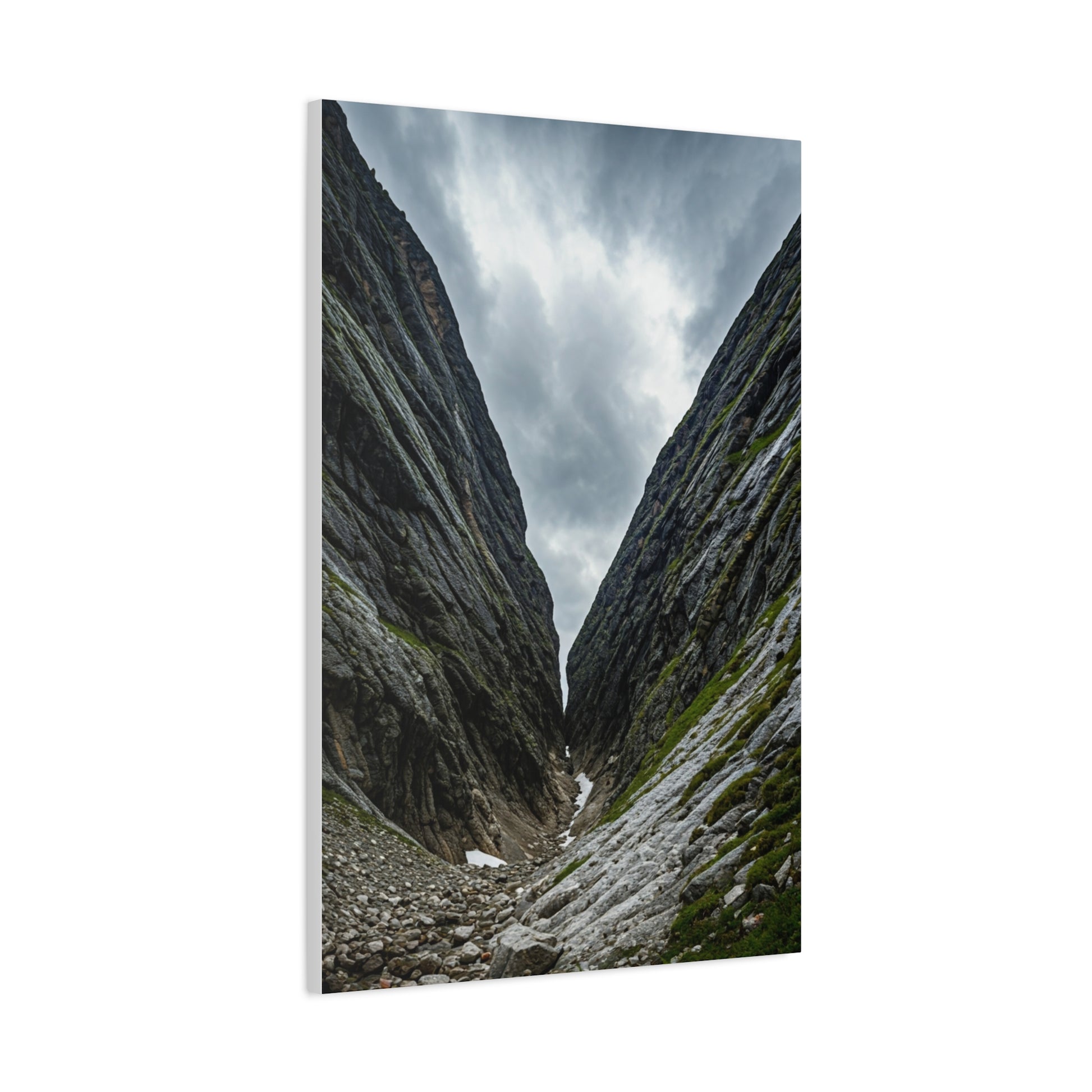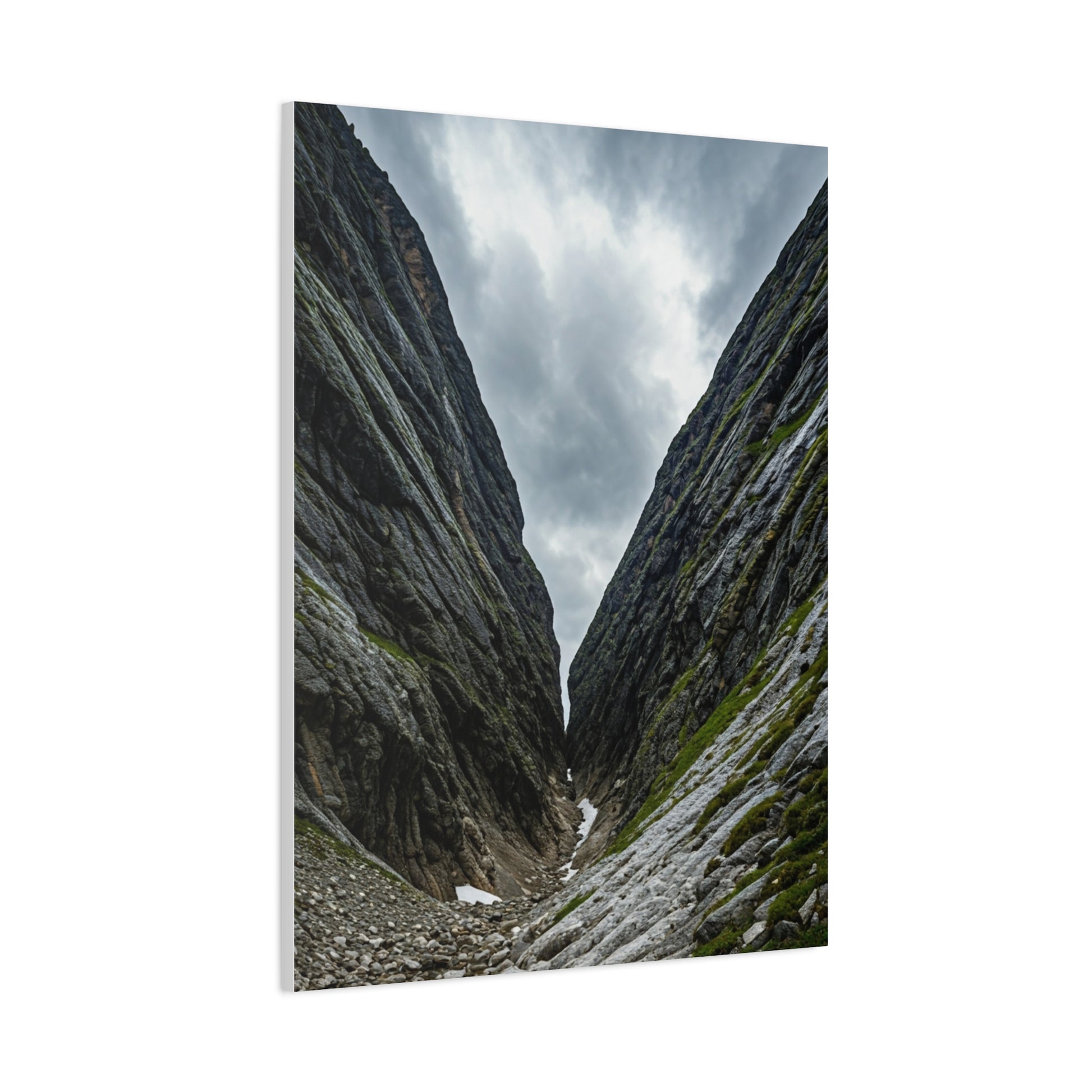 This dramatic wall art captures a narrow mountain pass carved between towering rock faces under a cloudy sky. The deep perspective and rugged textures emphasize scale, isolation, and the raw power of nature. Subtle moss and stone details add realism while the composition naturally pulls the viewer forward, creating a feeling of exploration and resilience. This artwork is ideal for modern, minimalist, and adventure-inspired interiors, making a bold yet calming statement in living rooms, offices, or entryways. A striking canvas print for nature lovers and mountain landscapes.