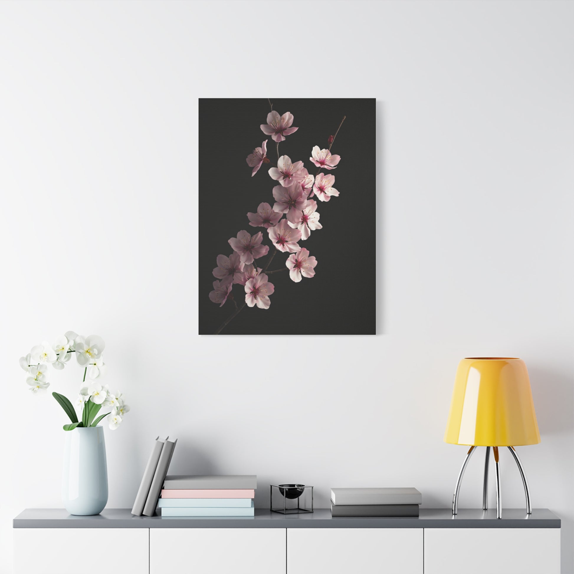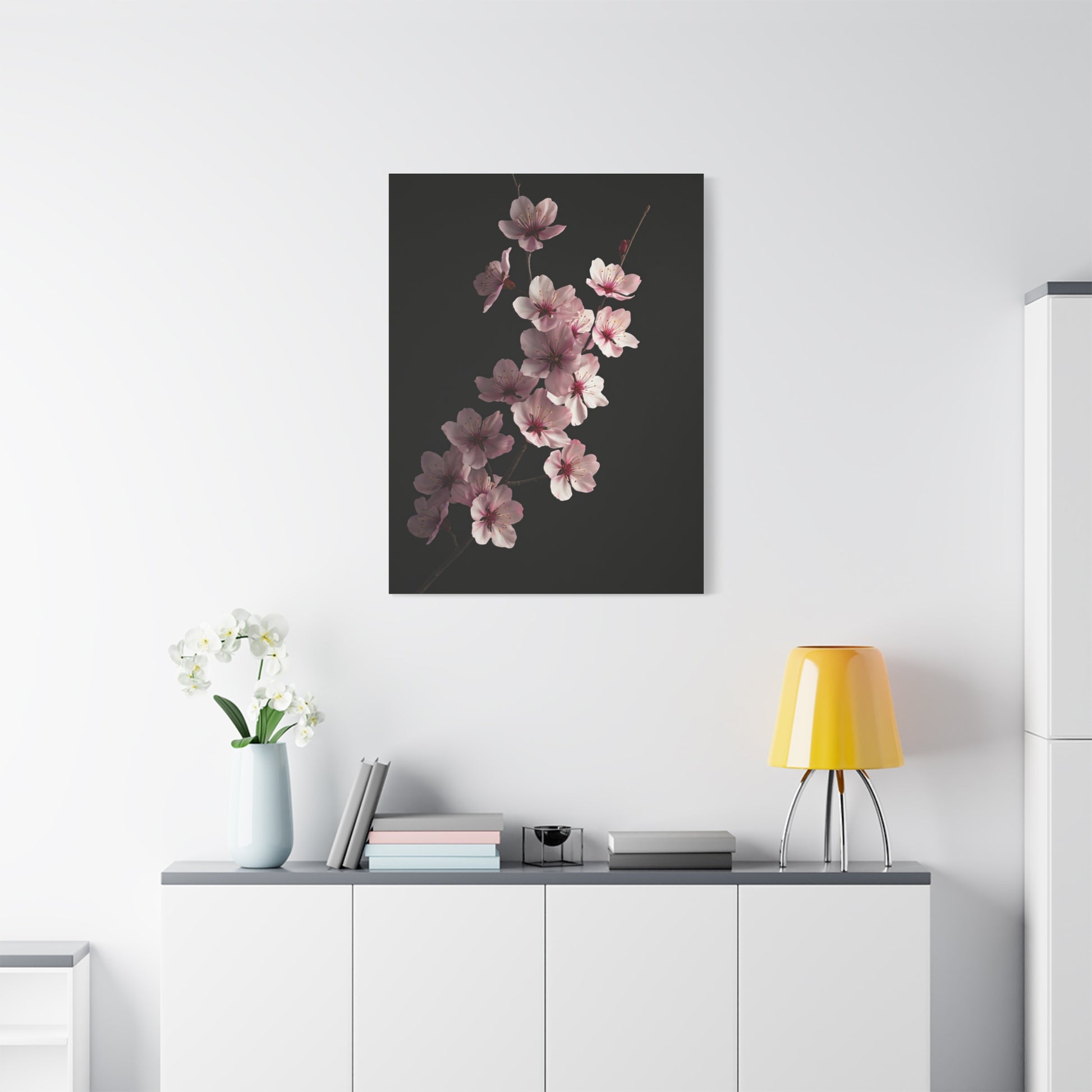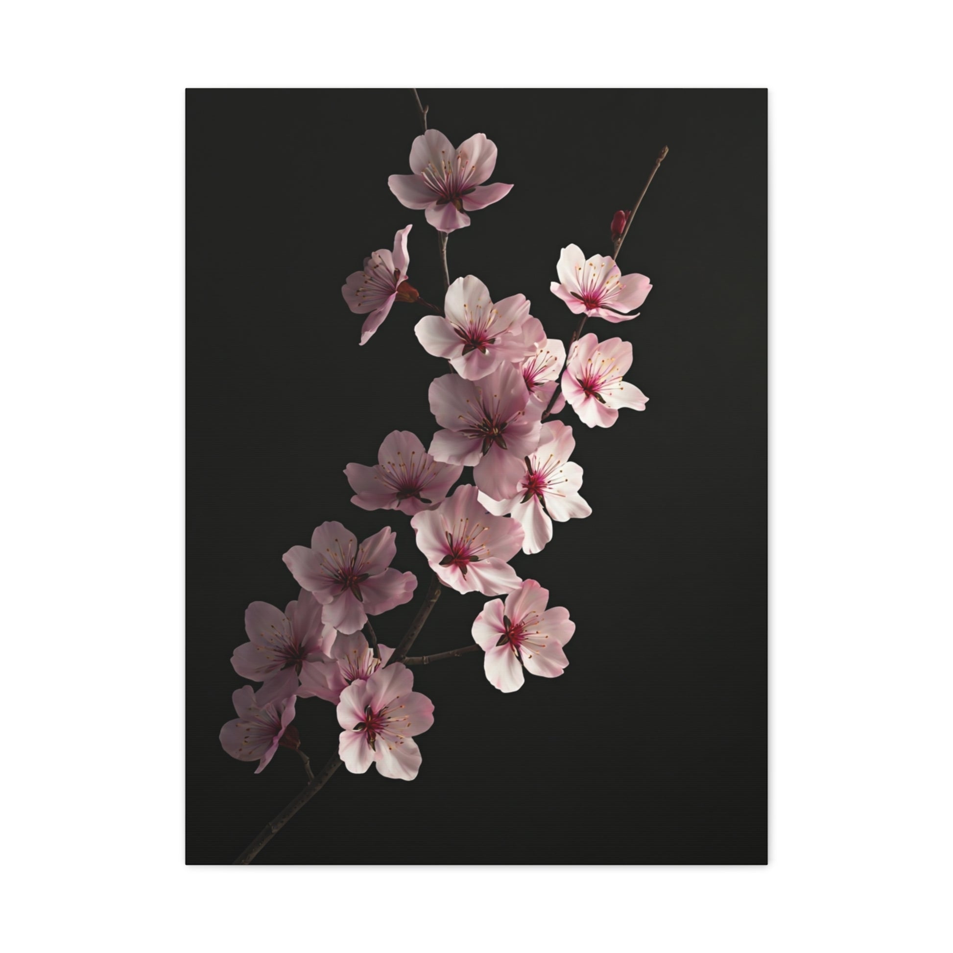 A graceful sakura branch emerges from deep shadow, its delicate pink blossoms glowing softly against a dramatic dark background. Each flower reveals fine detail in the petals and stamens, creating a refined botanical composition. The contrast between light blossoms and the moody backdrop gives the artwork a luxurious gallery aesthetic. Subtle lighting highlights the natural elegance of cherry blossoms in full bloom. The composition feels minimal yet sophisticated, celebrating the quiet beauty of spring. Perfect for interiors seeking refined floral art with a calm and dramatic presence.