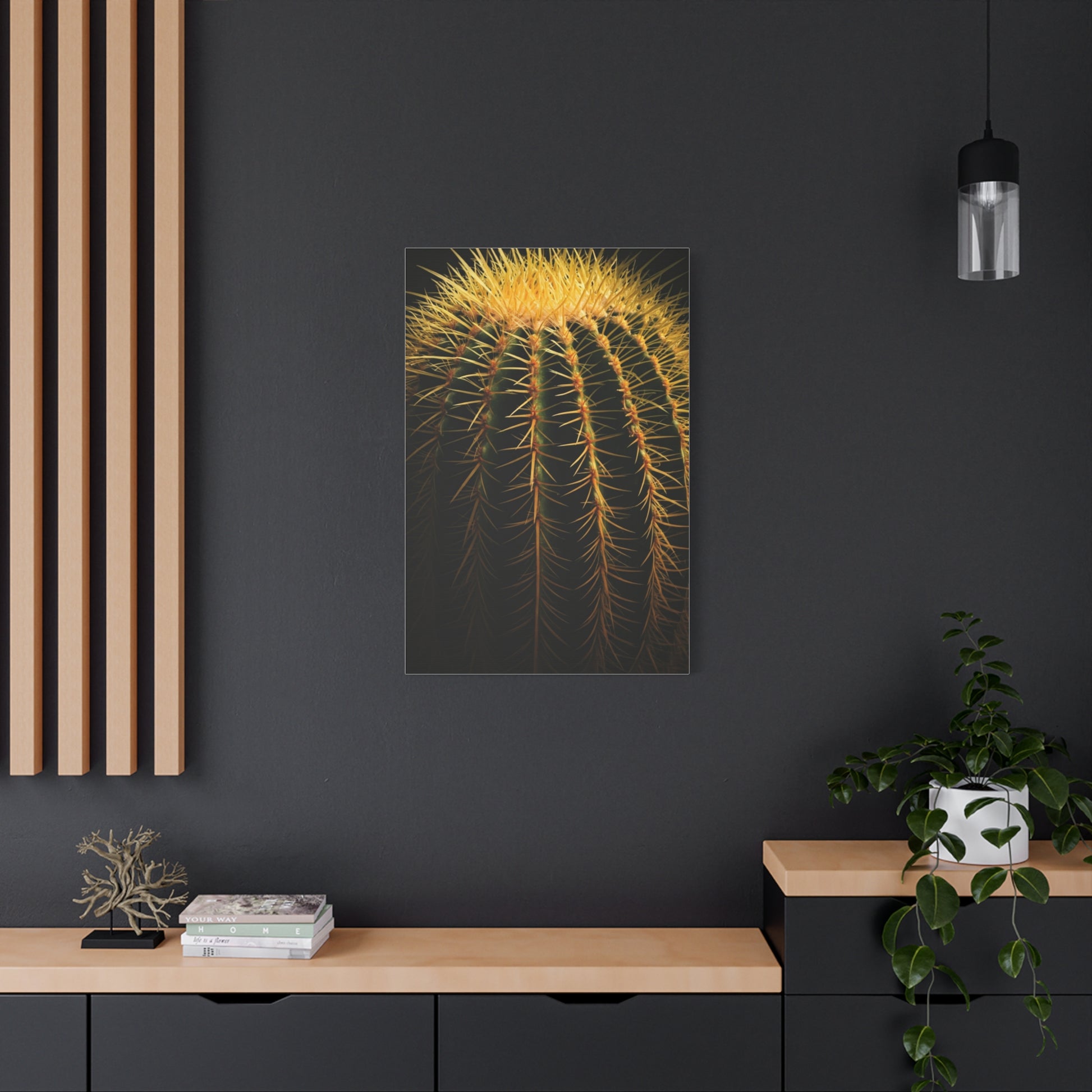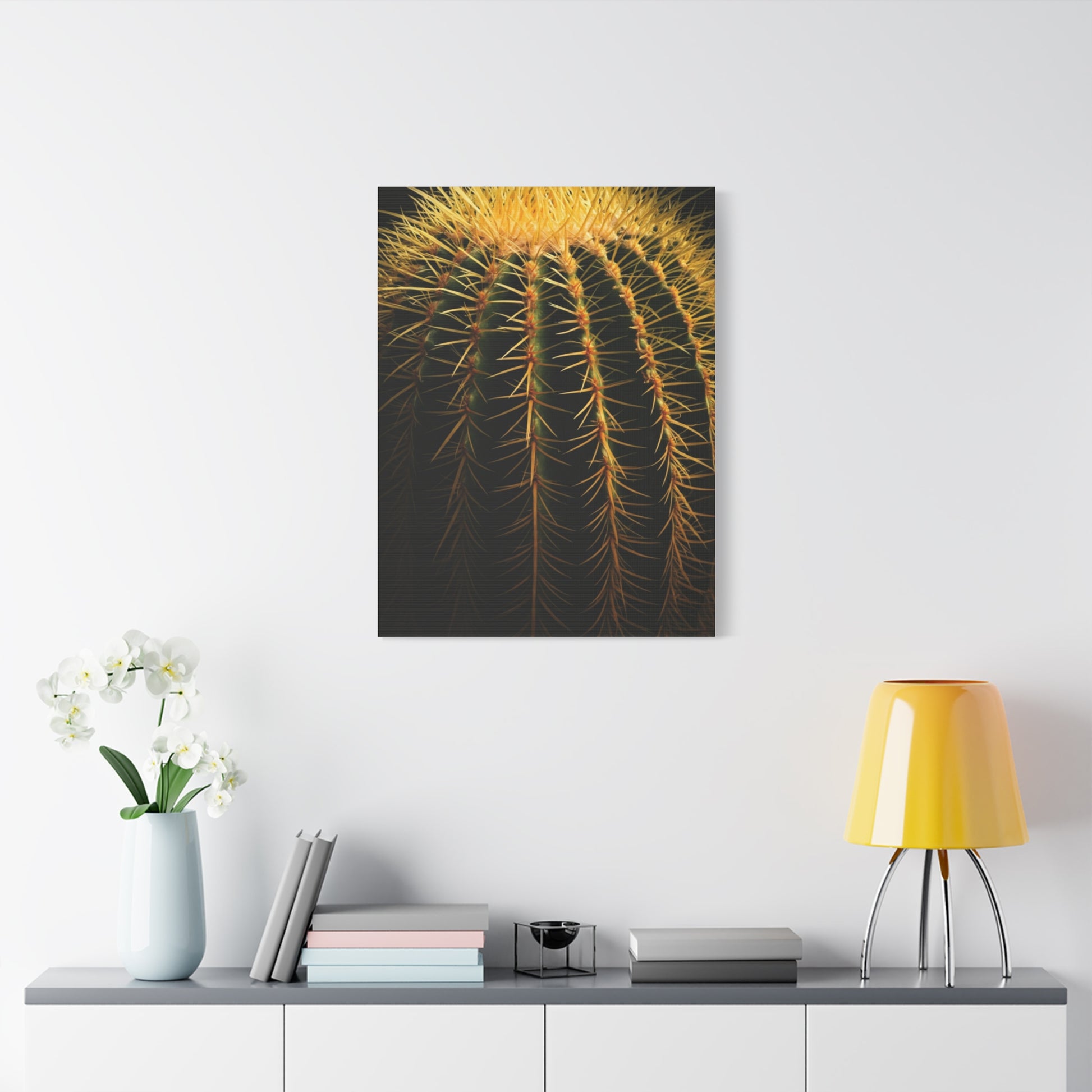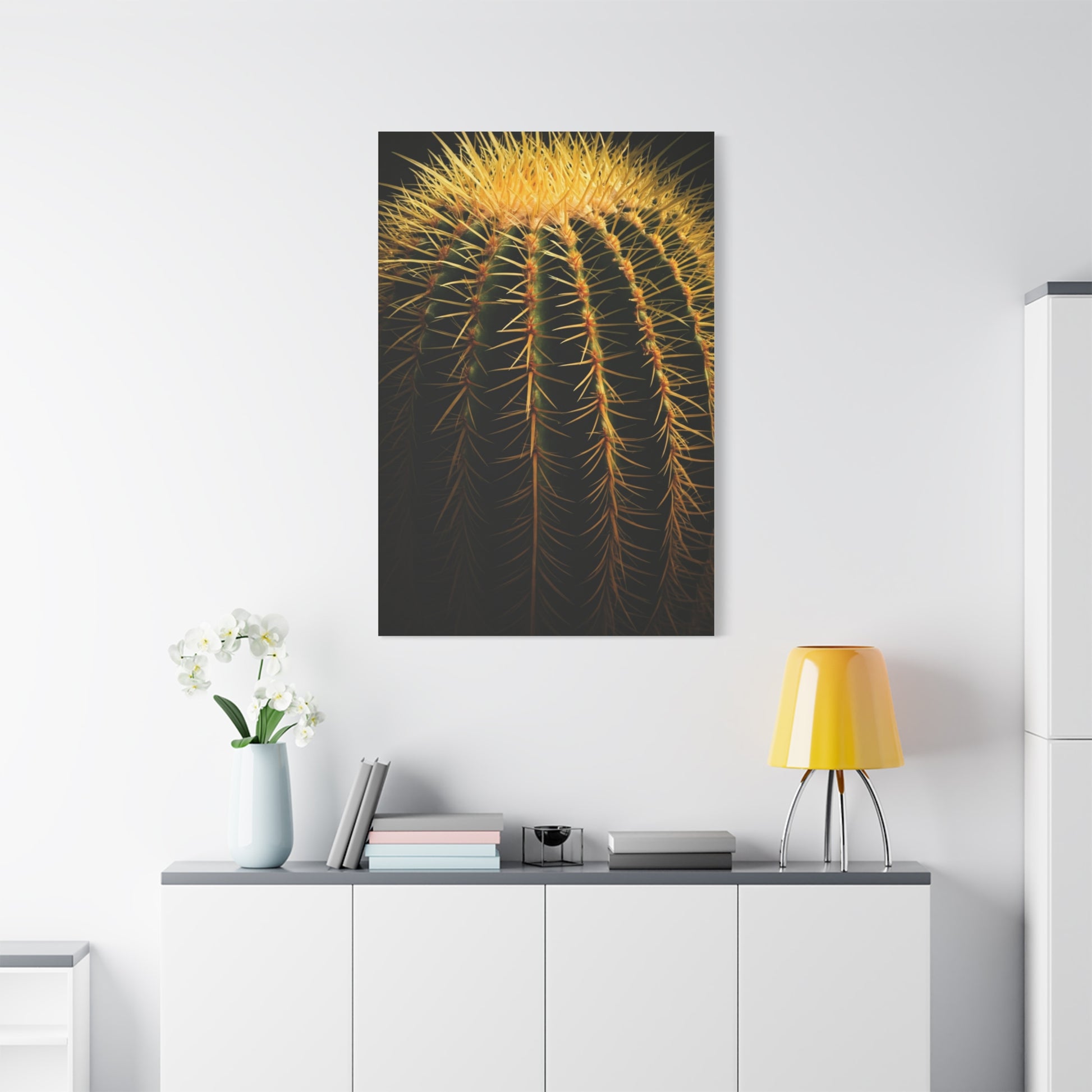 A captivating close-up of a desert barrel cactus reveals its mesmerizing natural symmetry and intricate network of spines. The vertical ribs create rhythmic patterns, while hundreds of golden needles radiate outward like delicate armor. Warm highlights and deep shadows emphasize the cactus’s rugged texture and structural elegance. The dark, minimal background allows the cactus to stand out as a natural sculpture. Ideal for modern desert-themed décor, botanical art enthusiasts, and minimalist nature interiors.