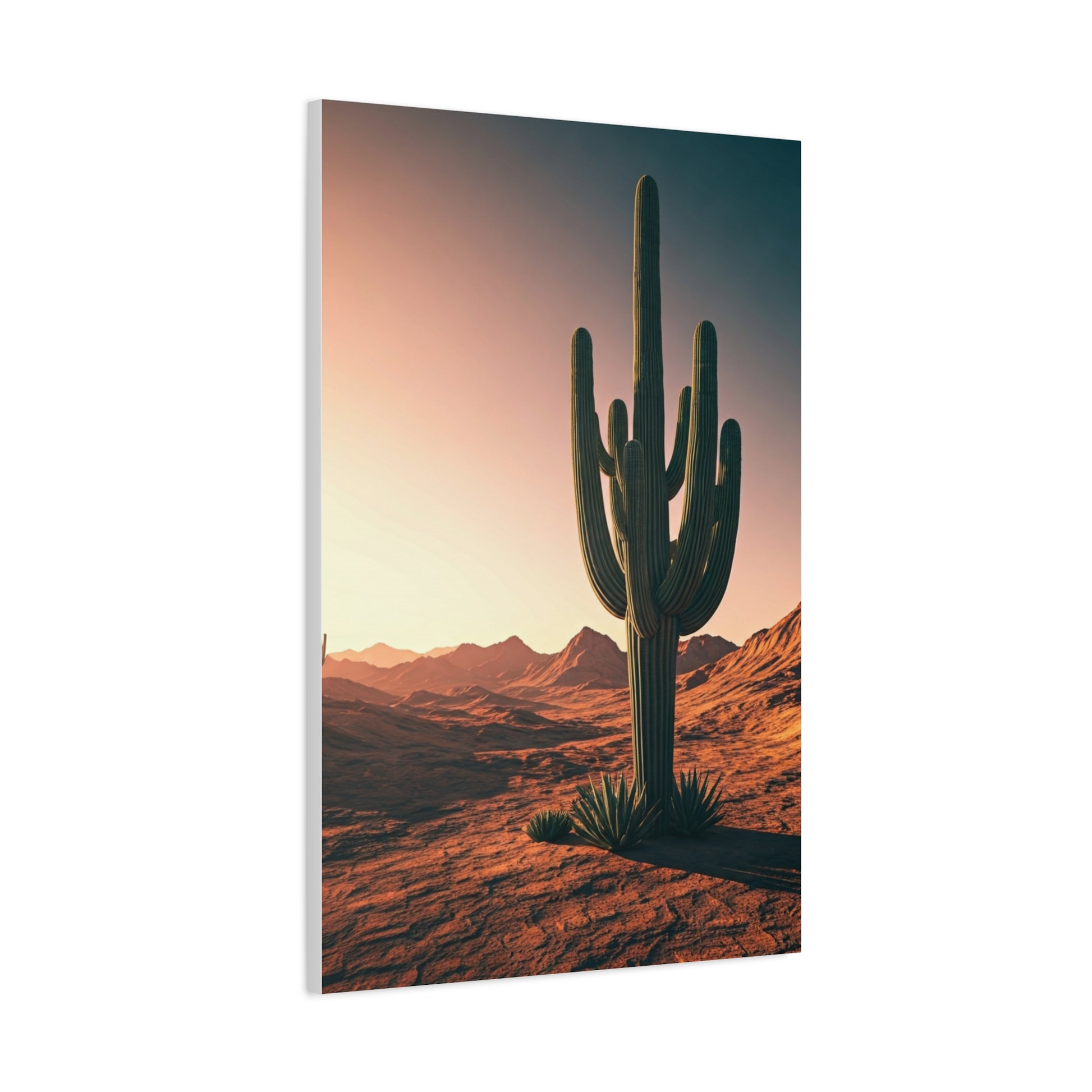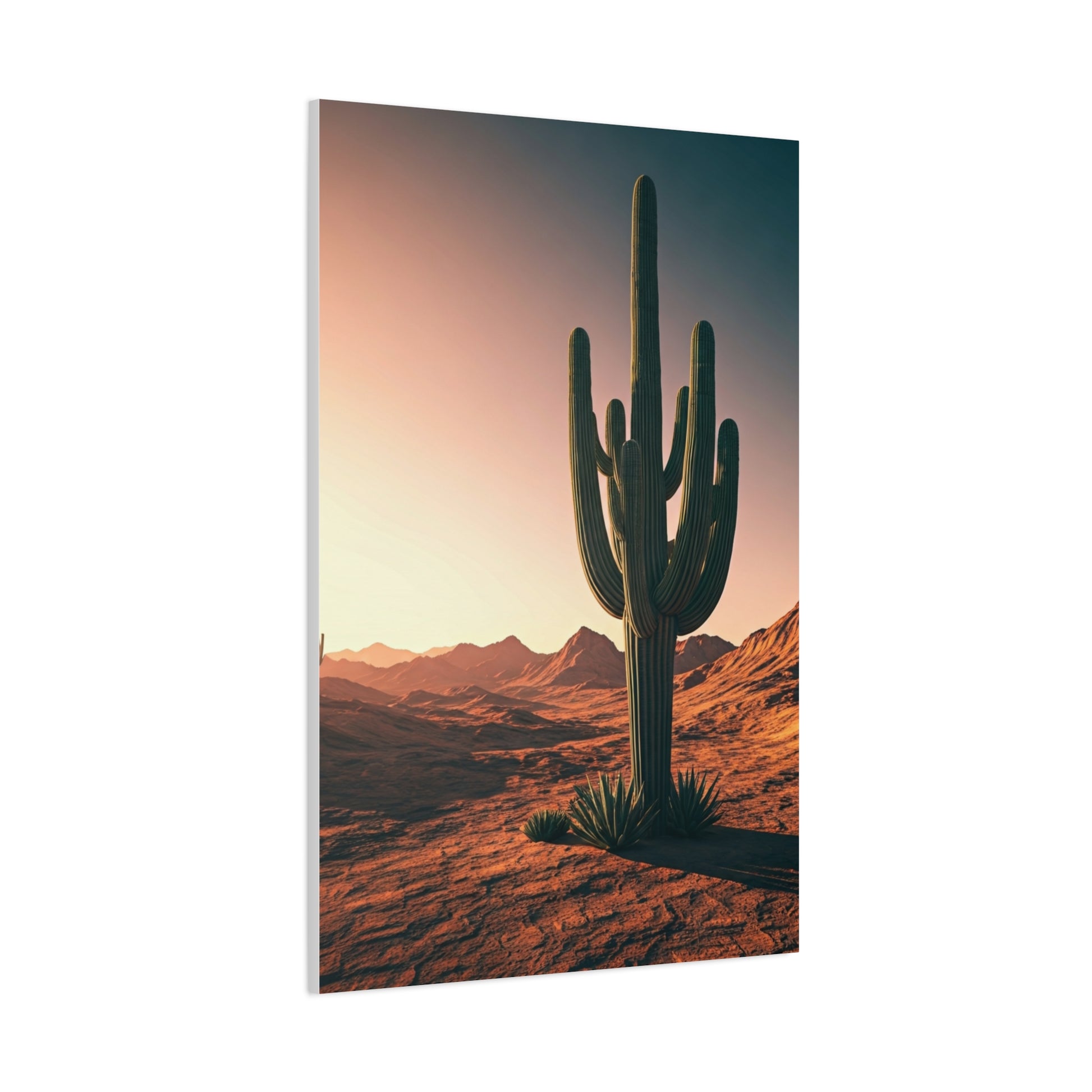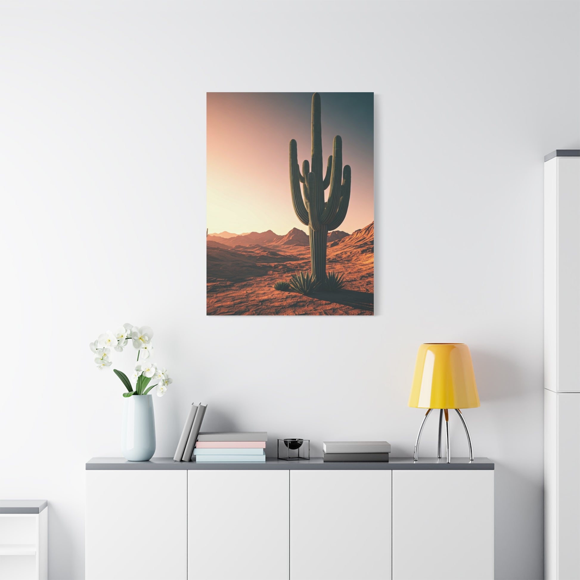 A solitary saguaro cactus rises from rolling desert hills under a glowing golden sky. Warm sunlight stretches across the landscape, highlighting the cactus’s tall silhouette and iconic branching arms. The smooth desert terrain creates a minimalist composition with strong natural lines. Subtle gradients of warm light and shadow bring depth to the scene. The image reflects the peaceful vastness of the American Southwest. A timeless desert landscape ideal for modern wall décor.