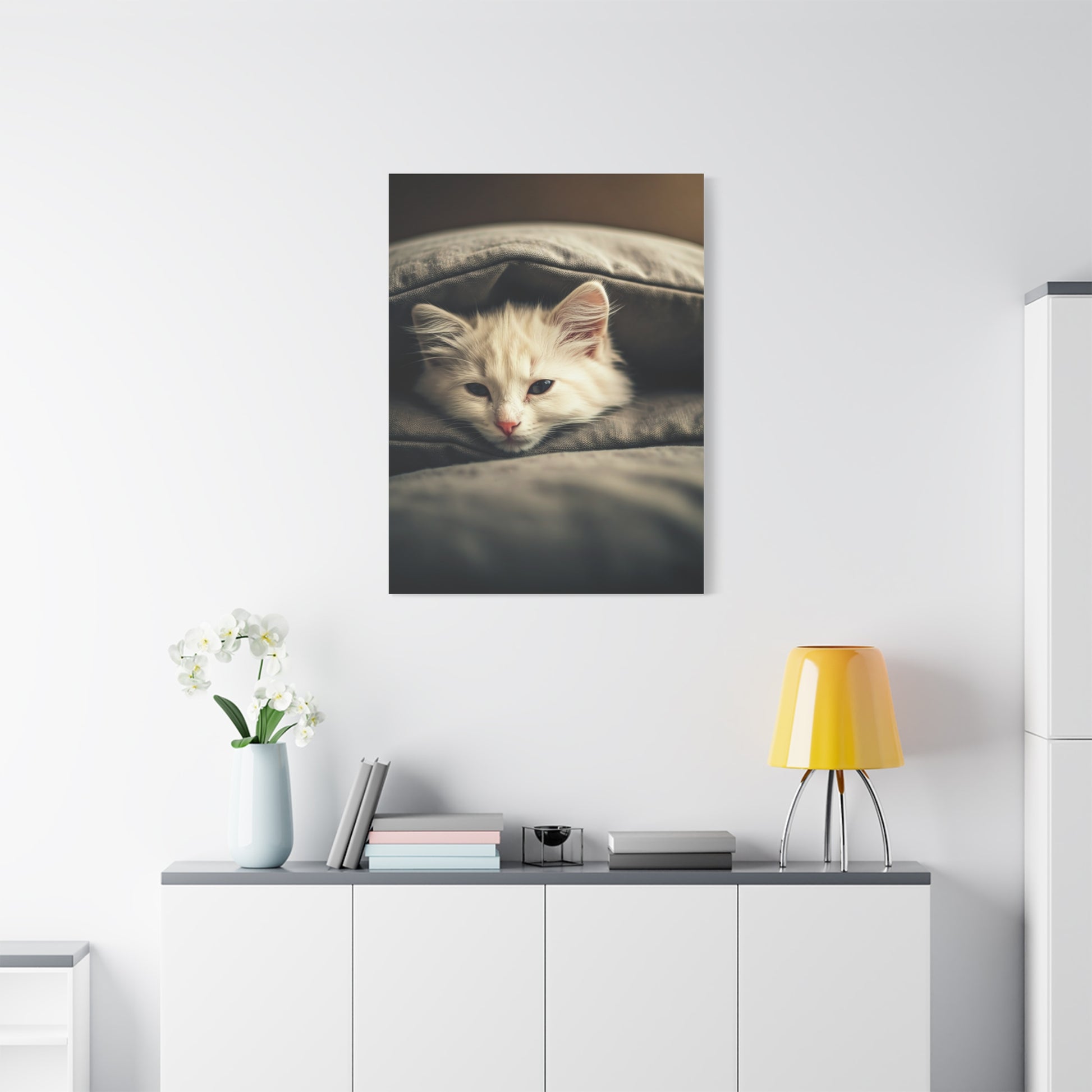 Peaceful Resting Kitten Wall Art & Canvas Prints capture a tender moment of calm as a soft white kitten rests quietly between plush cushions. The gentle lighting, muted tones, and relaxed expression create a soothing and intimate atmosphere that instantly adds comfort to any space. This artwork is perfect for bedrooms, nurseries, reading corners, or cozy living areas where warmth and tranquillity are essential. The close framing highlights the kitten’s delicate features and serene mood, making it especially appealing to cat lovers and fans of comforting, minimalist décor. Printed using premium-quality materials and high-resolution inks, this wall art delivers fine detail, soft textures, and long-lasting colour for a timeless and peaceful visual experience.