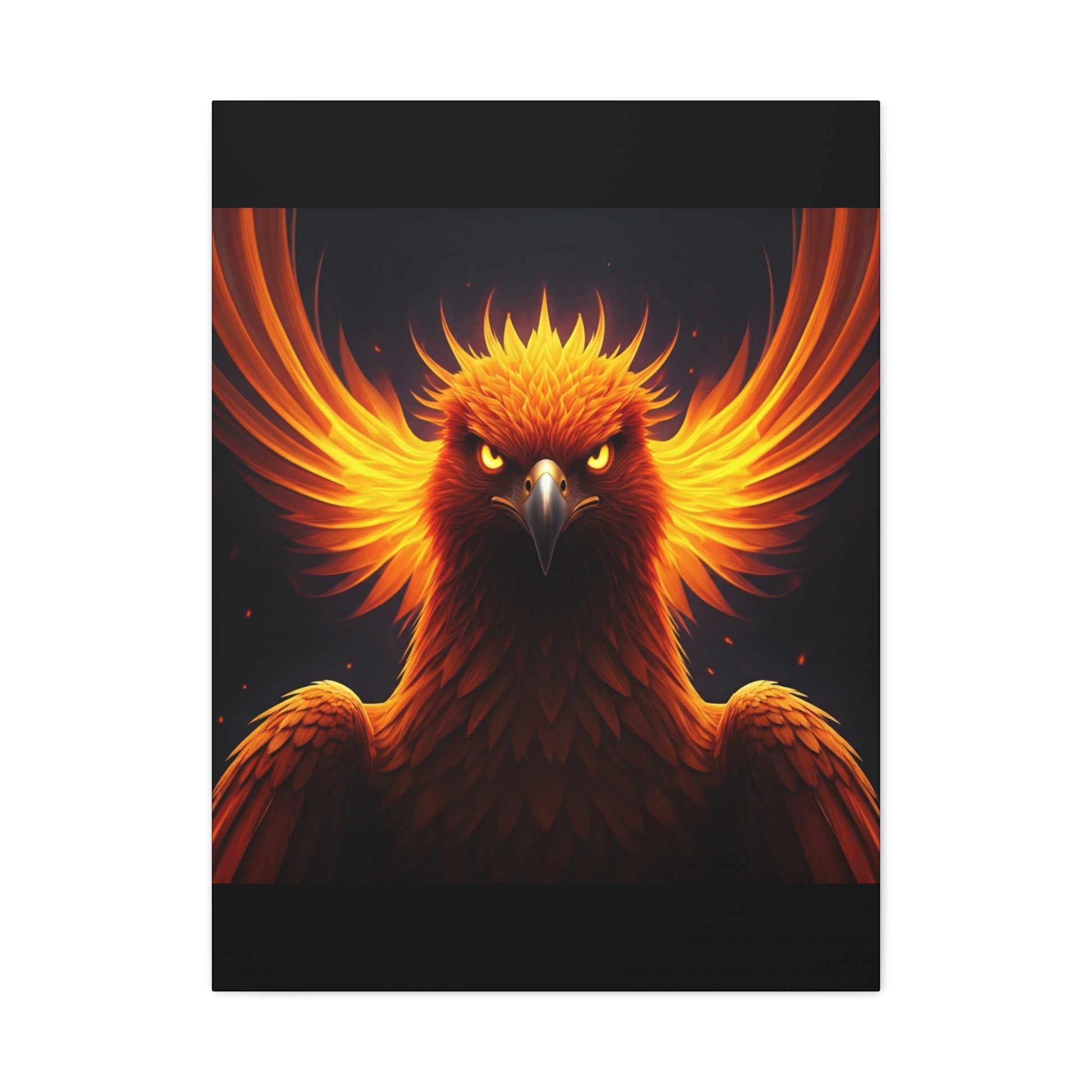 This powerful canvas depicts a majestic phoenix rising with wings of fire spread wide, glowing with intense orange and gold flames. The sharp gaze, radiant feathers, and dark background create a dramatic contrast that symbolizes rebirth, strength, and unstoppable energy. Perfect for statement walls, modern interiors, studios, or motivational spaces, this artwork brings bold symbolism and fiery elegance to any room.