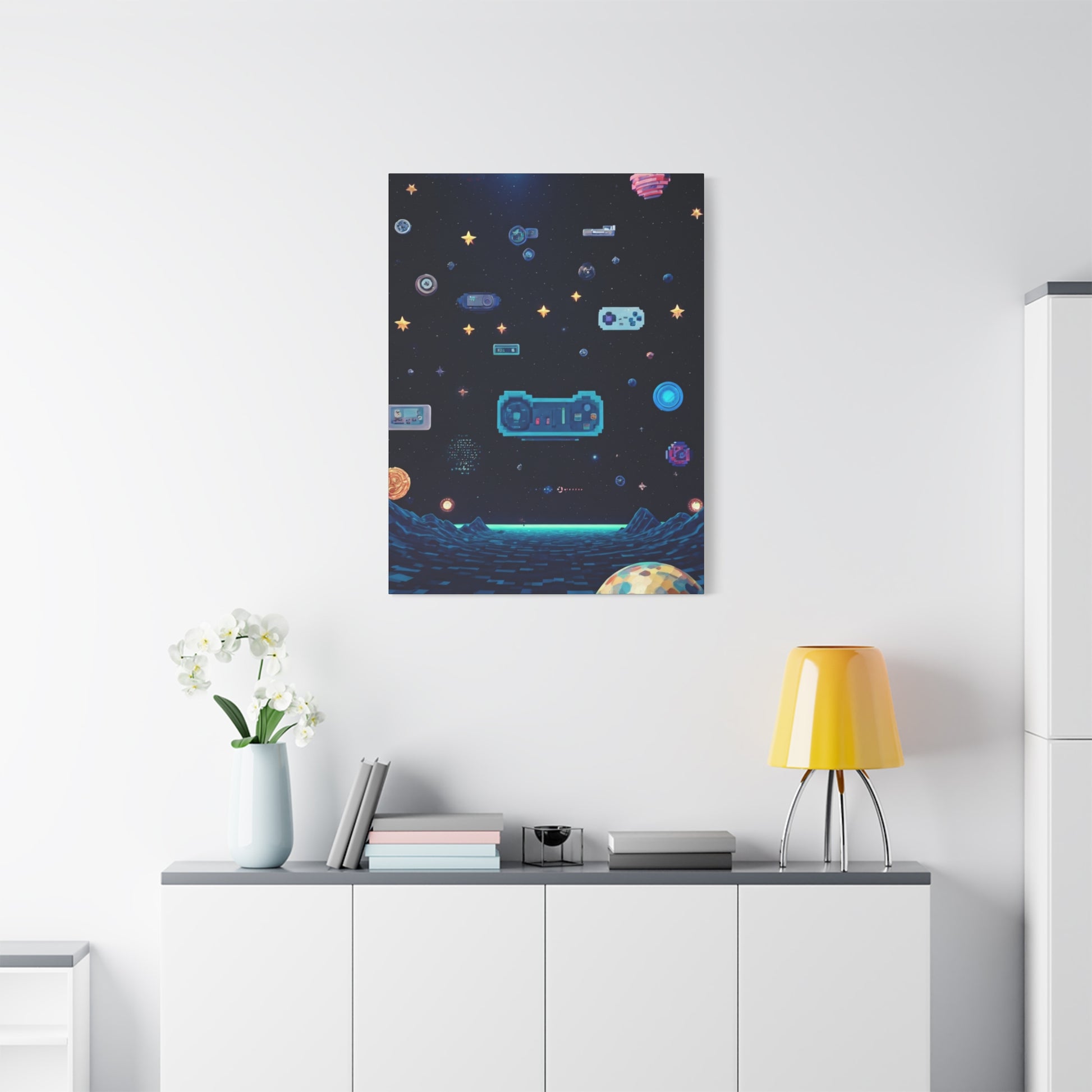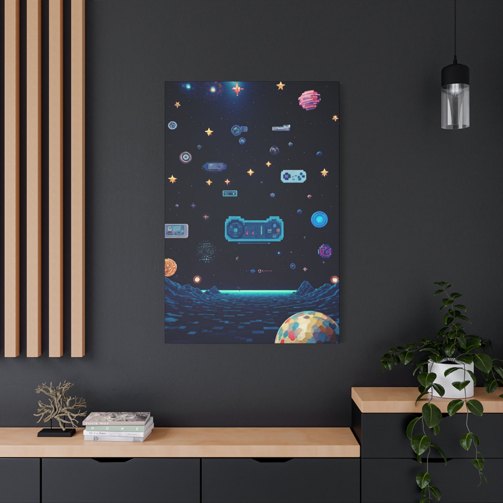 This vibrant wall art showcases a pixel-style outer space scene filled with retro gaming elements, stars, planets, and digital interface designs. Inspired by classic arcade visuals, the composition blends nostalgia with futuristic imagination. The bold contrast between deep space tones and glowing pixel details makes this artwork visually dynamic and engaging. Ideal for game rooms, bedrooms, offices, or creative studios, this canvas print celebrates gaming culture, technology, and sci-fi aesthetics in a playful yet modern way.
