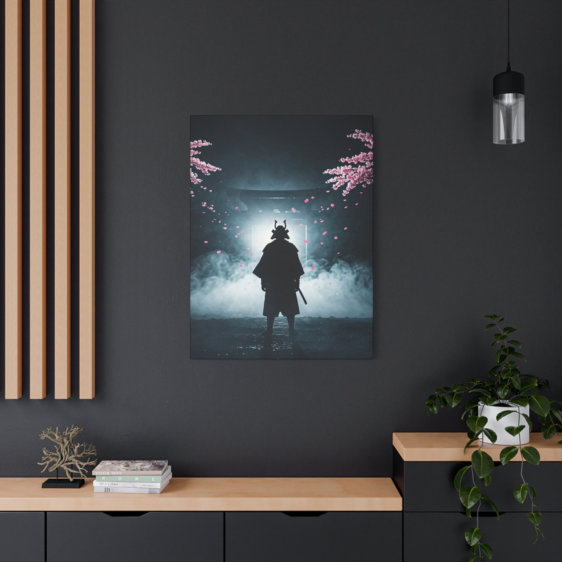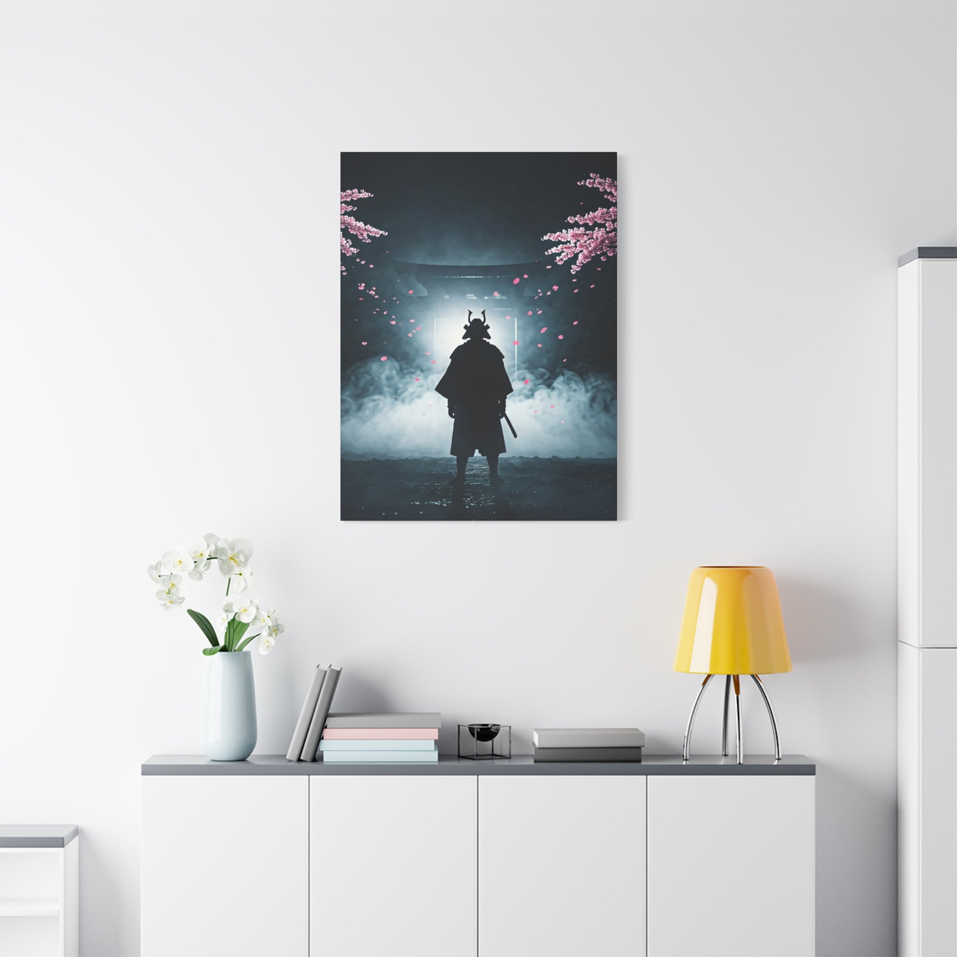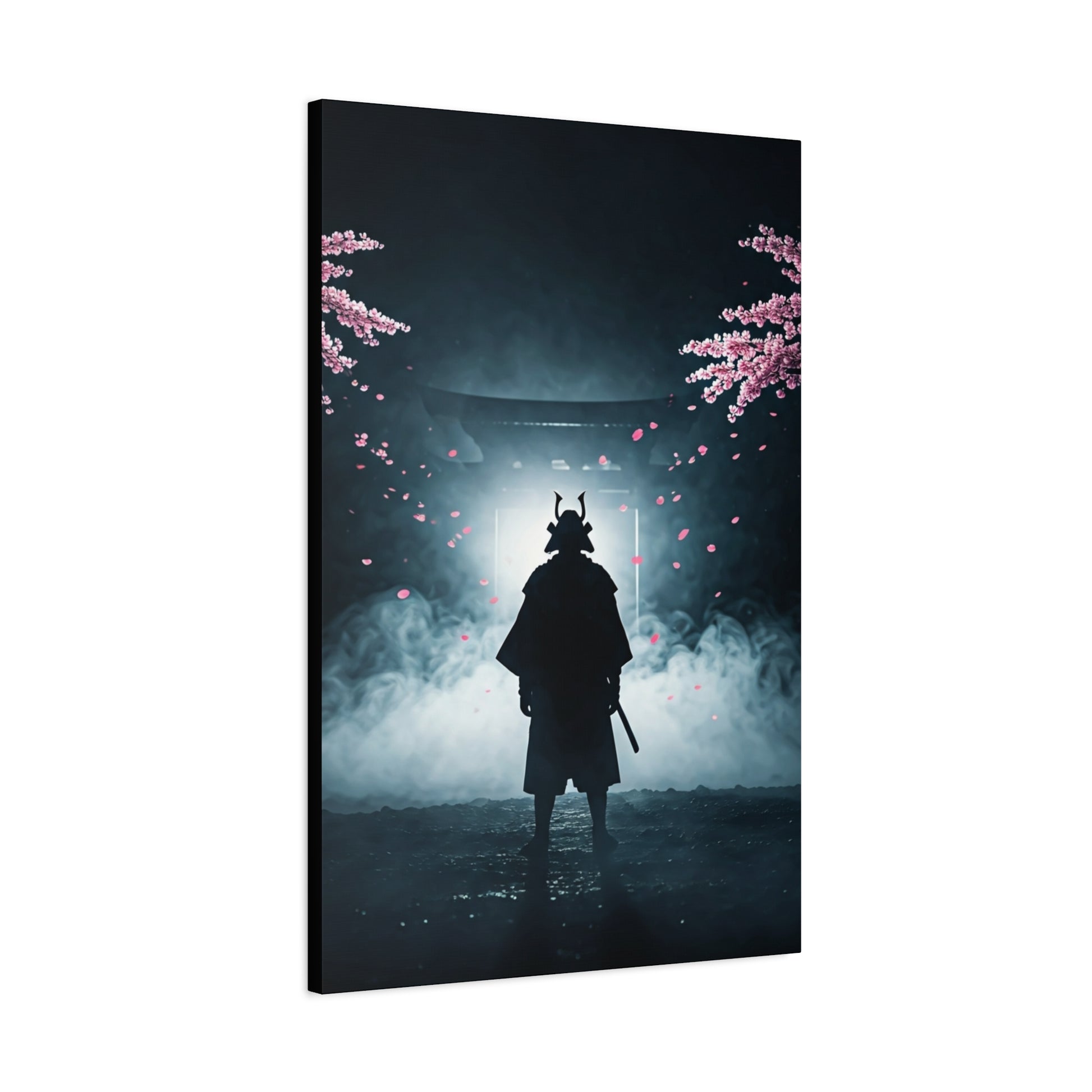 This cinematic wall art portrays a lone samurai standing before a torii gate, surrounded by drifting fog and falling cherry blossom petals. The silhouette, armor details, and atmospheric lighting evoke honor, discipline, and quiet strength. The contrast between darkness and soft floral elements creates a powerful balance of intensity and serenity. Ideal for modern interiors, studios, or statement walls, this canvas print brings timeless warrior symbolism and dramatic visual storytelling into any space.
