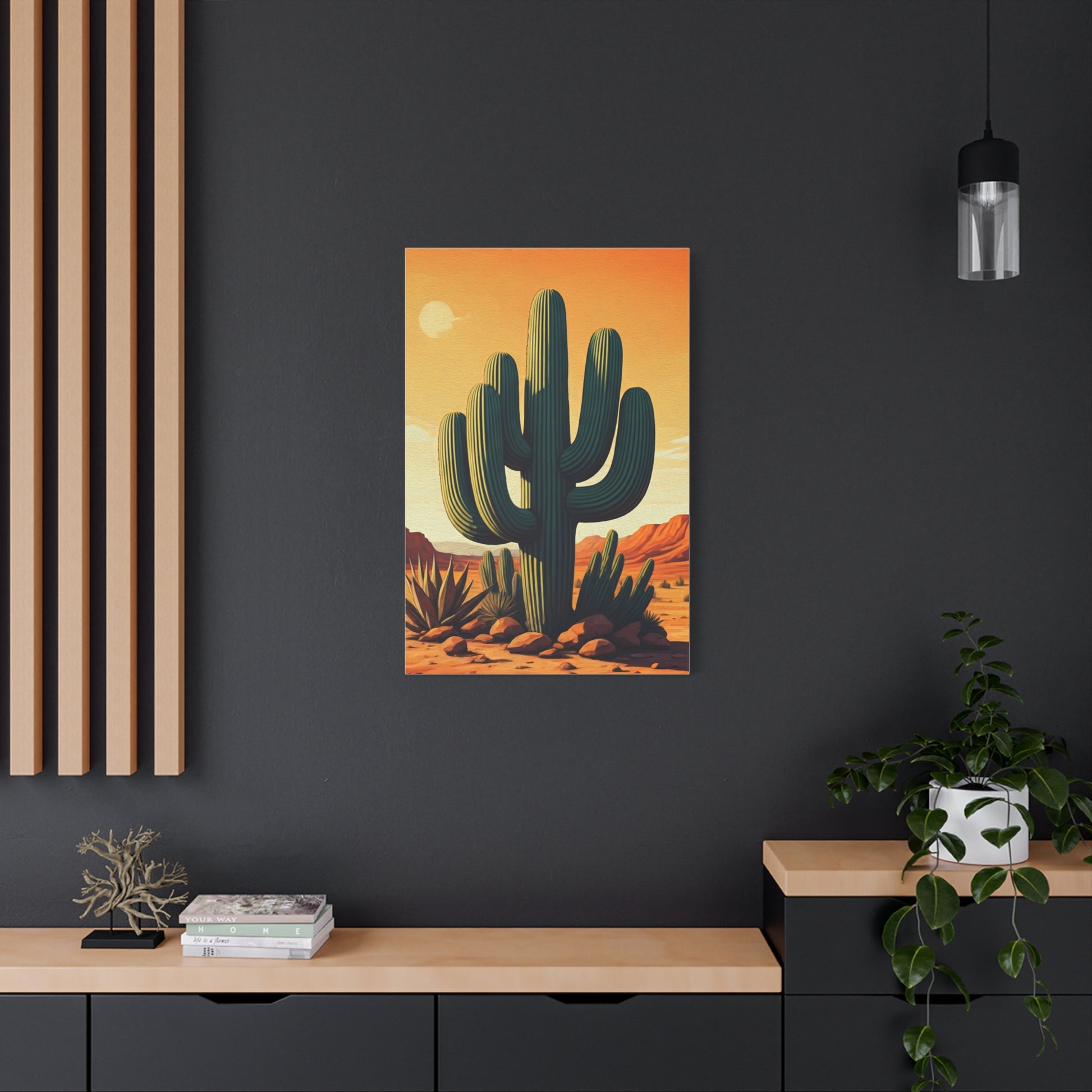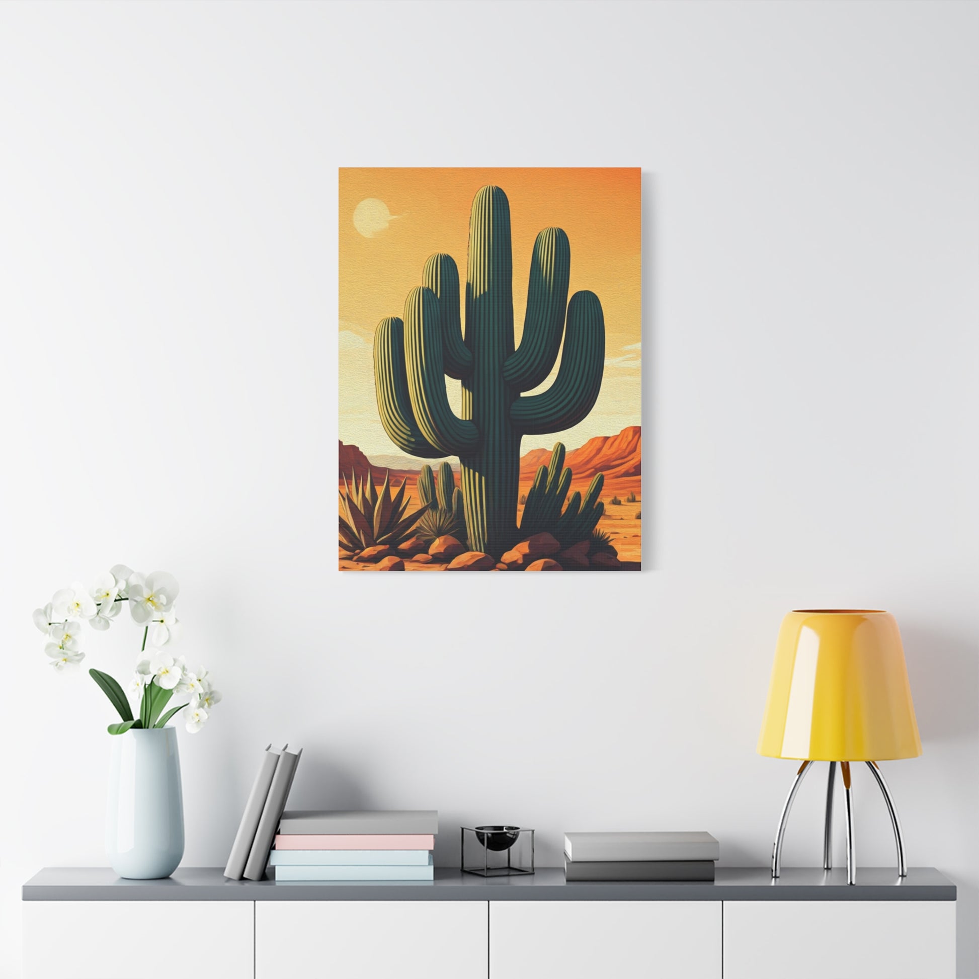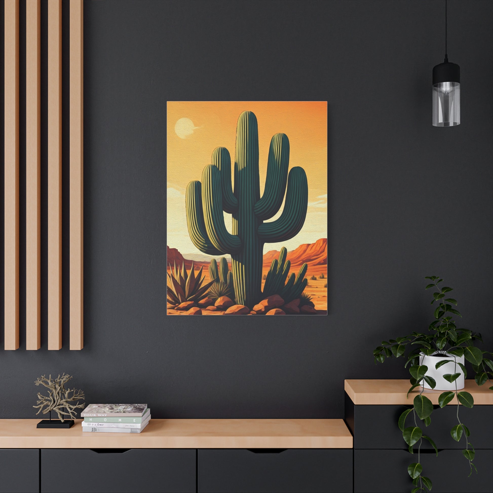 Bathed in warm desert sunlight, a towering saguaro cactus dominates this serene Southwestern landscape. Rounded desert rocks and agave plants frame the foreground, adding natural contrast to the tall cactus silhouette. In the background, soft red desert mountains stretch beneath a golden sky. The gentle lighting and smooth illustration style create a calm and inviting desert atmosphere. The scene captures the quiet strength of desert ecosystems and iconic cactus forms. A beautiful statement piece for modern desert themed décor.